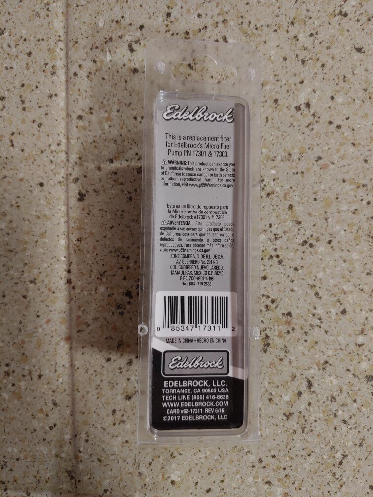 Brand new, in package Edelbrock fuel filter. This is a replacement filter for edelbrocks micro fuel pump PN 17301 and 17303.