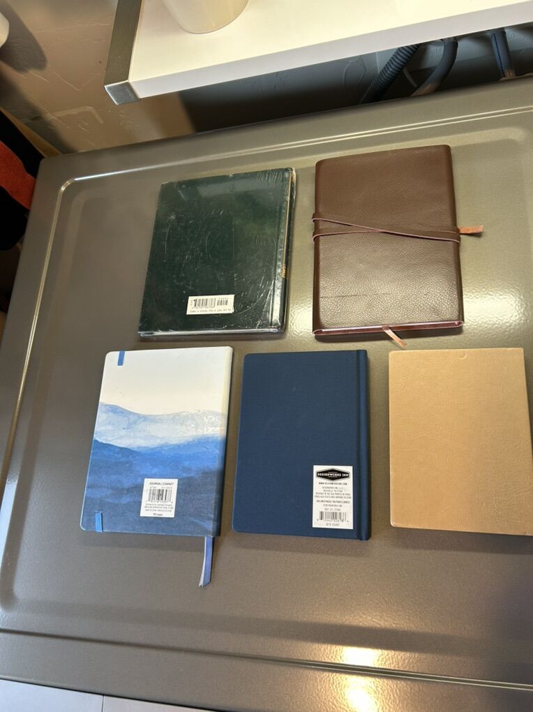 VenmoNew 5 journal assortment. All new, no writing. Green journal is sealed in plastic. Leather bound journal, cloth cover, embossed leather cover and cardboard cover with elastic. Clean smoke free. Cash or Venmo. Pick up from Alpine.