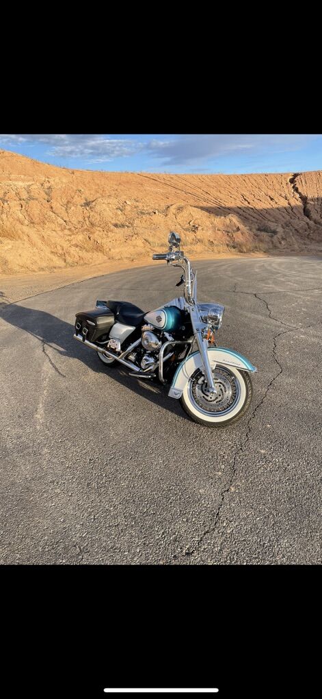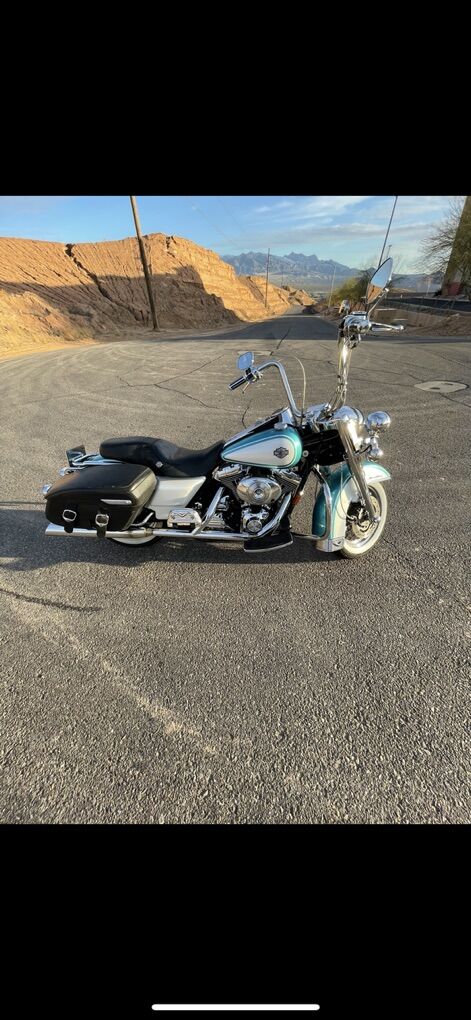 Harley Davidson Road King. -Comes with upgraded led lights -Ape hangers -Custom dual exhaust -Custom teal and white paint job -Air cooled twin cam 88 -Battery tender -Saddle bags for storage -Auxiliary switch for aftermarket speakers or lights -Upgraded suspension -Clean title in hand