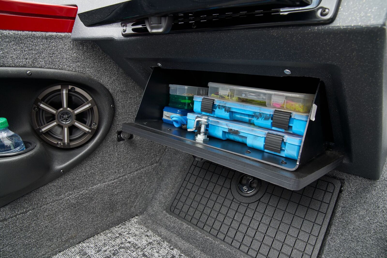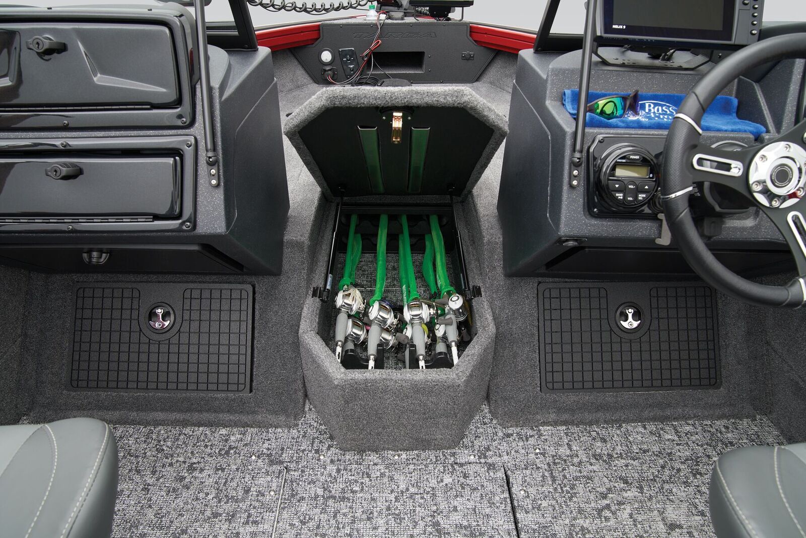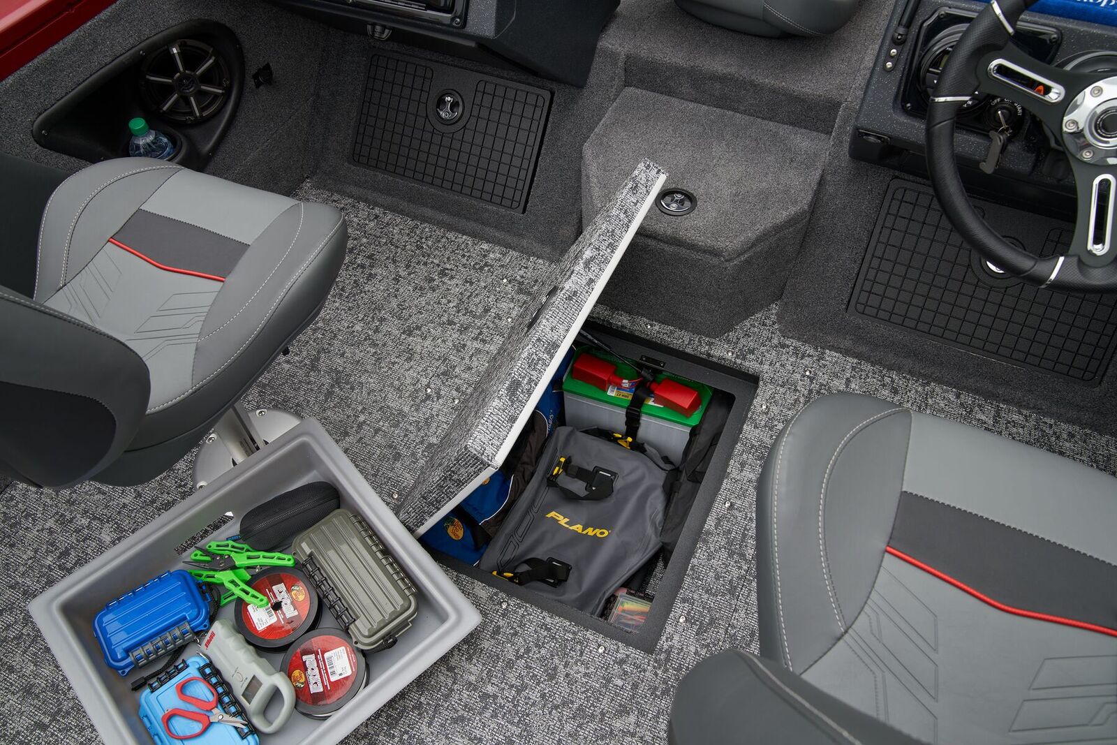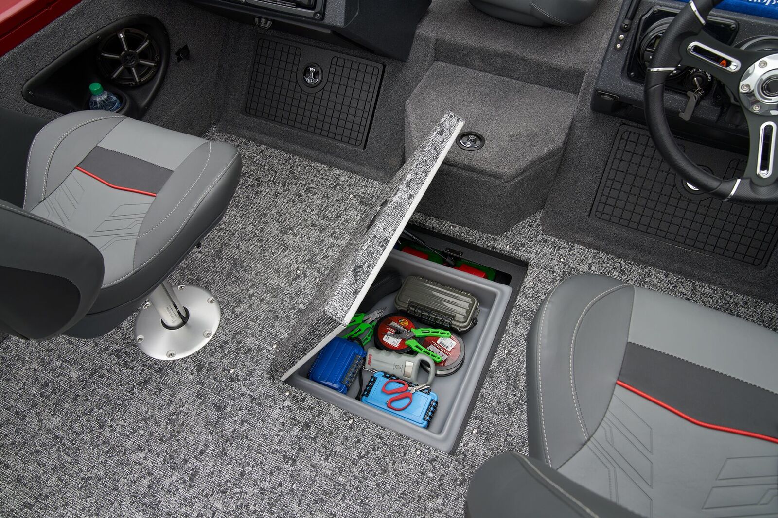 As you cruise through the waves, enjoy the convenience of the Lowrance® GPS system and Bluetooth® audio technology, allowing you to stay connected and entertained while on board. The walk-through windshield offers easy access to the bow seating area, where you can relax and take in the panoramic views of the water.