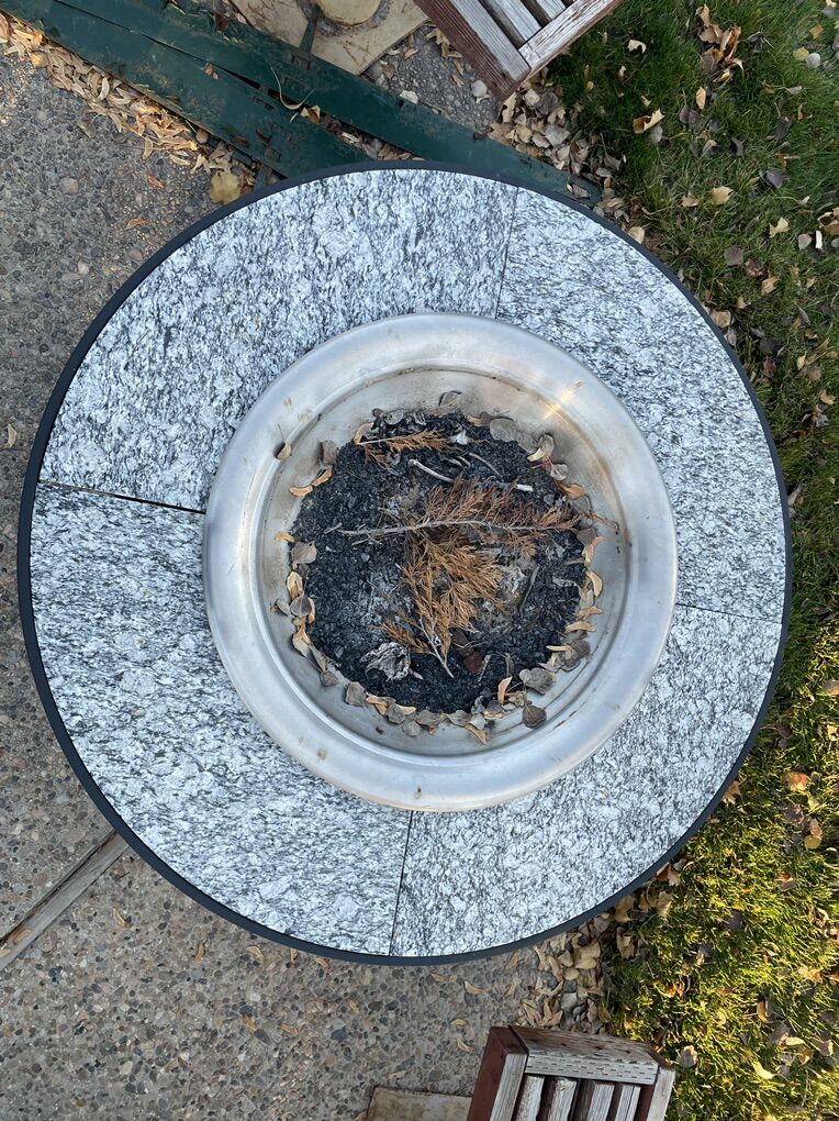 Outdoor fire table Round granite look table top Made for wood, Plumbed for gas (home made) Table 48 inches across, 22 inches high Fire pan, 29 inches diameter