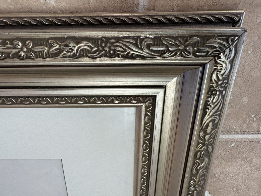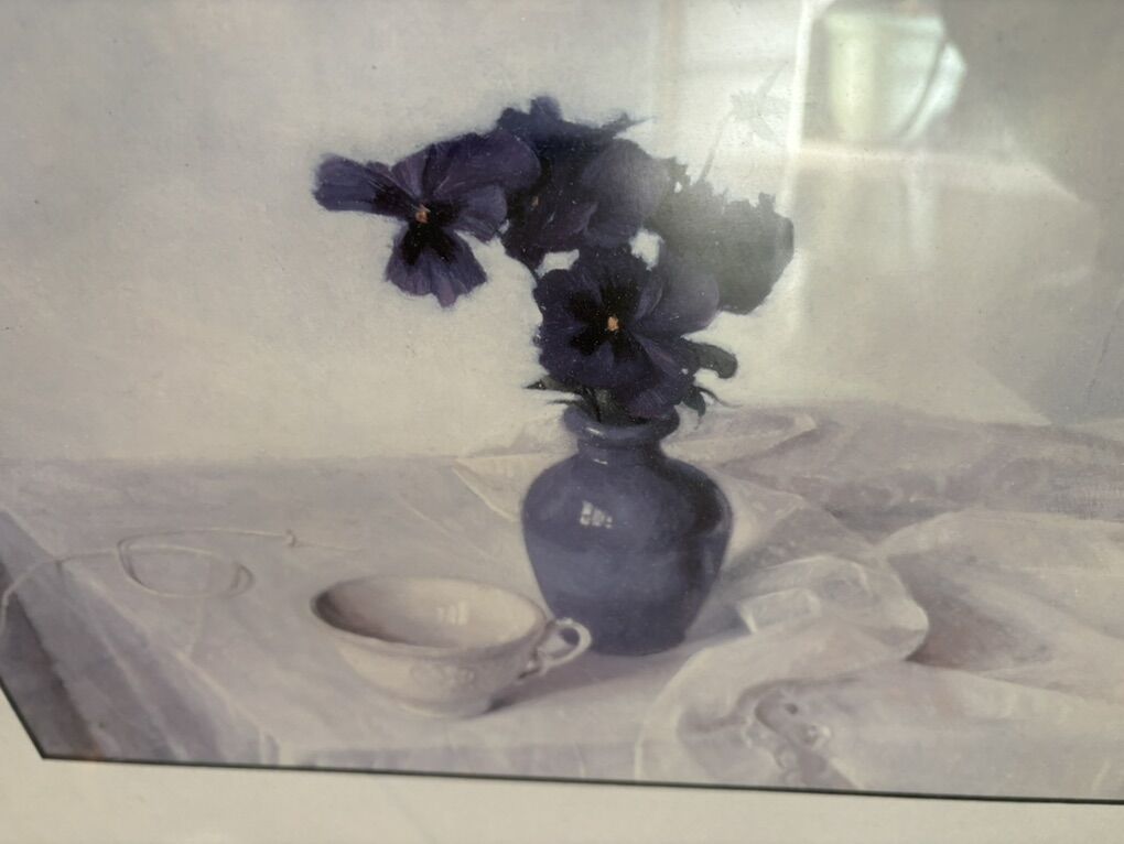 I have a print of Arthur Easton’s Pansies in a Blue Vase still life. It is in a beautiful silver frame. The frame is 24 1/2 inches wide and 30 1/2 inches tall. The back of the frame is marked Made in Mexico. The inside of the frame is 15 5/8 x 19 5/8. The opening in the mat board is 10 5/8 x 14 5/8. The last 6 pictures are other artwork that I have listed on KSL. See my other ads for jewelry, artwork, home decor and more.