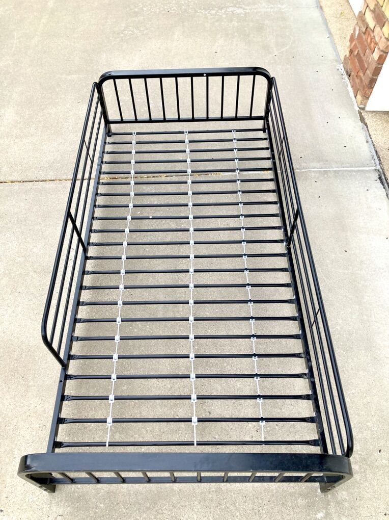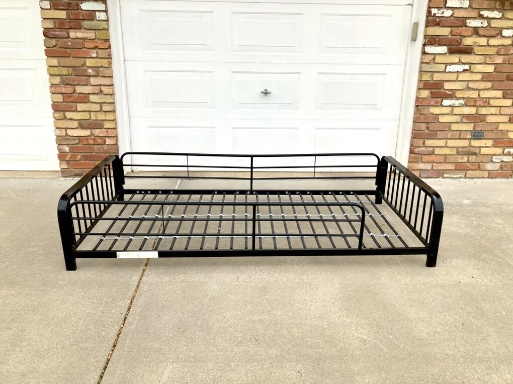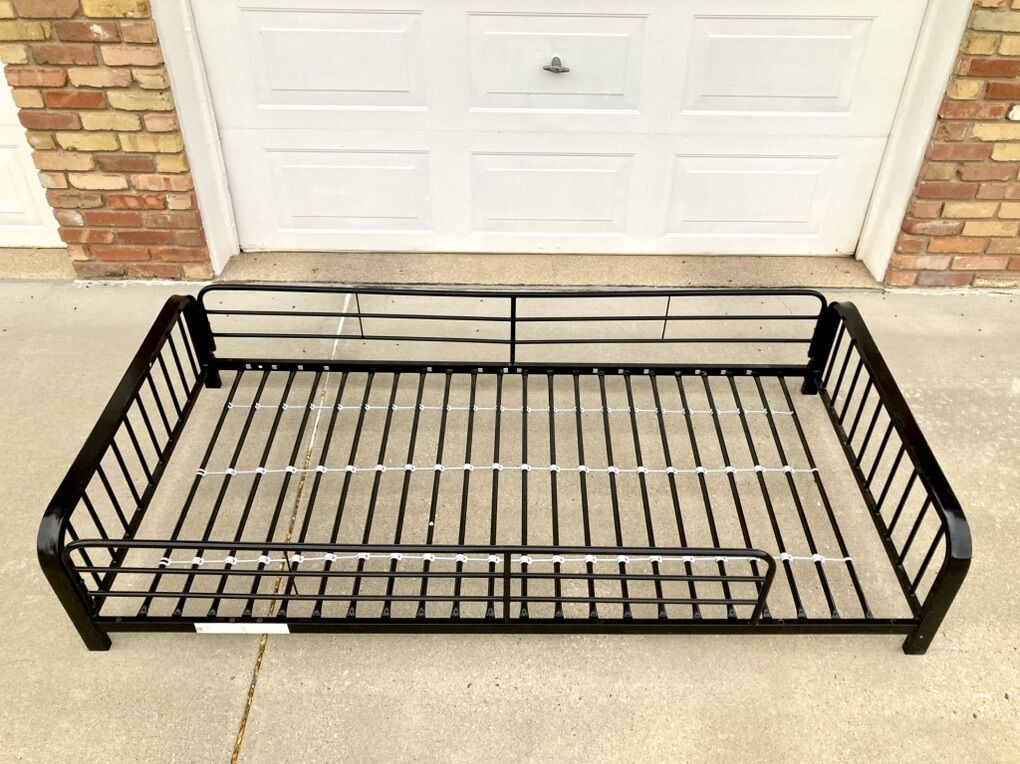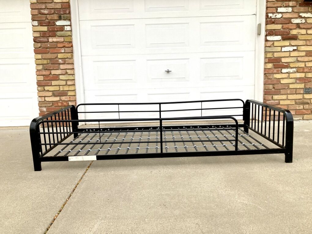 VenmoUp for sale is a black finished metal, extra long twin bed frame that was once the top of a bunk bed, complete with side rails.