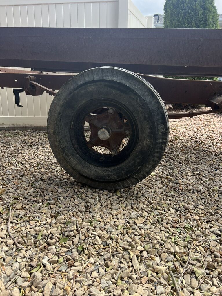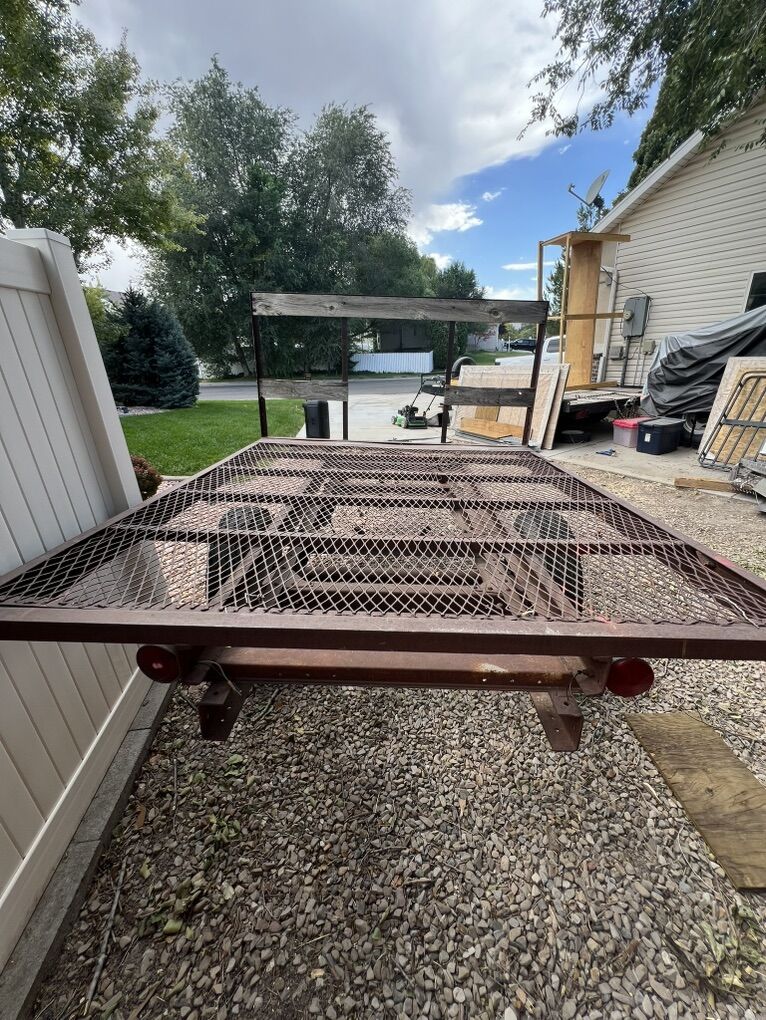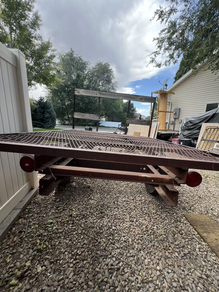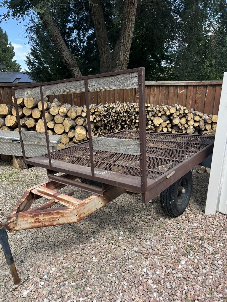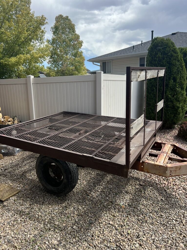 VenmoFlatbed trailer solid frame and components. Will need tires but will hold air good enough to get you home. I’d guess it weighs around 700lbs it’s not very heavy. I was going to clean it up and turn it into a sled/ dirtbike trailer but I’m too busy and it’s not high on the priority list
