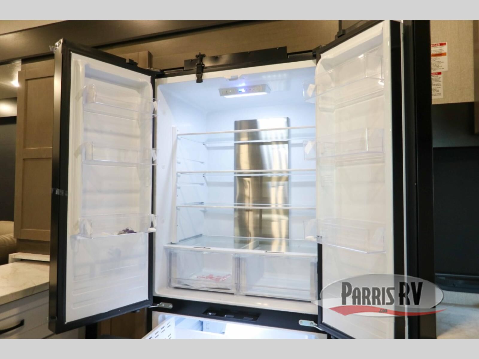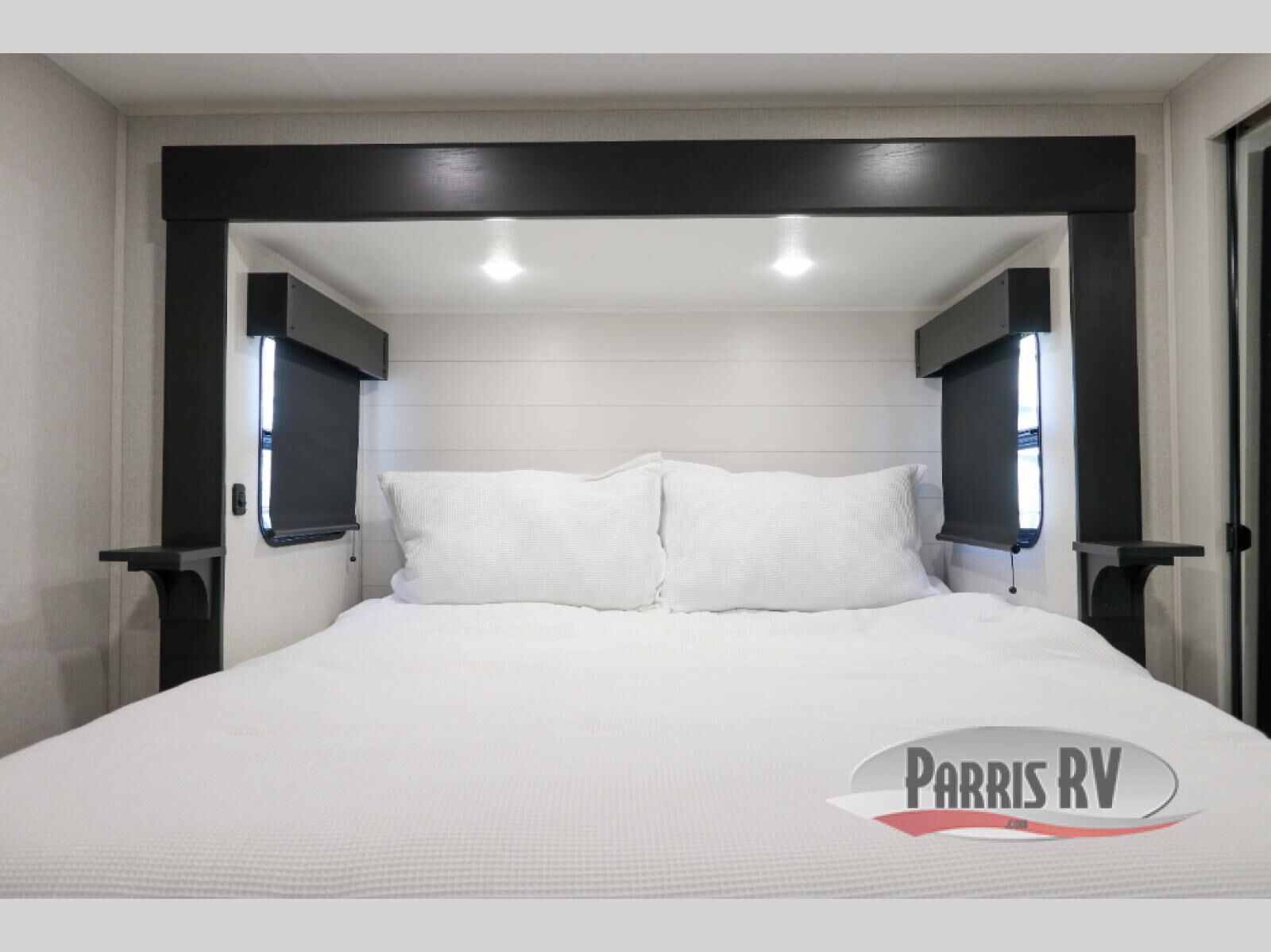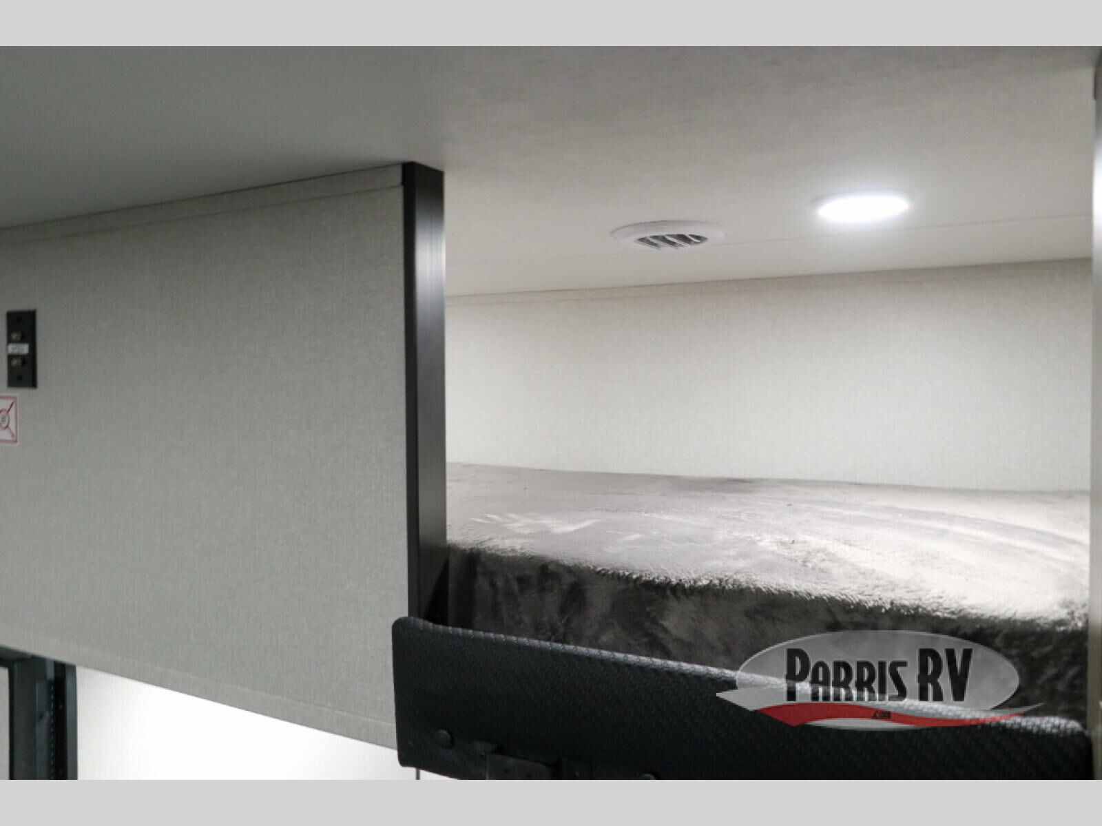 Get on the road with this toy hauler fifth wheel! The 14' garage is a playground for your toys, offering ample space for your ATV, motorcycle, or other gear. The loft above provides additional storage and an electric queen bed for a comfortable rest. The living room is a haven for relaxation, featuring an L-shaped sofa and a theater-style seat perfect for enjoying your favorite shows or movies on the TV. The kitchen is a culinary delight, equipped with a 12V refrigerator, microwave, overhead cabinets, and ample countertop space. The credenza with roll-out table is perfect for meal prep or serving, and the full bathroom provides a private space to freshen up, while the half bath option in the garage gives you more options. The cherry on top is that the front bedroom is a regal retreat, featuring a king bed, drawers, and a spacious walk-in closet.