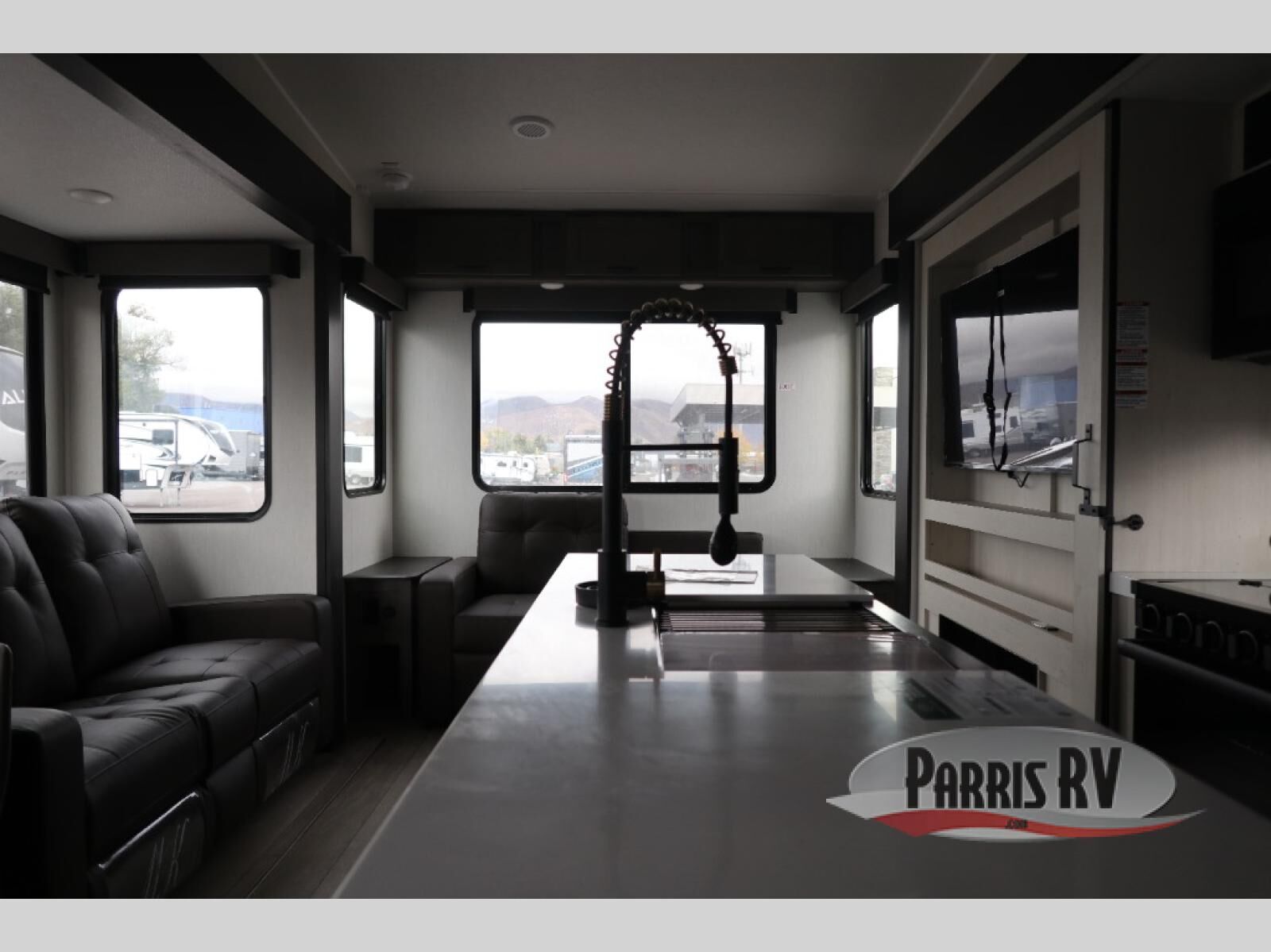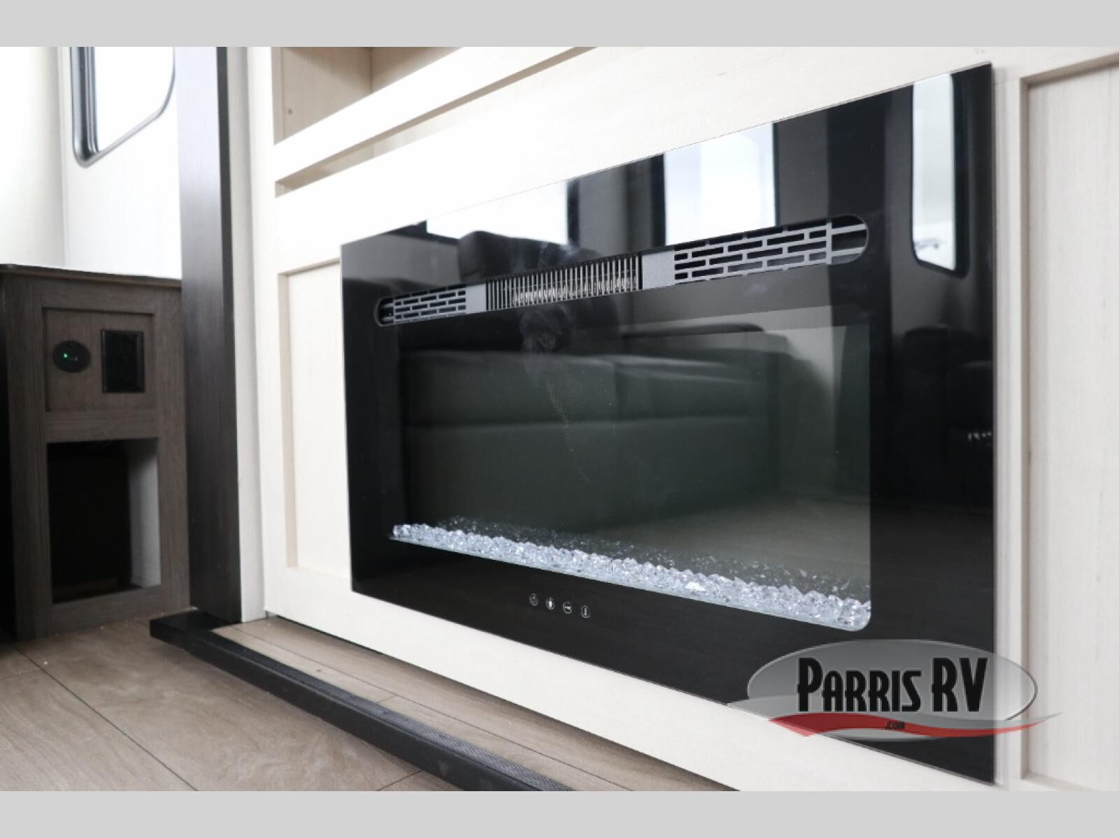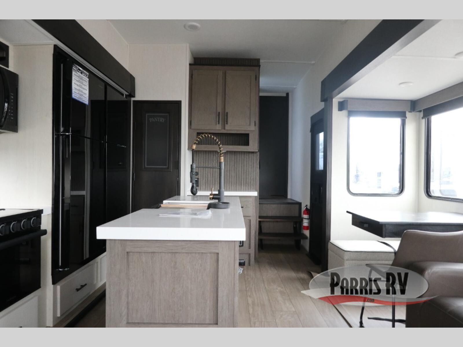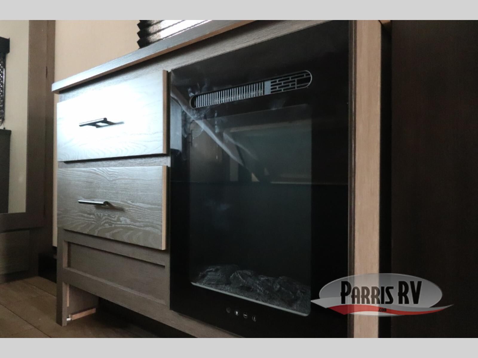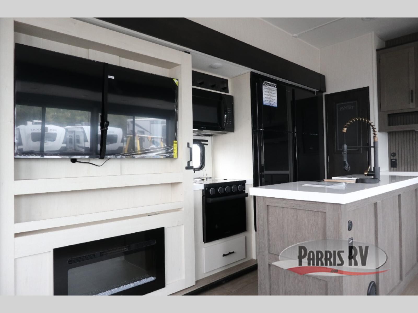 This Cherokee Arctic Wolf fifth wheel is quite extraordinary and accommodating! It has a set of opposing slides in the main living area so you can have more space to sit back on the theater seating and tri-fold sofa. You can switch on the fireplace to add some warmth to this space if it's a cool night. The free-standing table and chairs is going to be great for sitting down to eat a meal together, and there is even a storage ottoman seat for board games or throw blankets. You'll also be able to grab dessert from the large hidden pantry closet to go with your coffee. The private bedroom up front is going to provide great relaxation with its king bed slide. The spacious wardrobe includes washer/dryer prep, and there's even a second fireplace in the bedroom for the ultimate in coziness.
