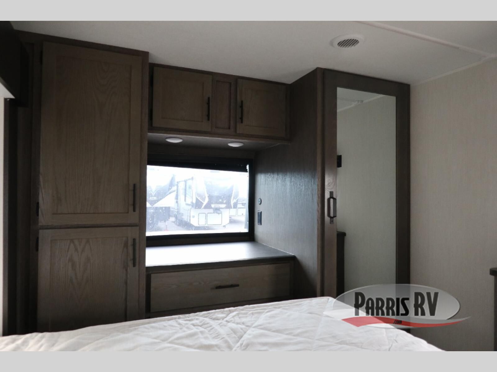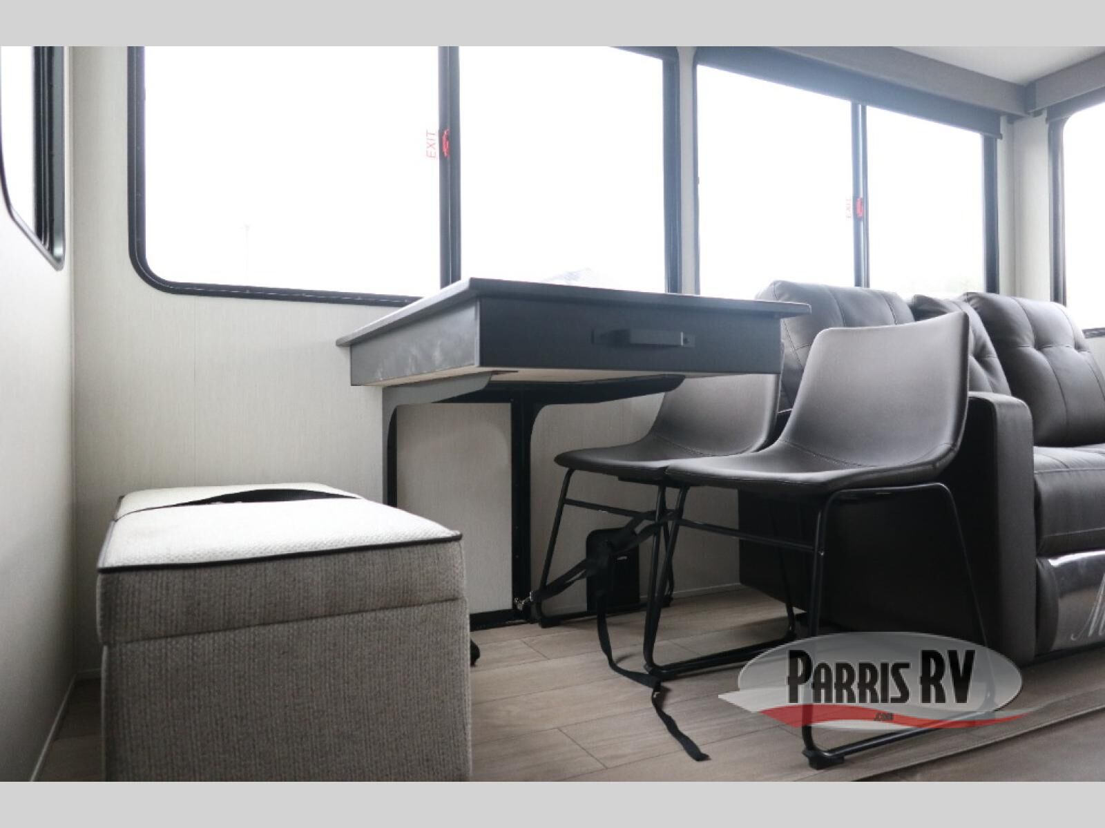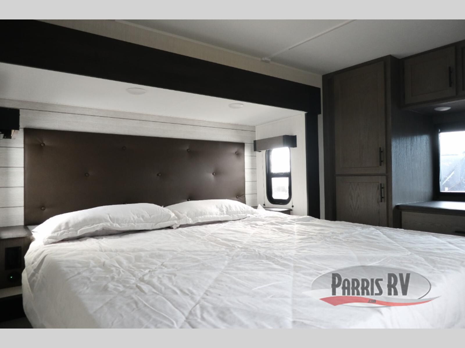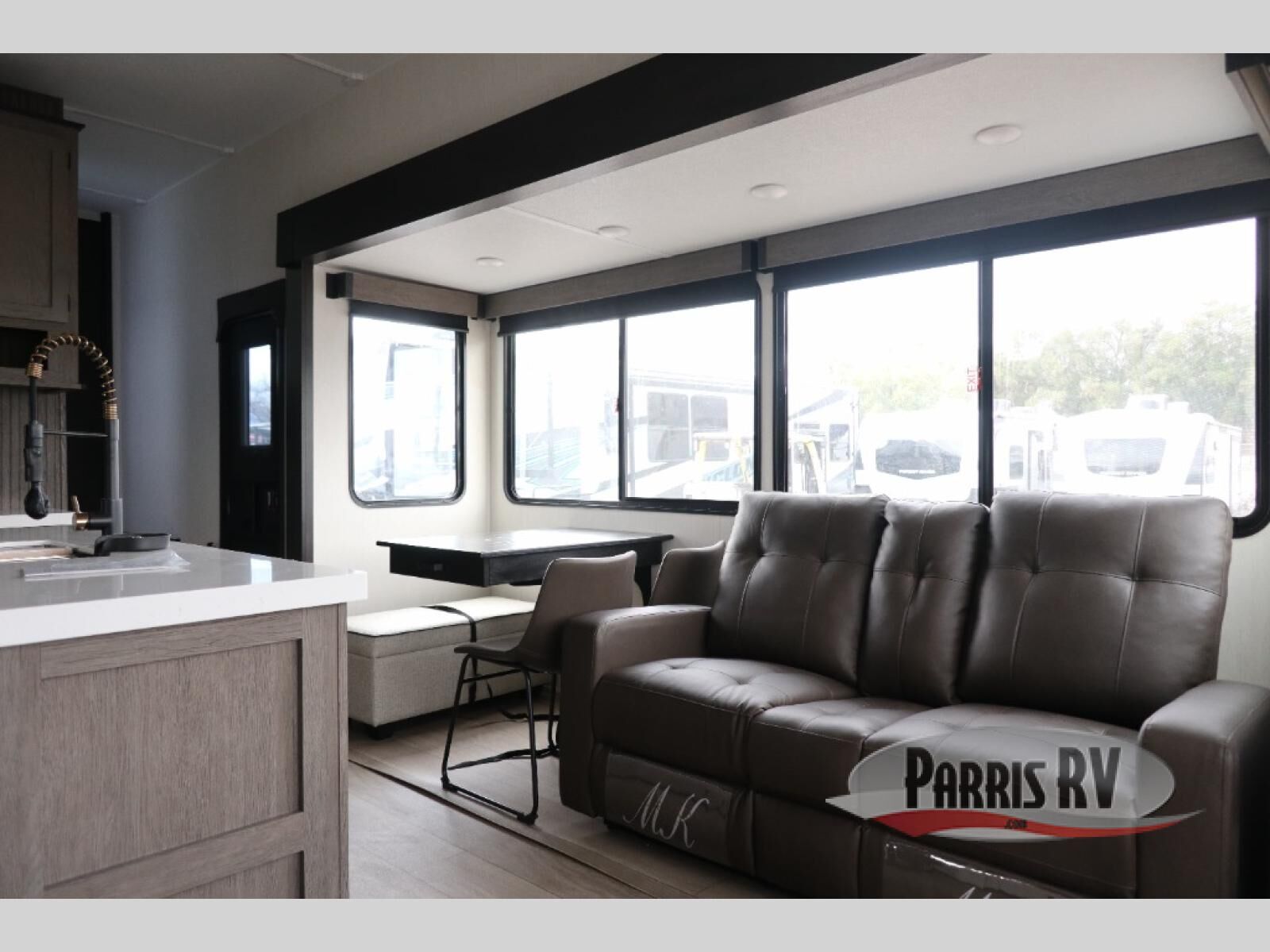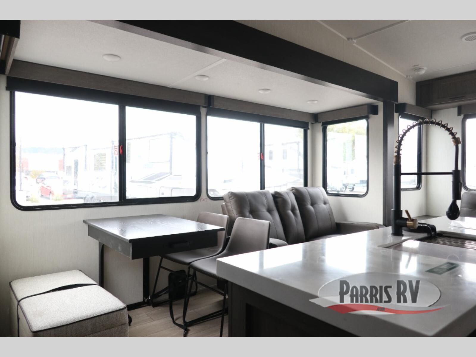 This Cherokee Arctic Wolf fifth wheel is quite extraordinary and accommodating! It has a set of opposing slides in the main living area so you can have more space to sit back on the theater seating and tri-fold sofa. You can switch on the fireplace to add some warmth to this space if it's a cool night. The free-standing table and chairs is going to be great for sitting down to eat a meal together, and there is even a storage ottoman seat for board games or throw blankets. You'll also be able to grab dessert from the large hidden pantry closet to go with your coffee. The private bedroom up front is going to provide great relaxation with its king bed slide. The spacious wardrobe includes washer/dryer prep, and there's even a second fireplace in the bedroom for the ultimate in coziness.