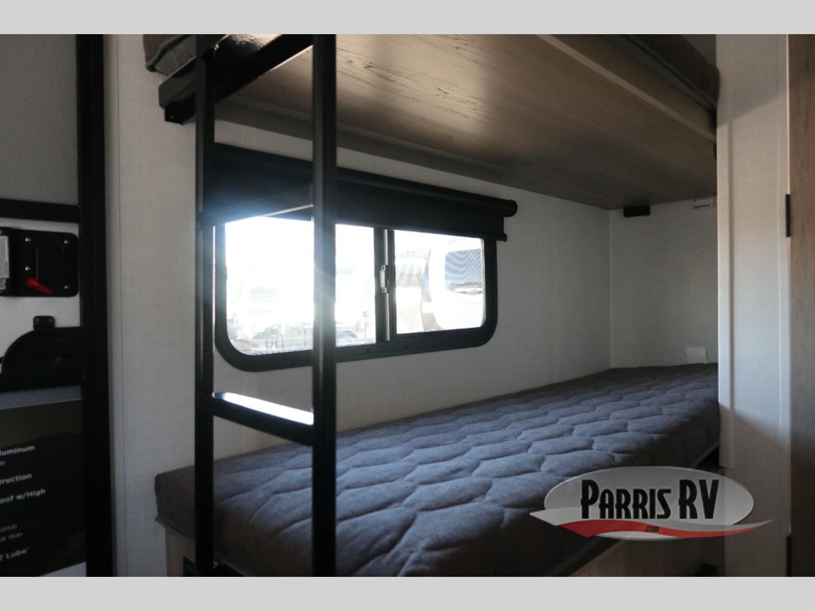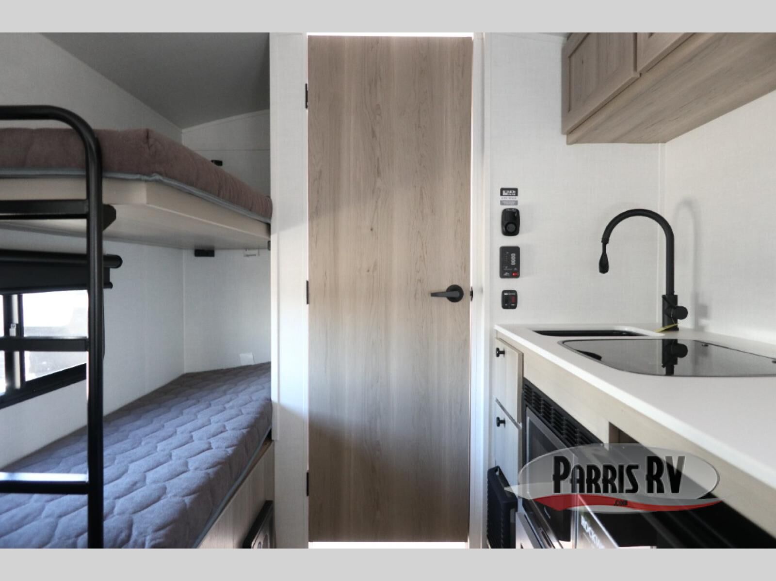 Perfect for couples, families, or friends, this trailer offers a comfortable and functional space to relax, recharge, and explore. The full bathroom is a serene retreat, equipped with everything you need to refresh and rejuvenate after a day of adventure. The two bunk beds give a snug and inviting sleeping spot, perfect for kids or adults looking for a cozy spot to rest. The kitchen is equipped with a microwave for quick and easy meal prep, and a fridge to keep your favorite snacks and drinks fresh. Overhead cabinets provide plenty of storage for your gear, cookware, and essentials, keeping your trailer tidy and organized. The bed offers a restful sleeping space, perfect for unwinding after a long day of exploring.