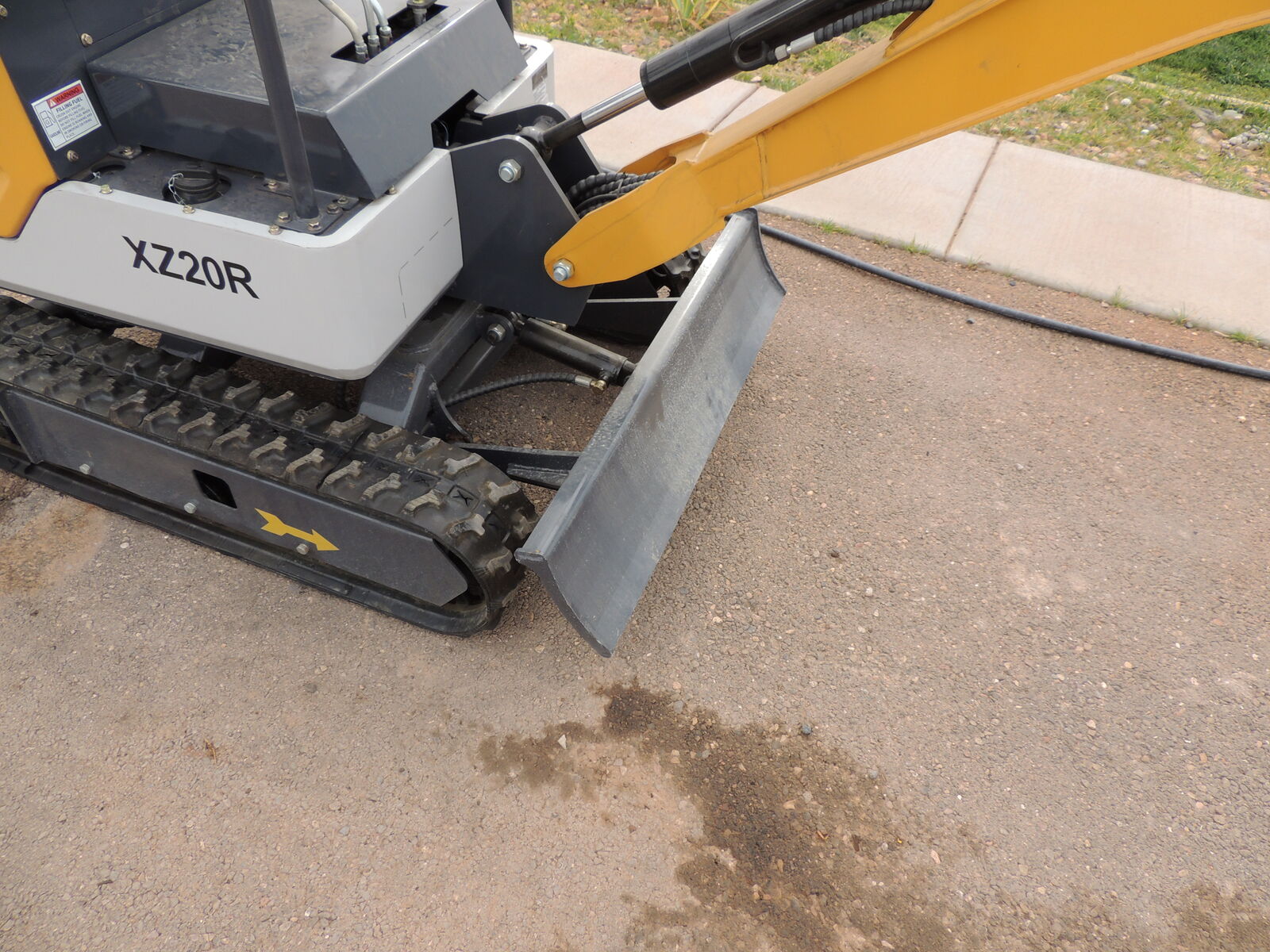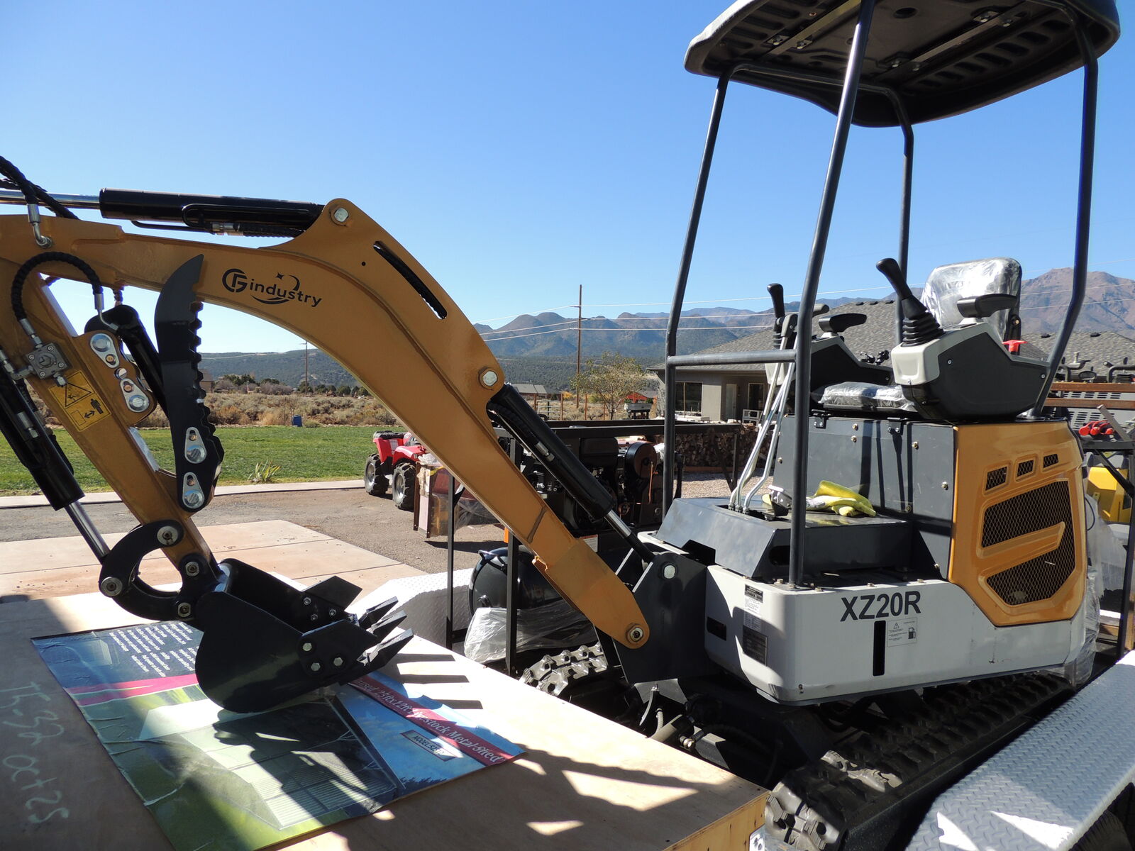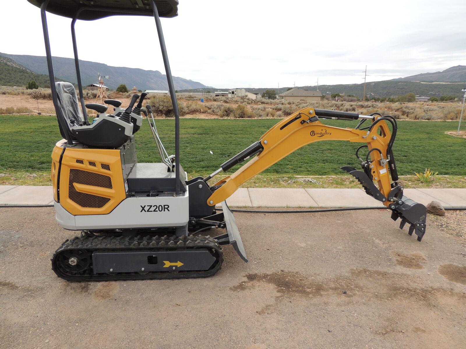 The CFG XZ20R mini excavator is a 23hp, gasoline-powered machine with a 2-cylinder Rato engine, a digging depth of up to 5.41 feet, and an operating weight of approximately 2,000–2,160 lbs. Key features include 7-inch rubber tracks, a hydraulic thumb, a 16" bucket, auxiliary hydraulics, and a backfill blade. It typically uses pilot controls and is quick-connect capable,