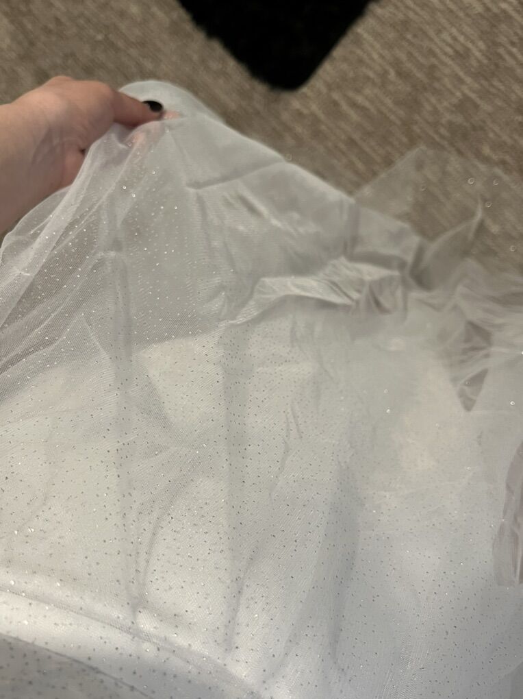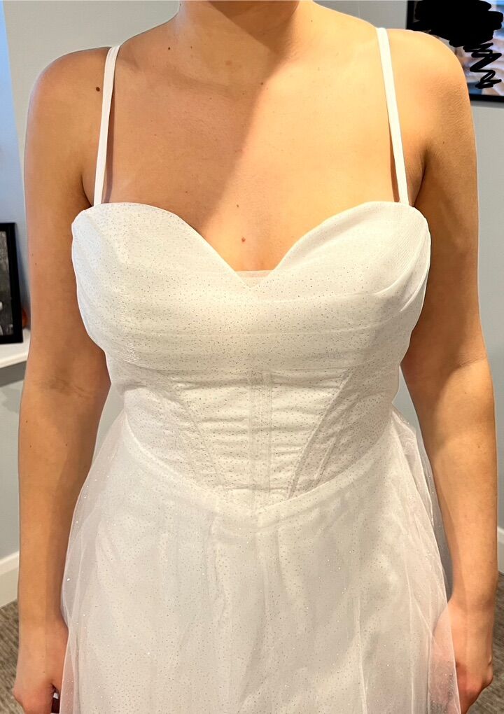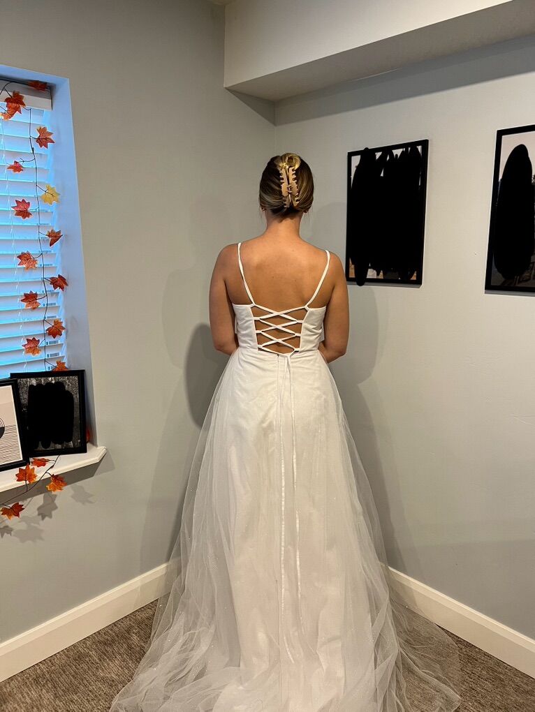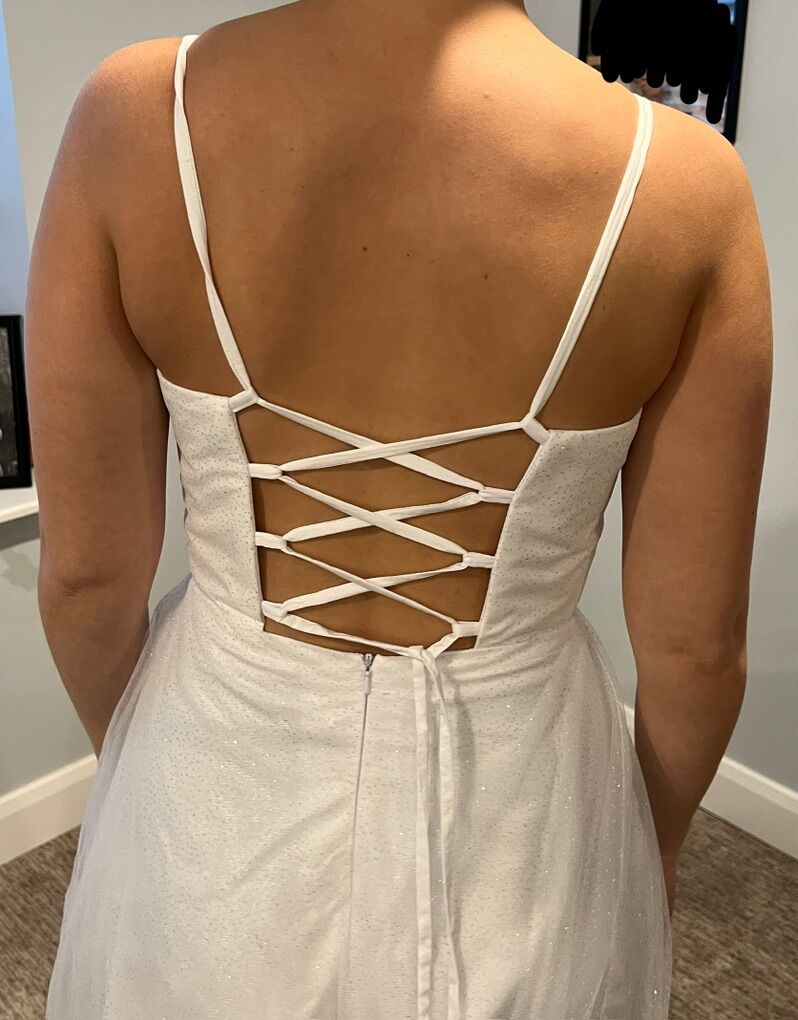 Sparkly wedding dress! Could be a prom dress as well. Has built in padded bra and a high leg split. I bought this as a potential option for my wedding dress but chose a different one. It’s new, never worn outside. It was listed as a size 8 but runs small. I’m a size 6 and it was a tiny bit tight but not uncomfortable. My measurements are:
