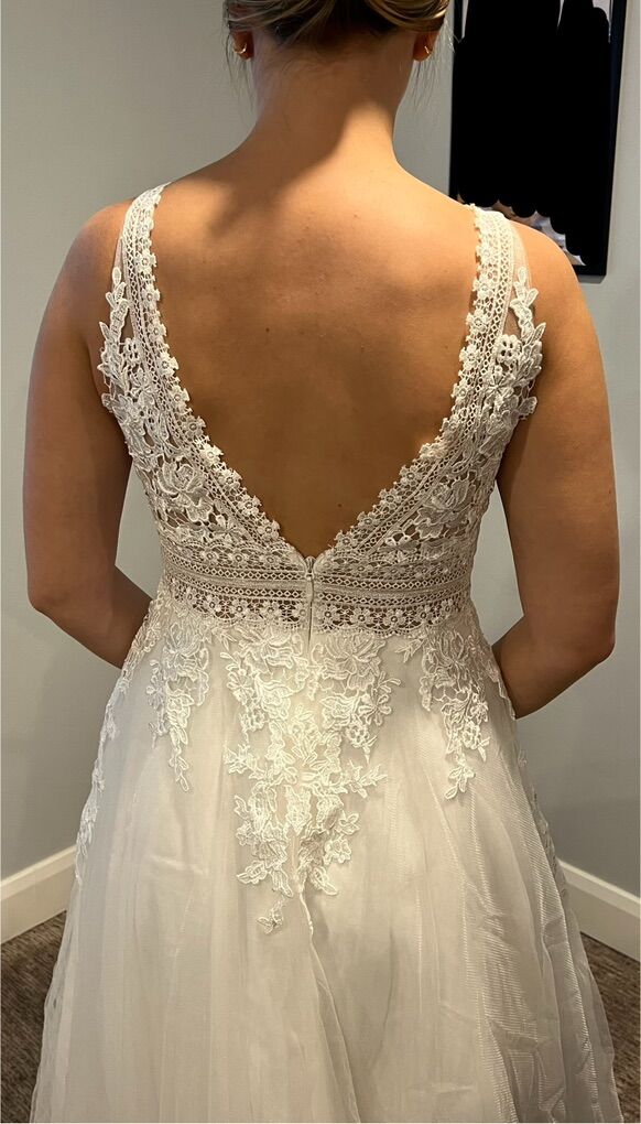 The lace on this is beautiful! It is new but has some fading/yellowing on the bra padding (shown in pictures). Size 6, fit me well. My measurements are: