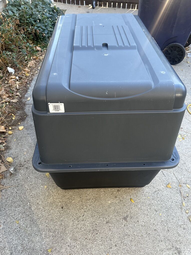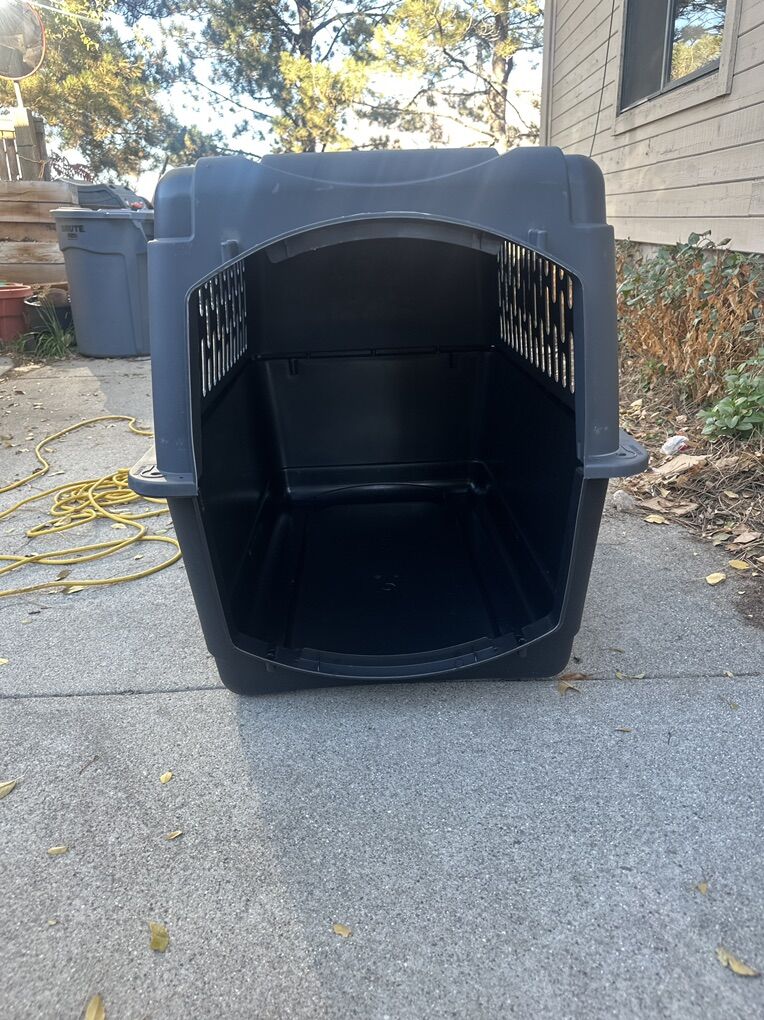PayPalThis large Black Dog Kennel is missing the front gate, so it's only the black upper and lower shell. That said, if you don't want to lock your dog up, but want to give him his own safe space, put a pillow on the floor and let him call it home.