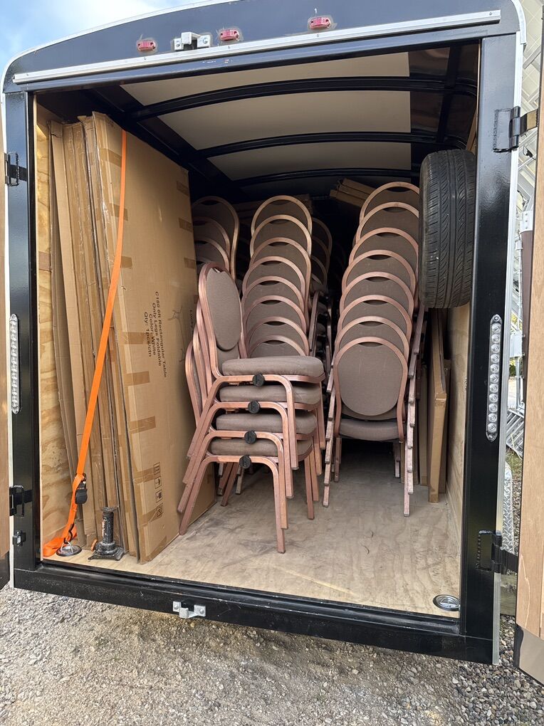 New 12’ enclosed trailer loaded with 100 nice cushion chairs and 20 new folding tables. Nice set up for rental business. $10,000 takes it