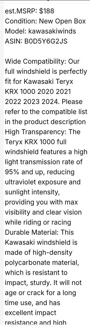 New in box windshield for KRX 1000 side by side with vents cost $188 $ 125 See pics for Specs