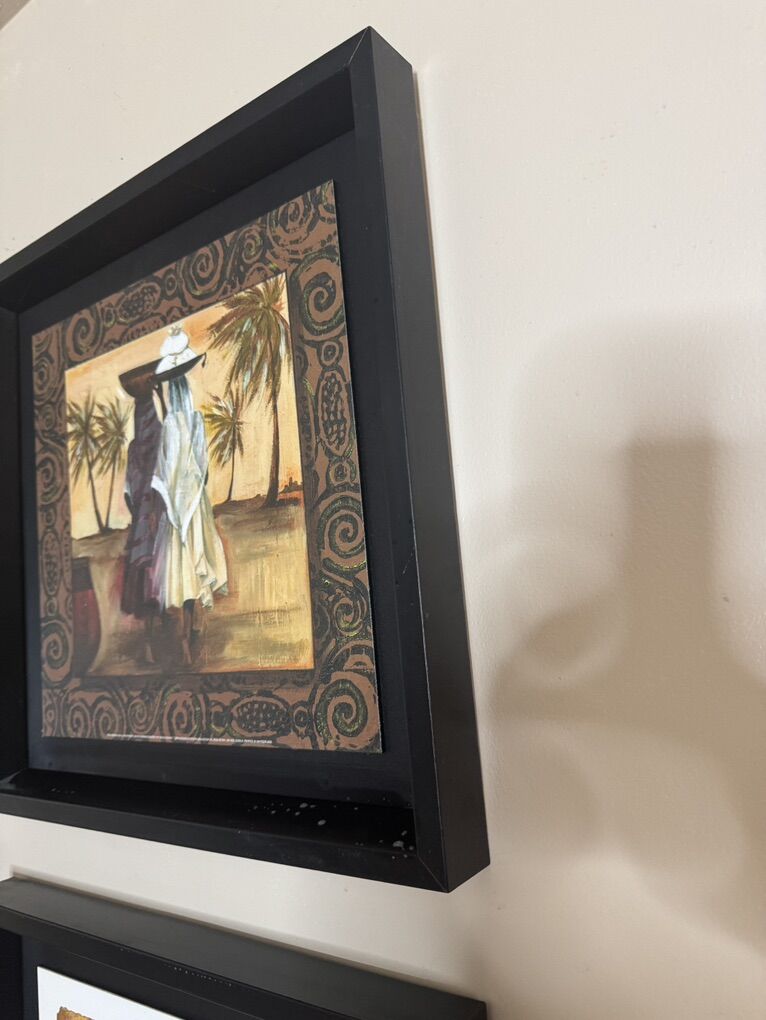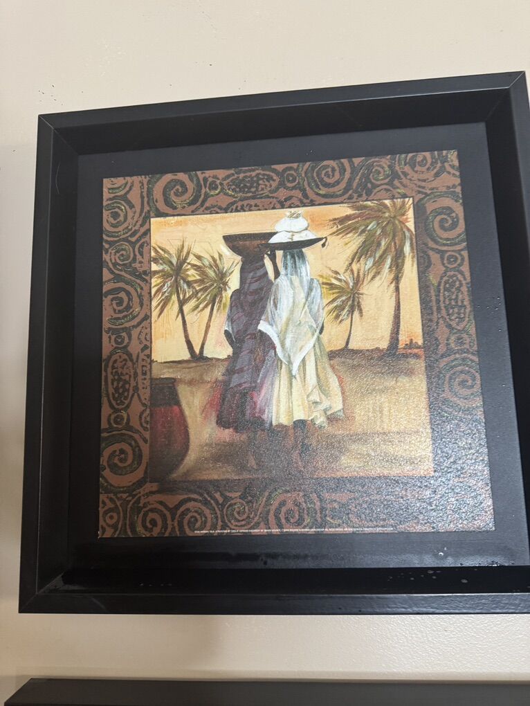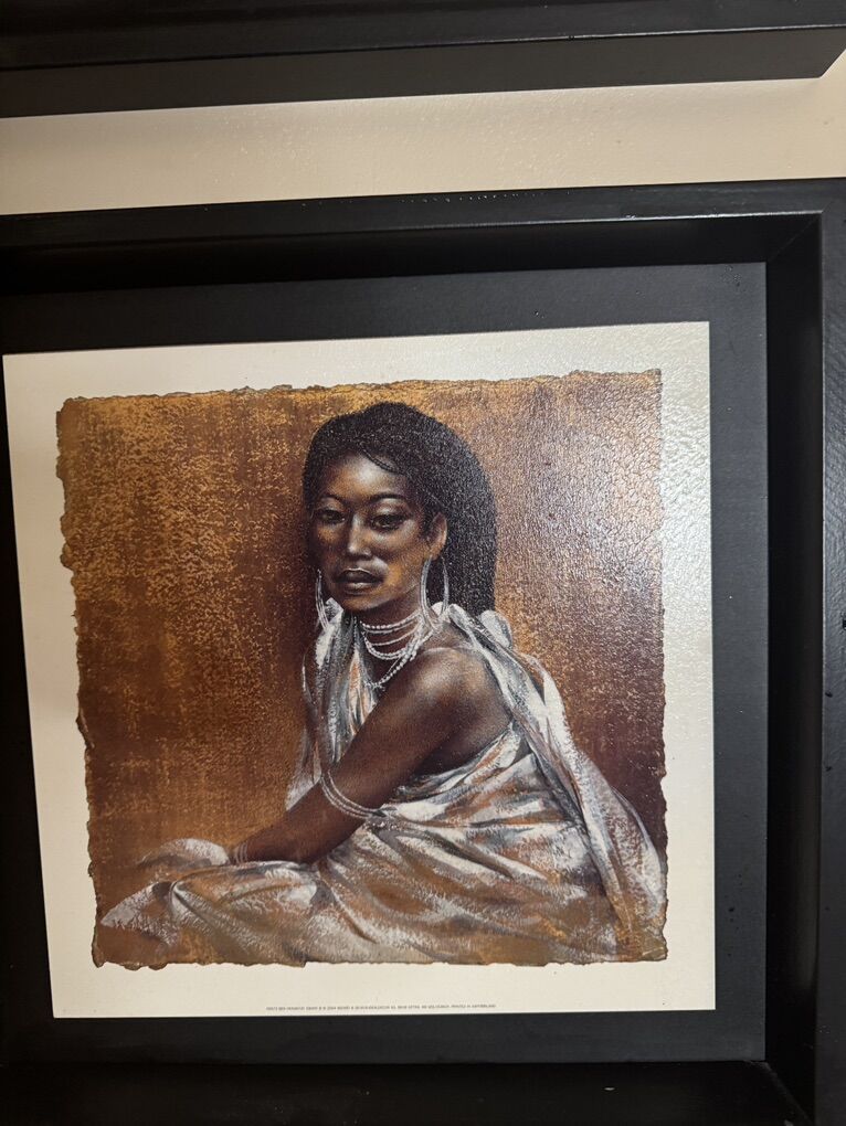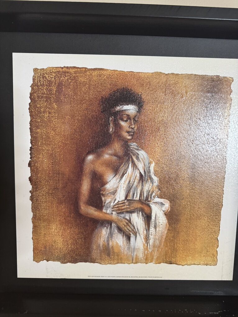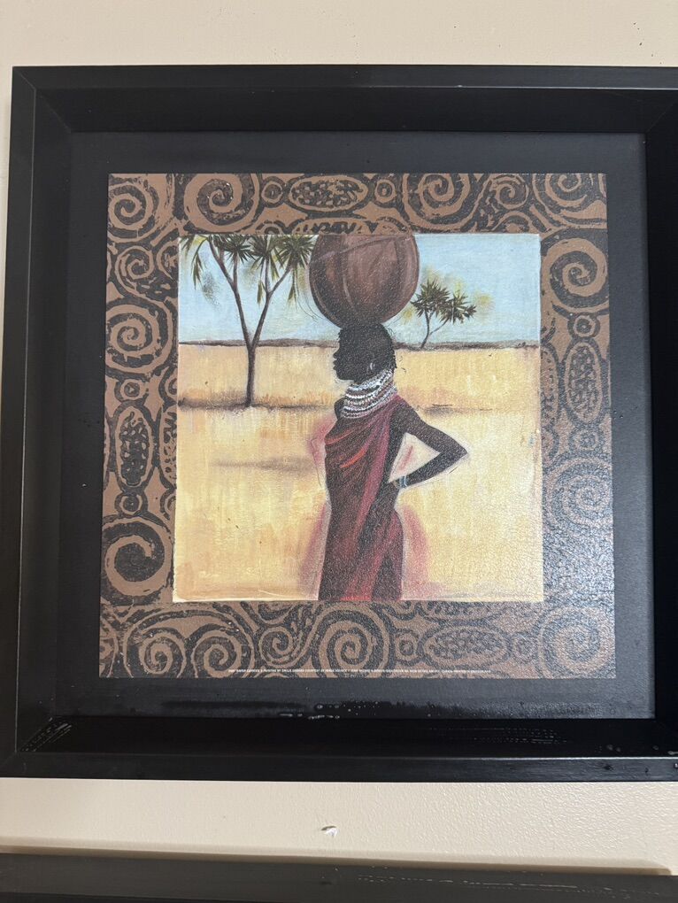 Each frame 15” x 15”. 4 for $25.00 Sitting woman, ebony 111 &artist Ben Mogador. Women Talk two women Tablo Fiyati. Ebony 1V standing woman artist Ben Mogador. Group is 25.00 textured paint