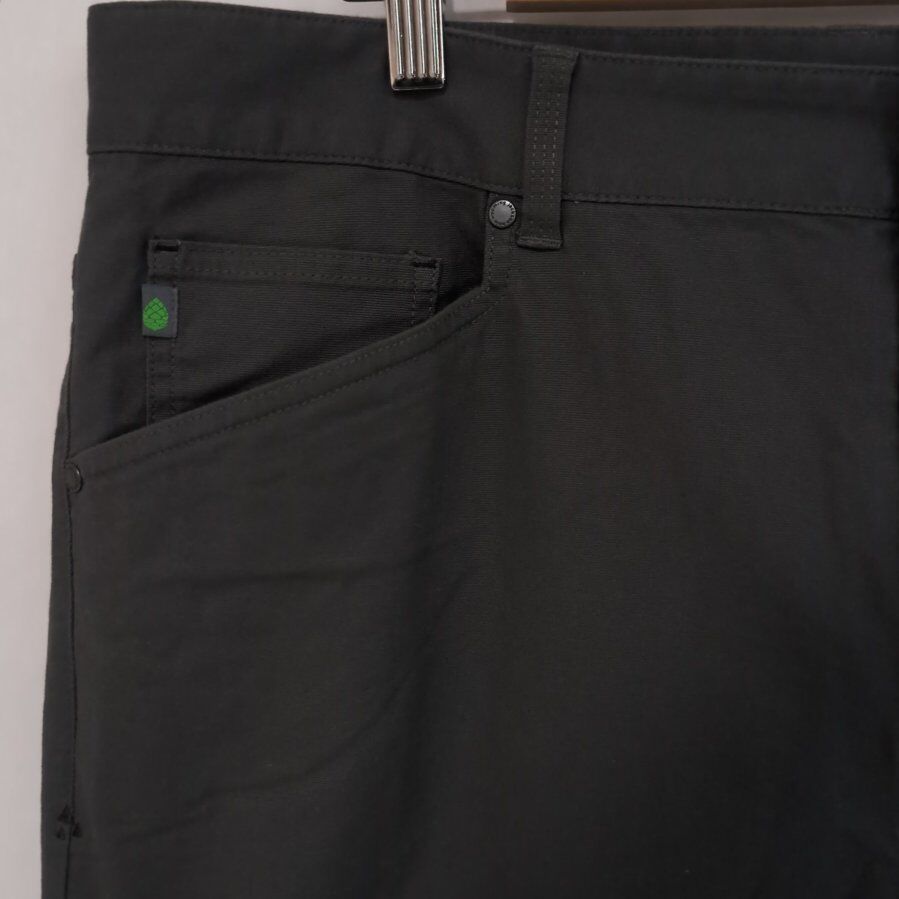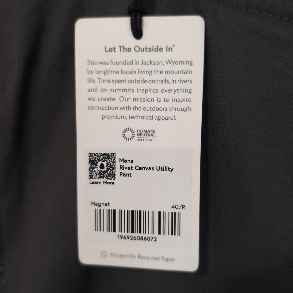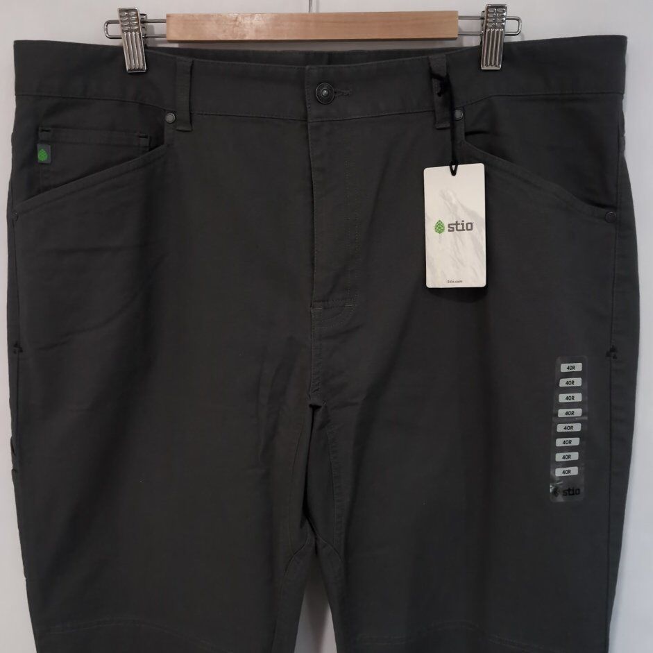 When toughness is mandatoryat the ranch, on the road or just tending the back fortyour Rivet Canvas Utility Pant is up to the task. The pant's gritty western mentality is reinforced by double-layered knees and resilient but responsible stretch organic cotton. A classic five-pocket design also includes a back thigh utility pocket that stashes a phone or tool within easy reach. The straight leg fit adapts to in-town or off-the-grid situations, while signature elements such as three peaks embroidery and custom Stio rivets identify with the local mountain landscape.