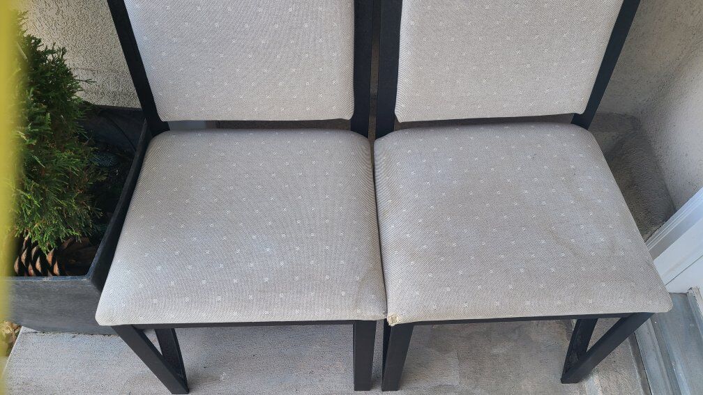 2 metal chairs with cream uholstery. 2 chairs are included in the price. Some cosmetic imperfections.