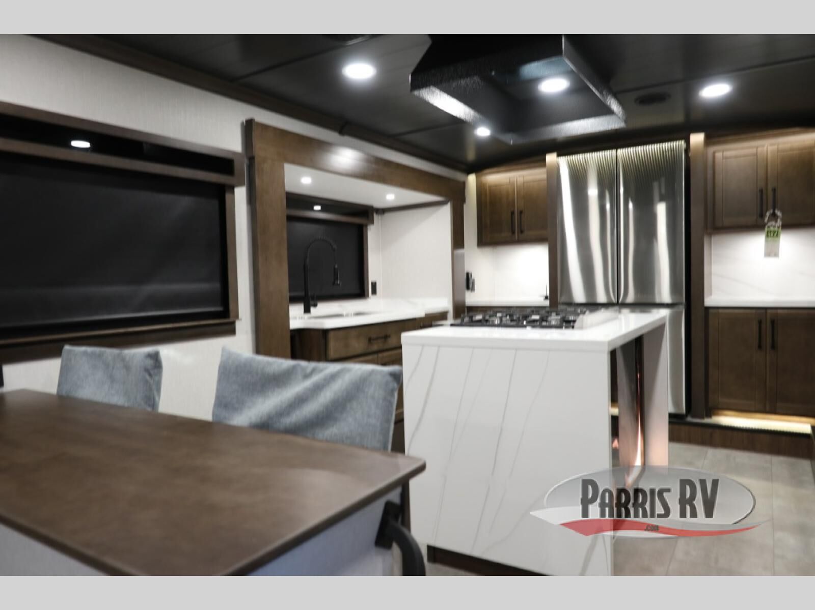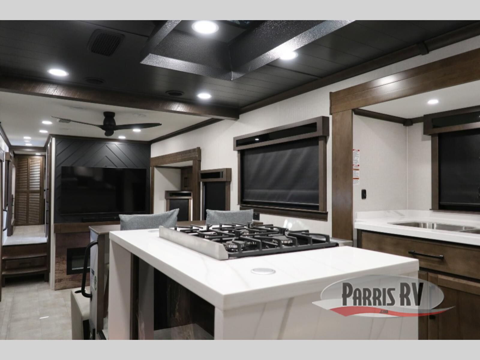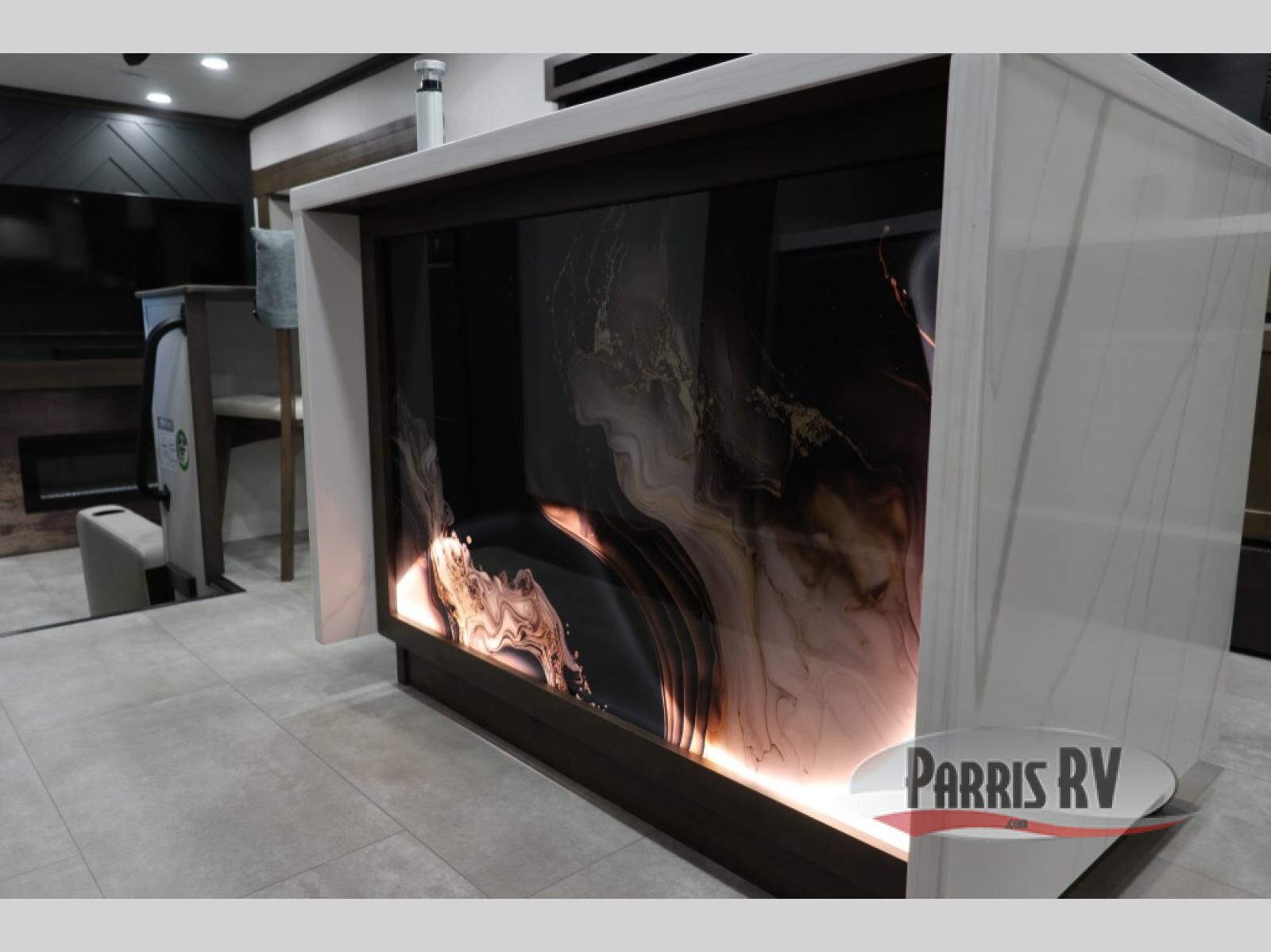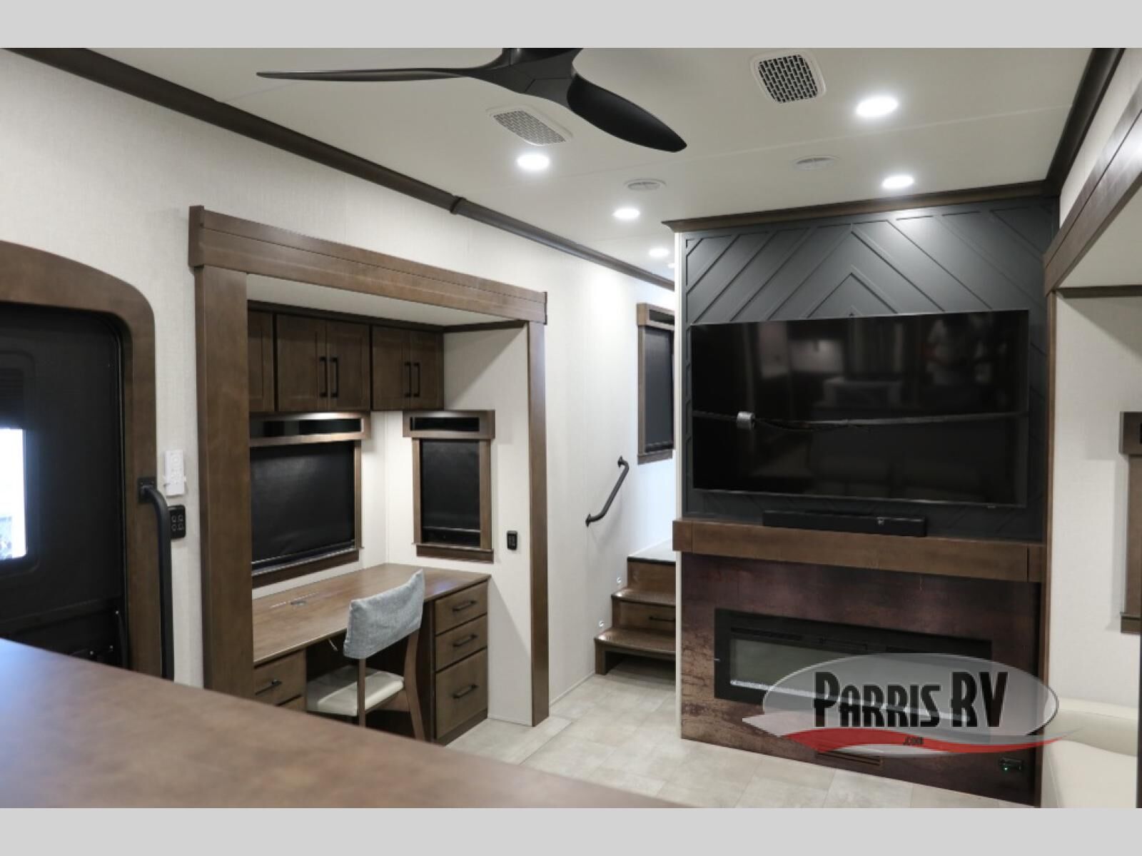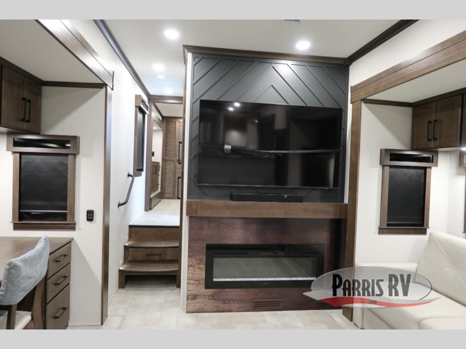 You will feel right at home in this fifth wheel! The rear private bedroom has a 72" x 80" king bed slide for a good night's rest, a rear large wardrobe with the washer and dryer next to it, and even a dresser with a 40" LED TV. And two can get ready at once in the full bathroom with the dual sink vanity. You can then head to either the desk slide to get some work done or whip up some scrambled eggs on the three burner cooktop at the island in the front kitchen. The kitchen even has a dishwasher for easy clean up and two bar stools at the high top dinette that overlooks the middle living area. Relax each night in true comfort on either the E-Z Glide sofa bed slide or the theater seating across from the entertainment center which has a fireplace and 65" Samsung LED Smart TV to watch your favorite movies!