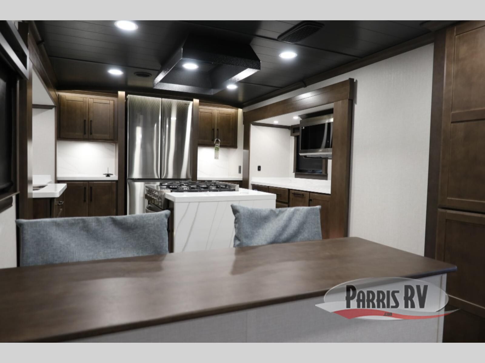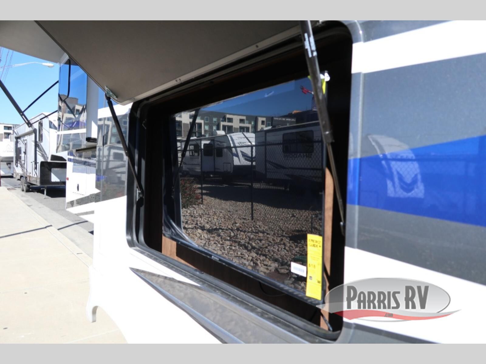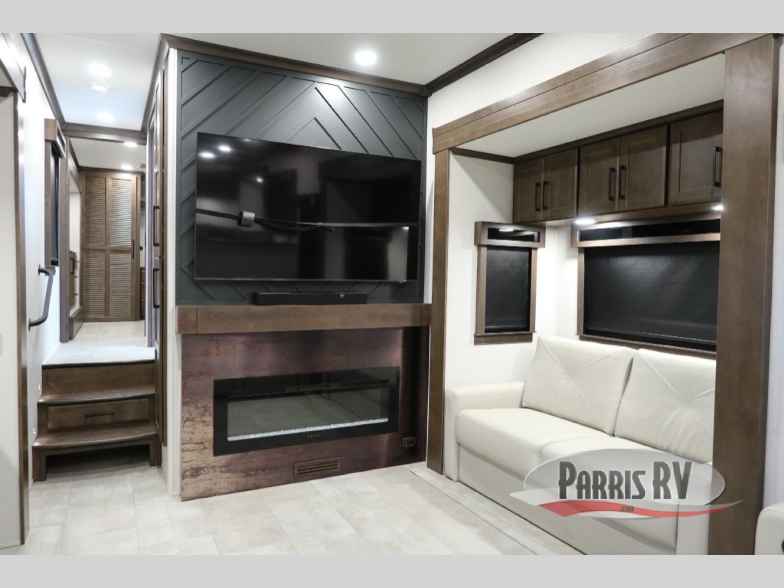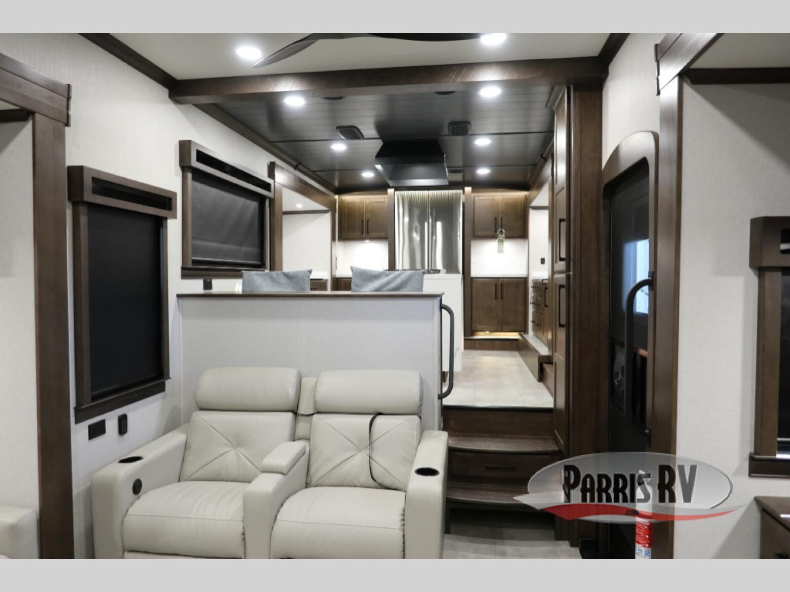 You will feel right at home in this fifth wheel! The rear private bedroom has a 72" x 80" king bed slide for a good night's rest, a rear large wardrobe with the washer and dryer next to it, and even a dresser with a 40" LED TV. And two can get ready at once in the full bathroom with the dual sink vanity. You can then head to either the desk slide to get some work done or whip up some scrambled eggs on the three burner cooktop at the island in the front kitchen. The kitchen even has a dishwasher for easy clean up and two bar stools at the high top dinette that overlooks the middle living area. Relax each night in true comfort on either the E-Z Glide sofa bed slide or the theater seating across from the entertainment center which has a fireplace and 65" Samsung LED Smart TV to watch your favorite movies!