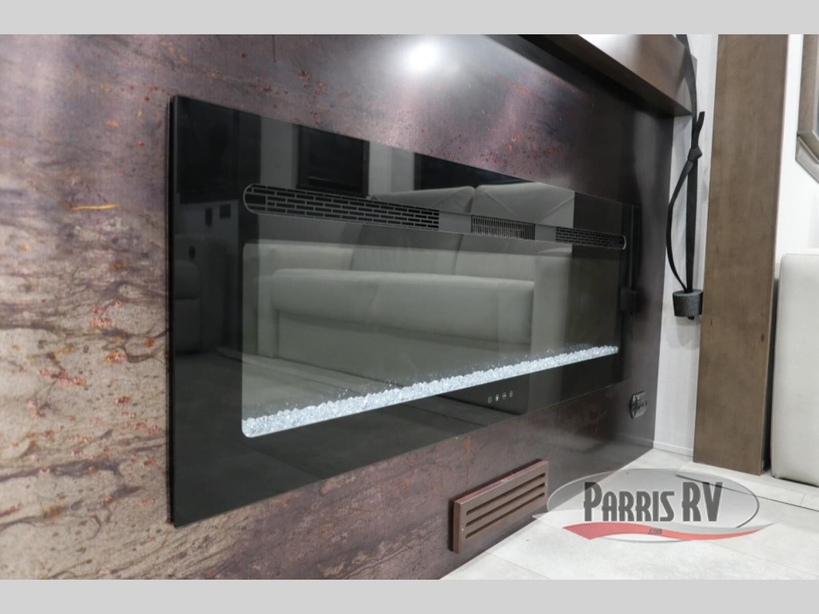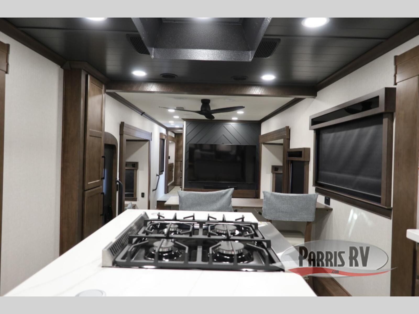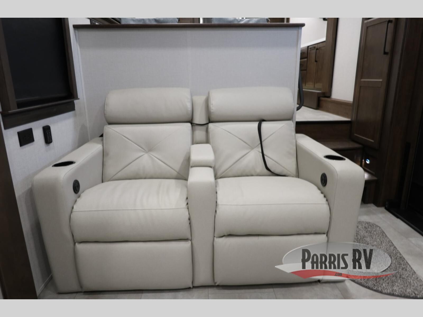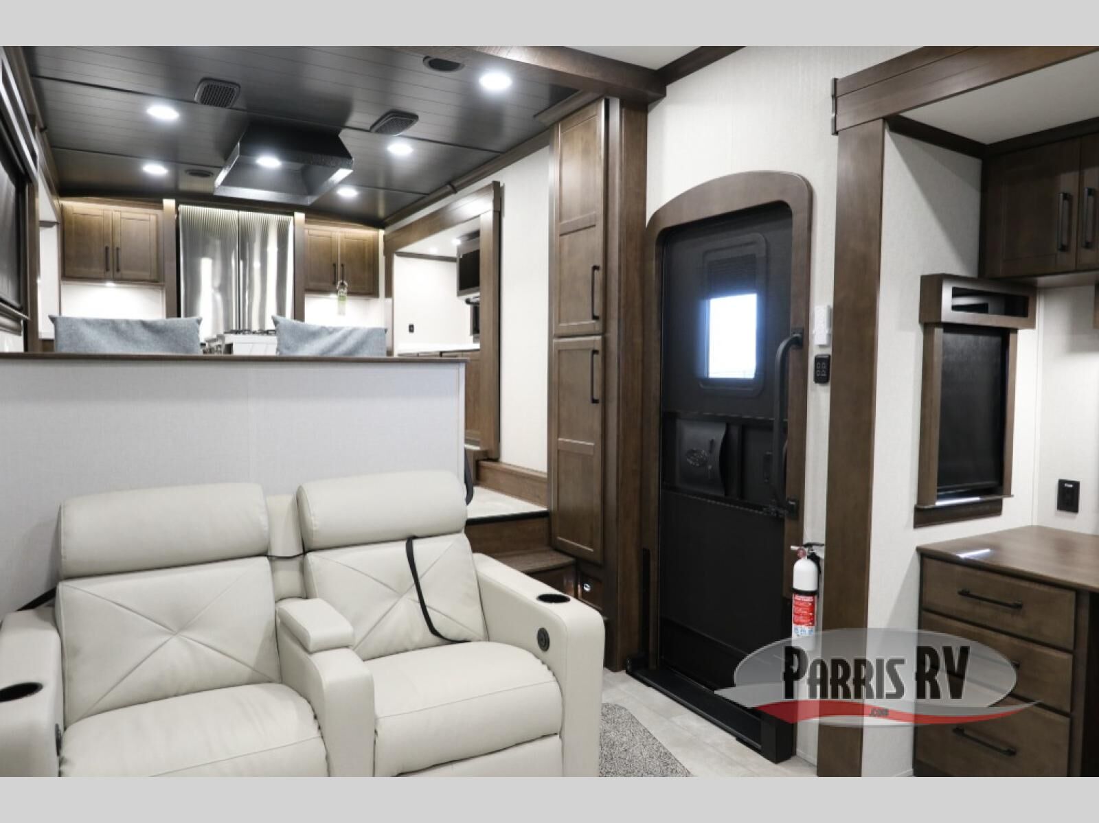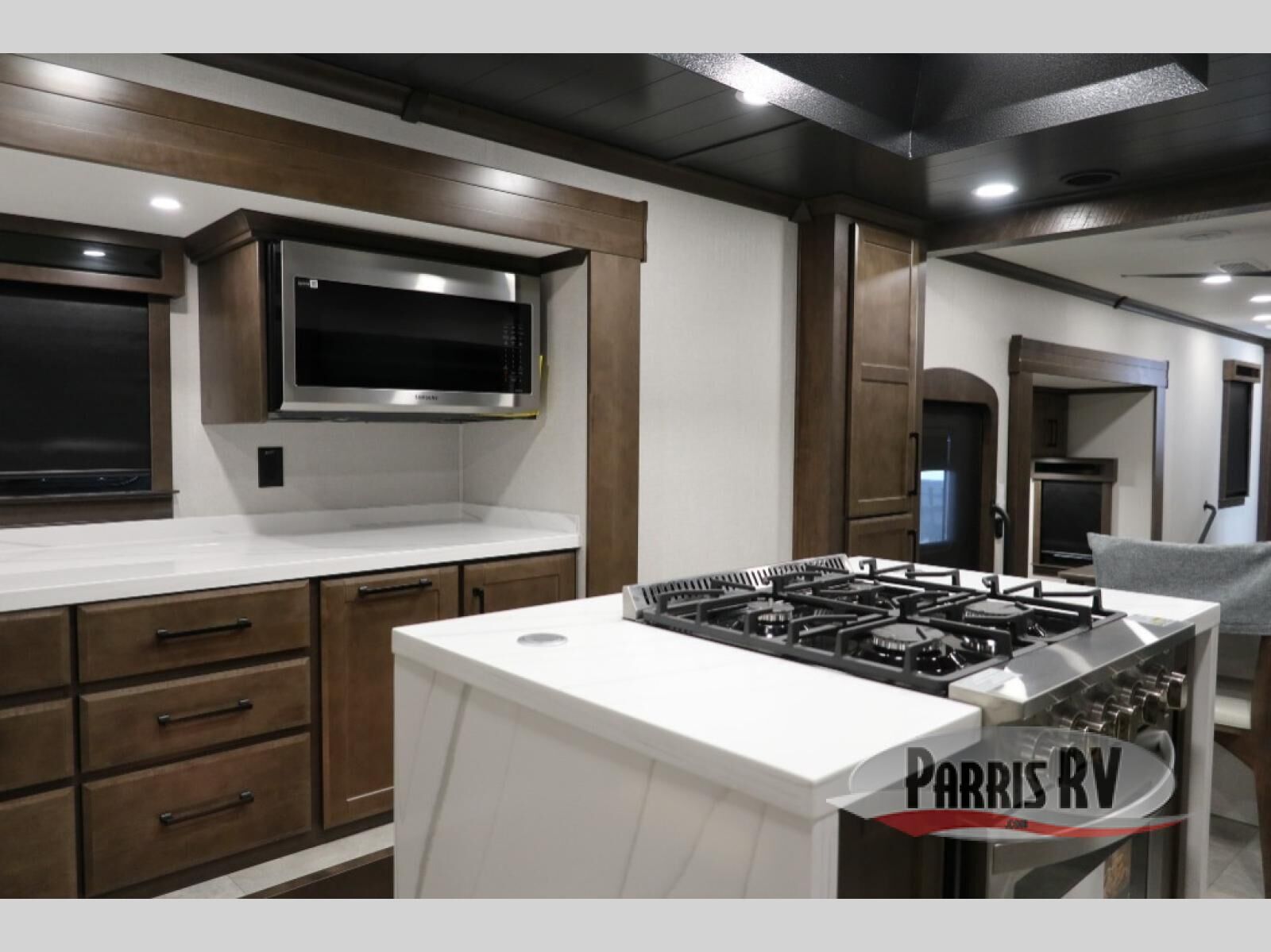 You will feel right at home in this fifth wheel! The rear private bedroom has a 72" x 80" king bed slide for a good night's rest, a rear large wardrobe with the washer and dryer next to it, and even a dresser with a 40" LED TV. And two can get ready at once in the full bathroom with the dual sink vanity. You can then head to either the desk slide to get some work done or whip up some scrambled eggs on the three burner cooktop at the island in the front kitchen. The kitchen even has a dishwasher for easy clean up and two bar stools at the high top dinette that overlooks the middle living area. Relax each night in true comfort on either the E-Z Glide sofa bed slide or the theater seating across from the entertainment center which has a fireplace and 65" Samsung LED Smart TV to watch your favorite movies!