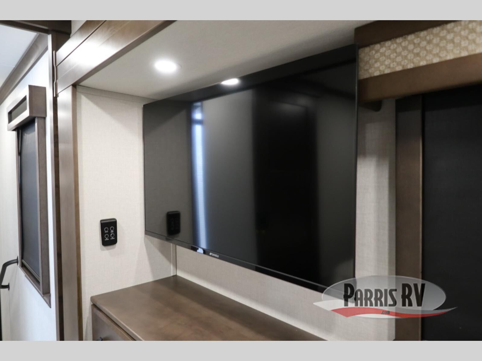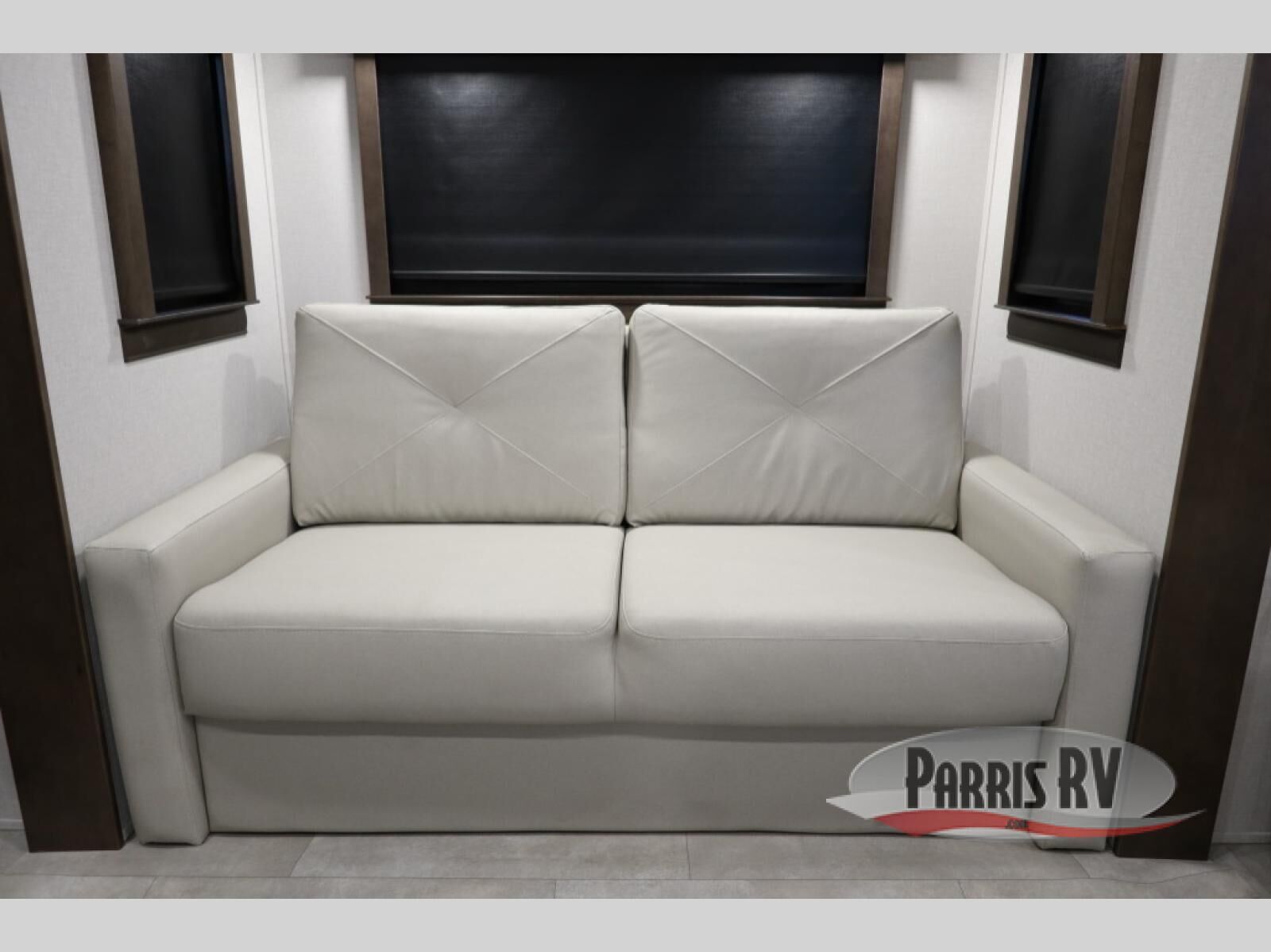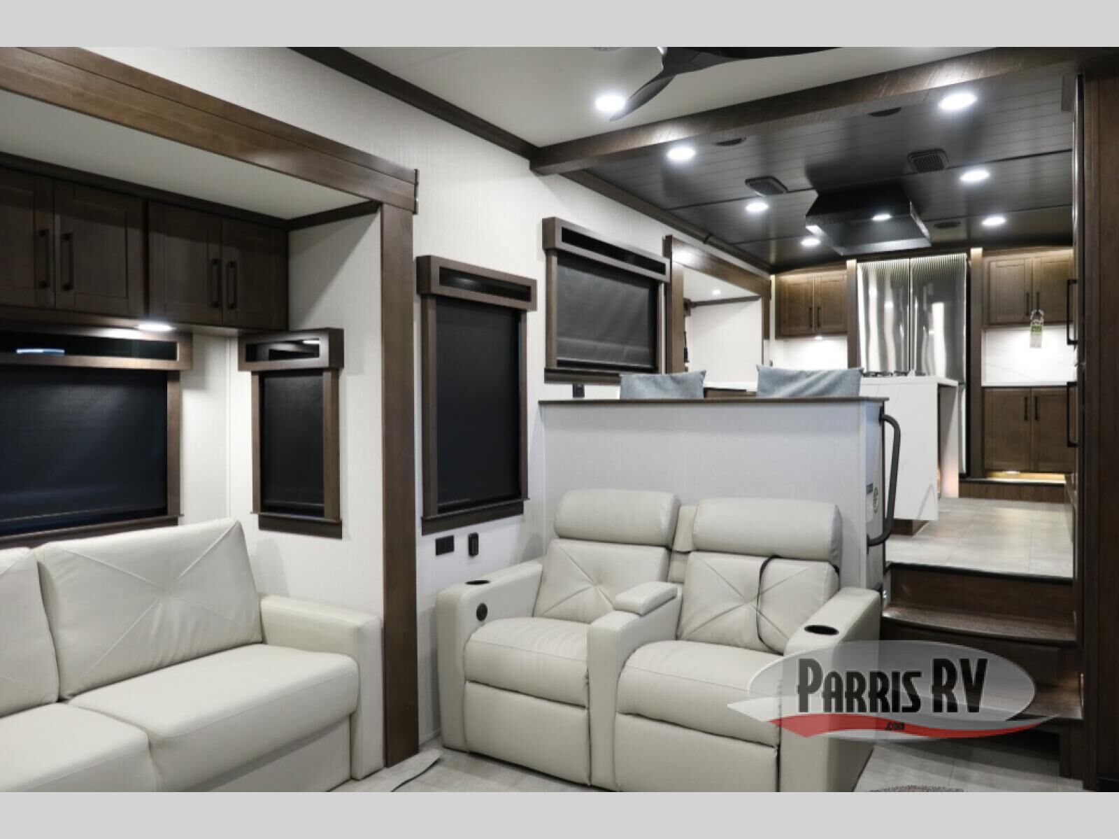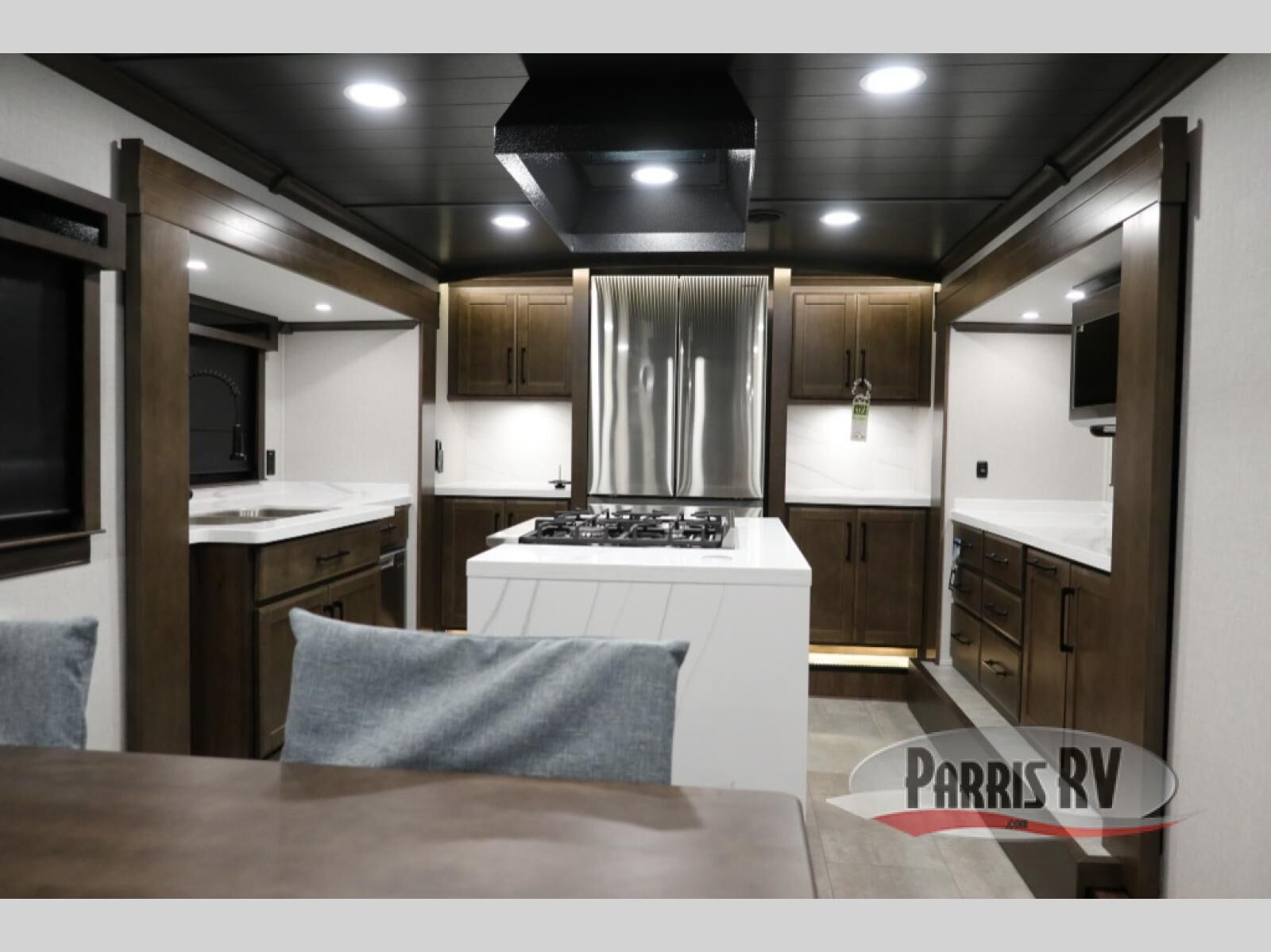 You will feel right at home in this fifth wheel! The rear private bedroom has a 72" x 80" king bed slide for a good night's rest, a rear large wardrobe with the washer and dryer next to it, and even a dresser with a 40" LED TV. And two can get ready at once in the full bathroom with the dual sink vanity. You can then head to either the desk slide to get some work done or whip up some scrambled eggs on the three burner cooktop at the island in the front kitchen. The kitchen even has a dishwasher for easy clean up and two bar stools at the high top dinette that overlooks the middle living area. Relax each night in true comfort on either the E-Z Glide sofa bed slide or the theater seating across from the entertainment center which has a fireplace and 65" Samsung LED Smart TV to watch your favorite movies!