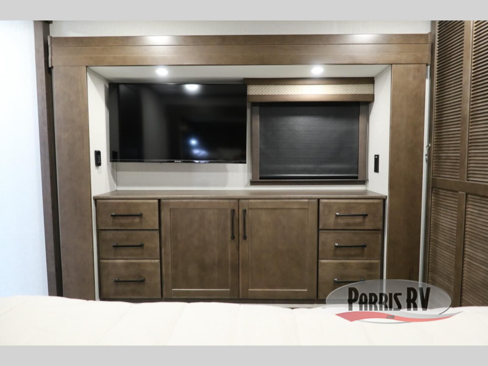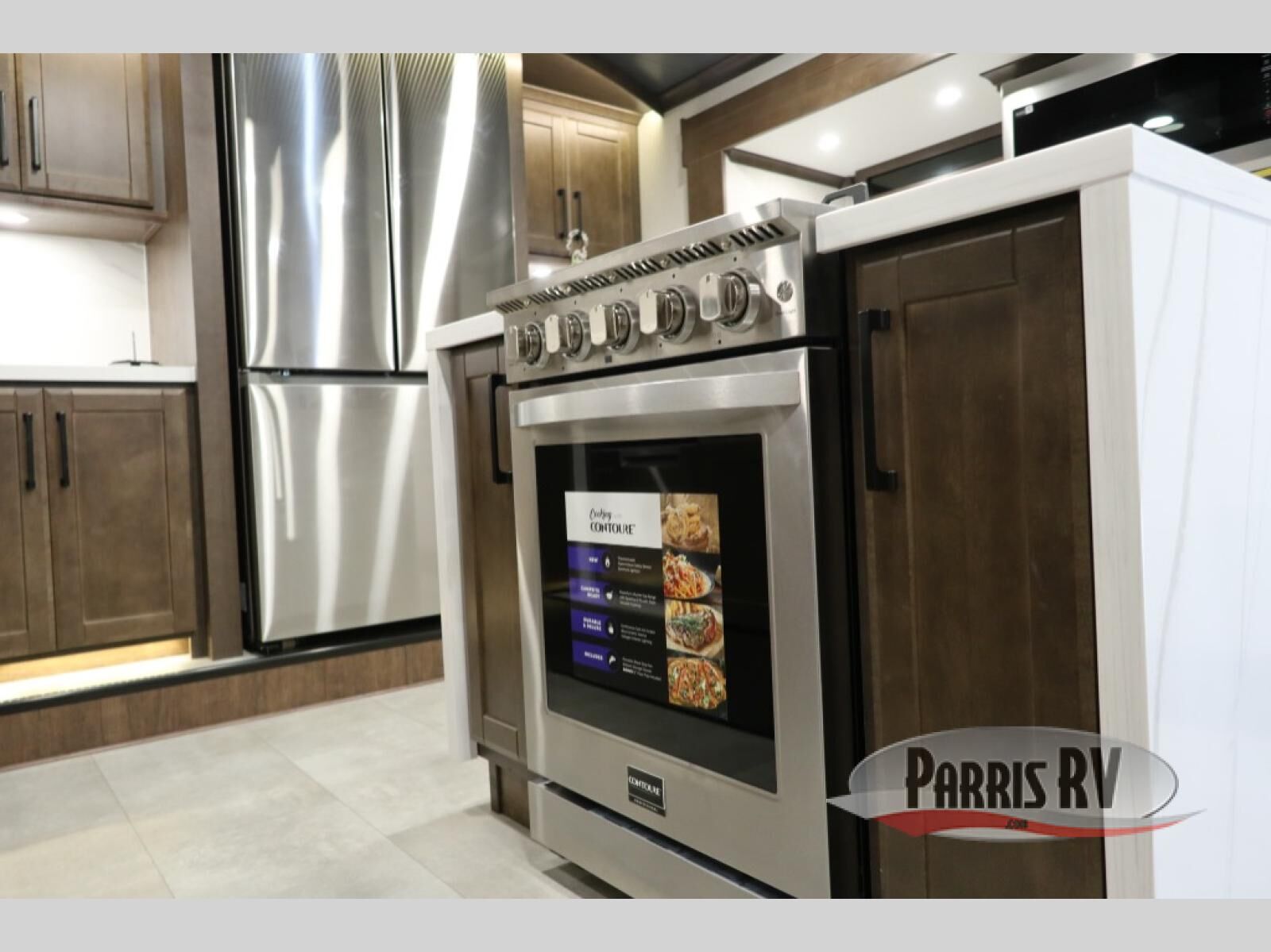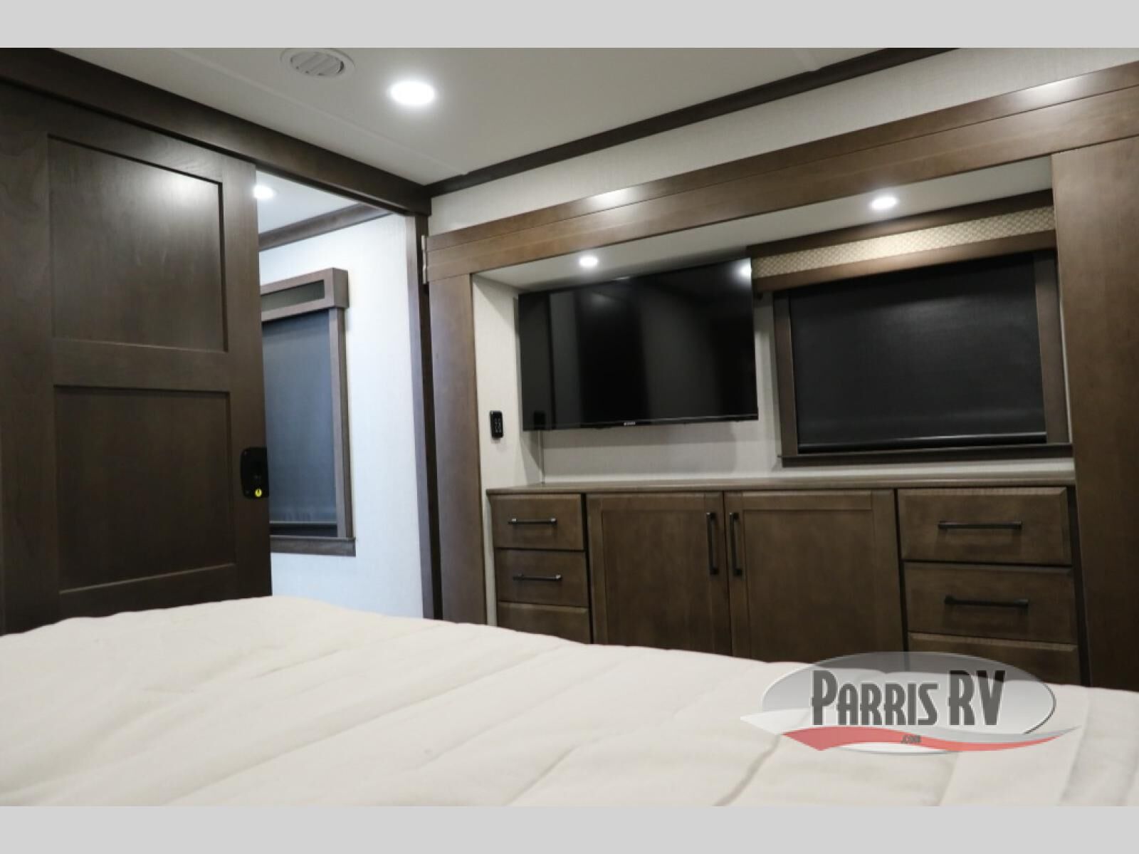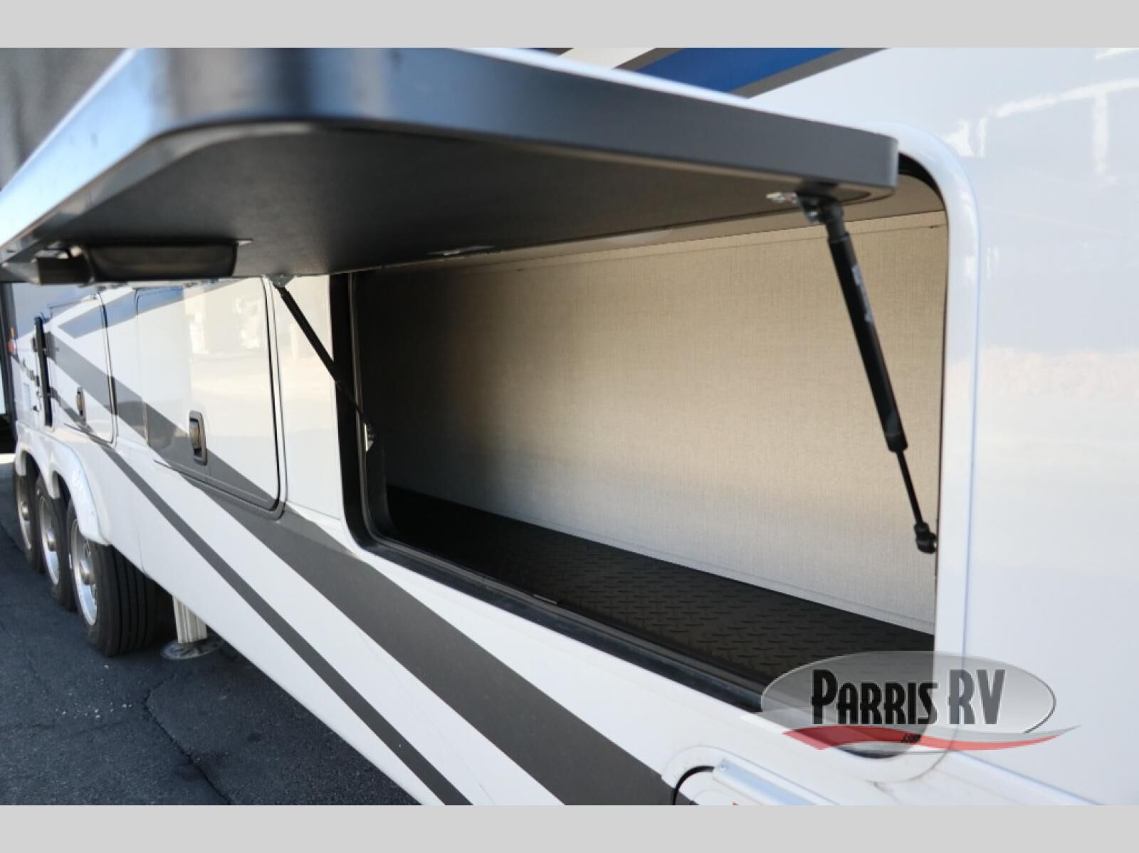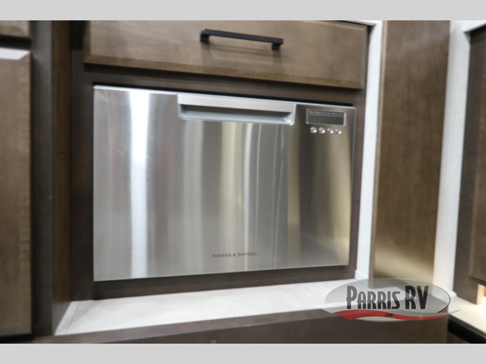 You will feel right at home in this fifth wheel! The rear private bedroom has a 72" x 80" king bed slide for a good night's rest, a rear large wardrobe with the washer and dryer next to it, and even a dresser with a 40" LED TV. And two can get ready at once in the full bathroom with the dual sink vanity. You can then head to either the desk slide to get some work done or whip up some scrambled eggs on the three burner cooktop at the island in the front kitchen. The kitchen even has a dishwasher for easy clean up and two bar stools at the high top dinette that overlooks the middle living area. Relax each night in true comfort on either the E-Z Glide sofa bed slide or the theater seating across from the entertainment center which has a fireplace and 65" Samsung LED Smart TV to watch your favorite movies!
