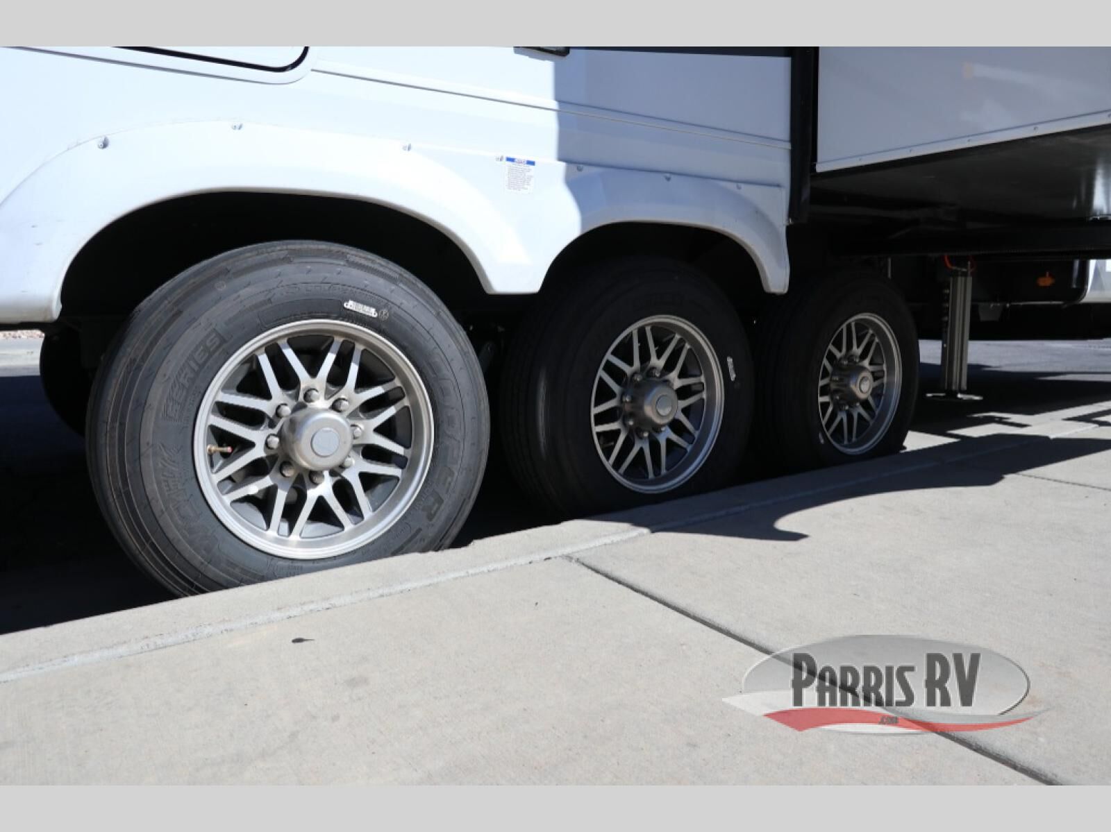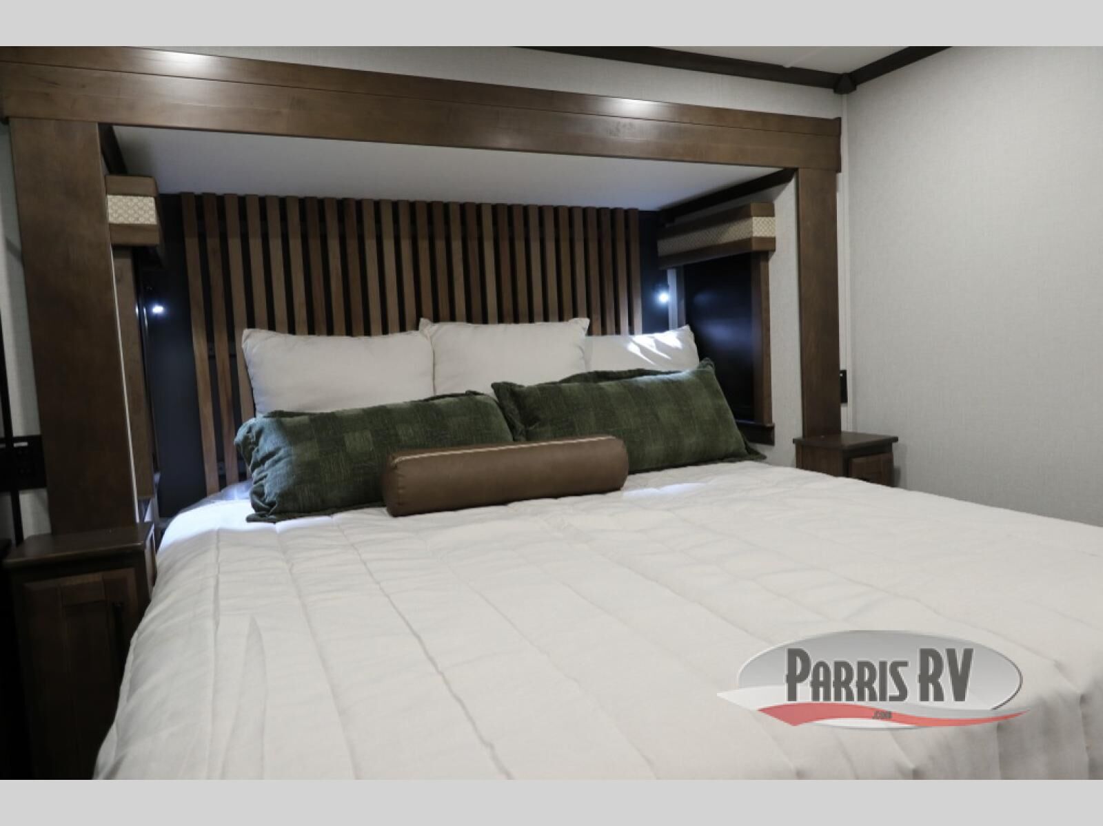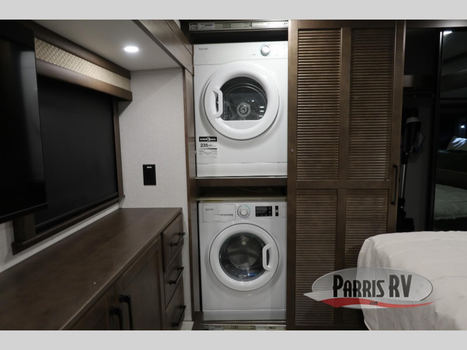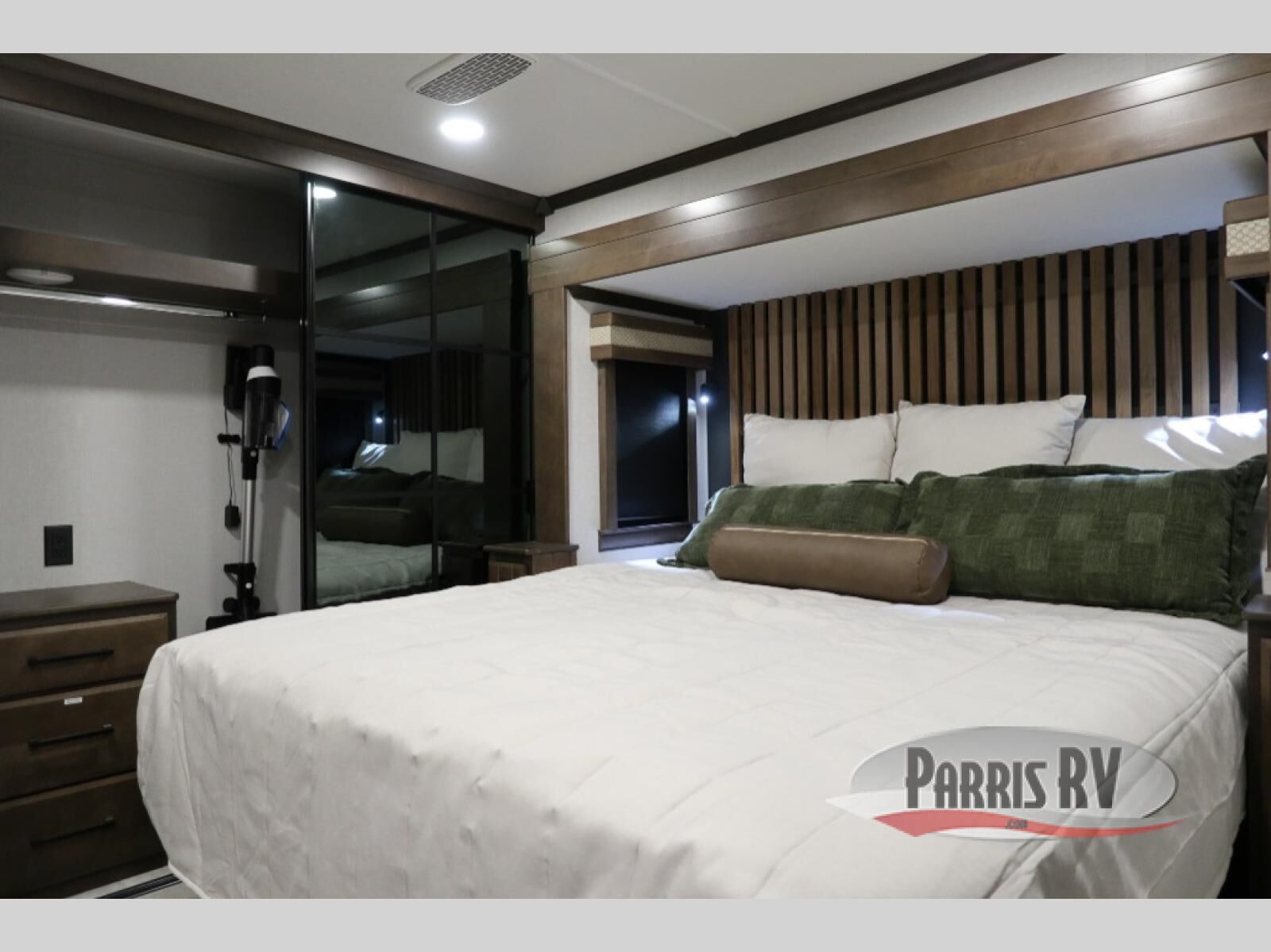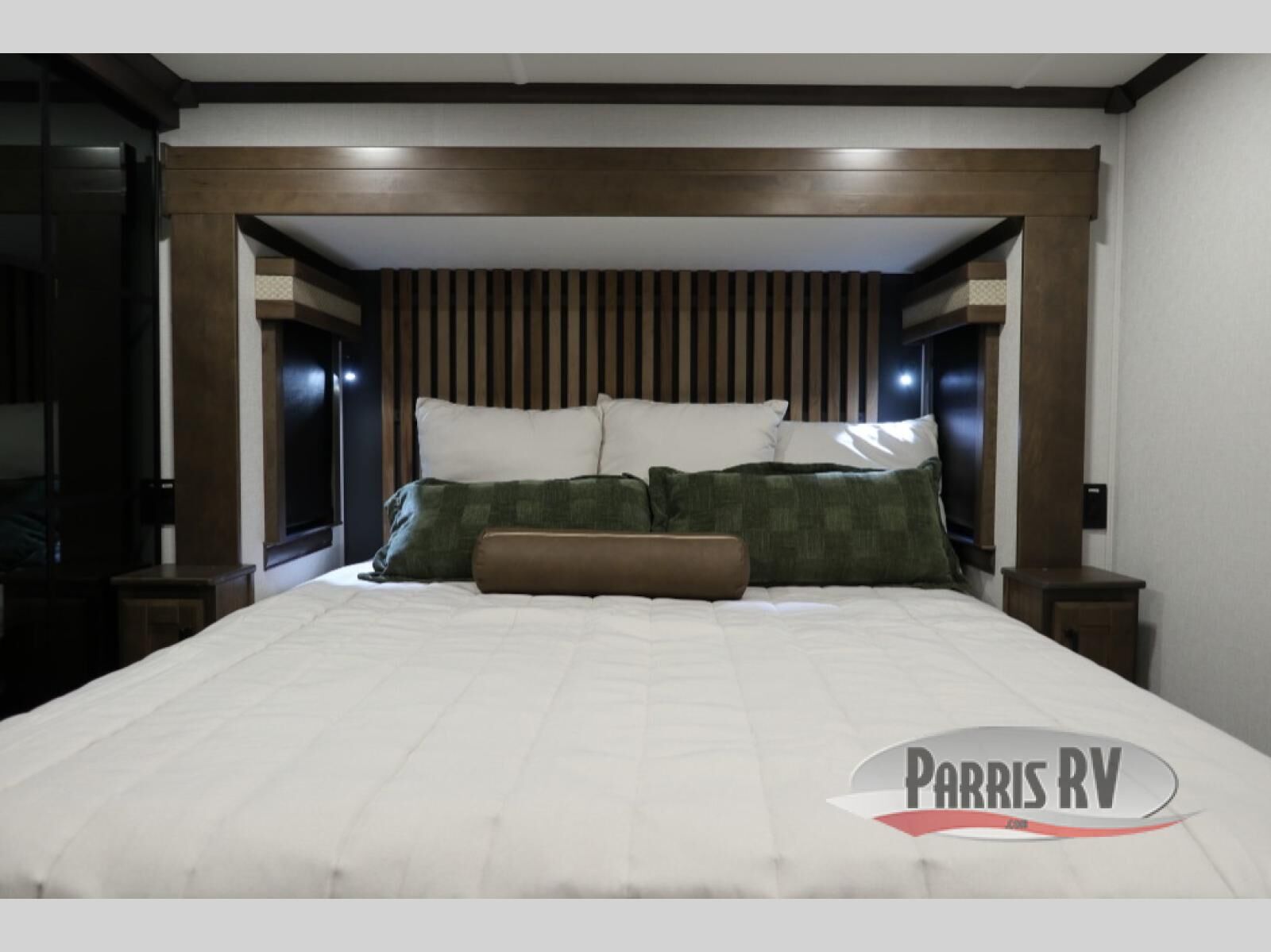 You will feel right at home in this fifth wheel! The rear private bedroom has a 72" x 80" king bed slide for a good night's rest, a rear large wardrobe with the washer and dryer next to it, and even a dresser with a 40" LED TV. And two can get ready at once in the full bathroom with the dual sink vanity. You can then head to either the desk slide to get some work done or whip up some scrambled eggs on the three burner cooktop at the island in the front kitchen. The kitchen even has a dishwasher for easy clean up and two bar stools at the high top dinette that overlooks the middle living area. Relax each night in true comfort on either the E-Z Glide sofa bed slide or the theater seating across from the entertainment center which has a fireplace and 65" Samsung LED Smart TV to watch your favorite movies!