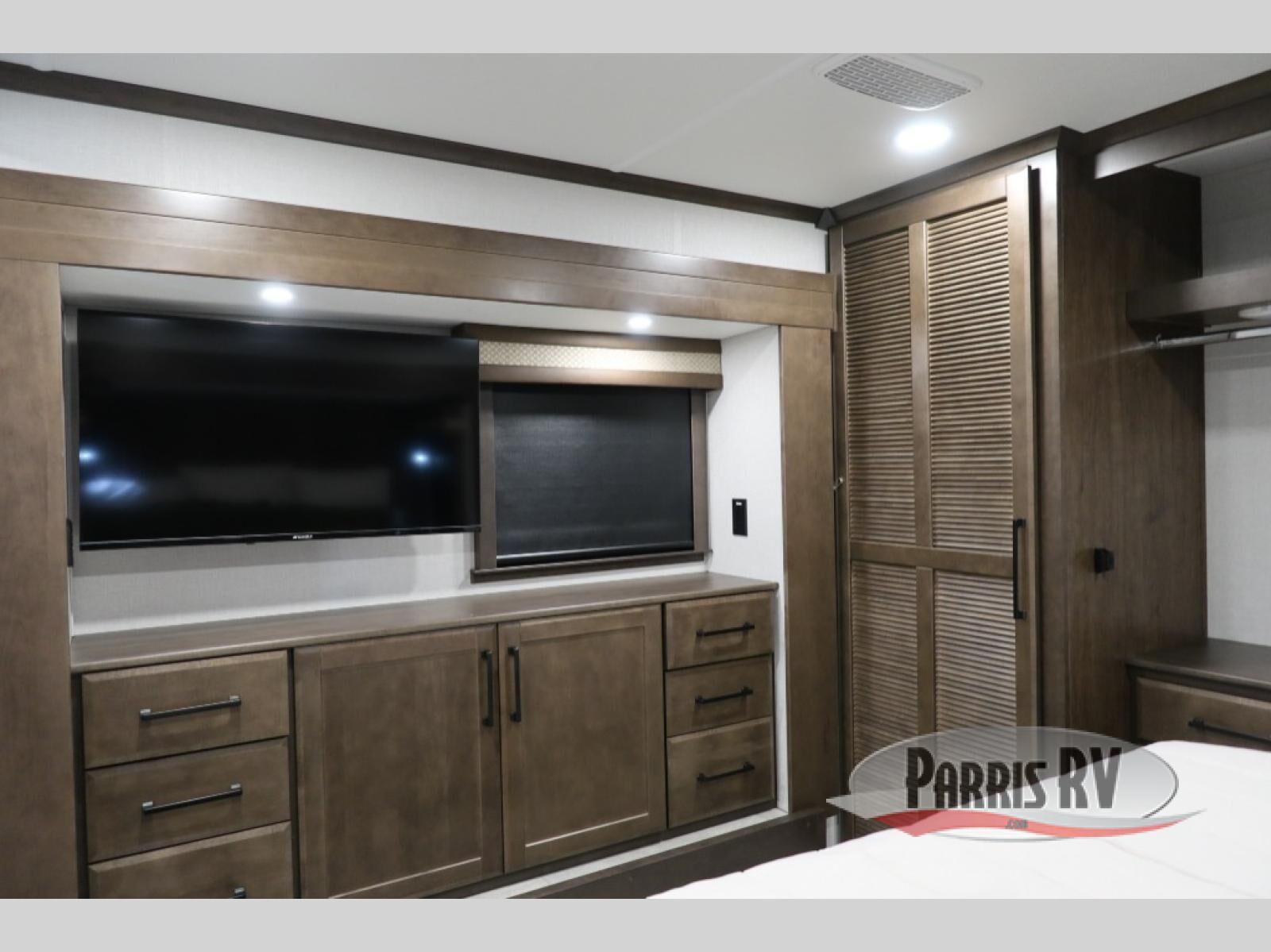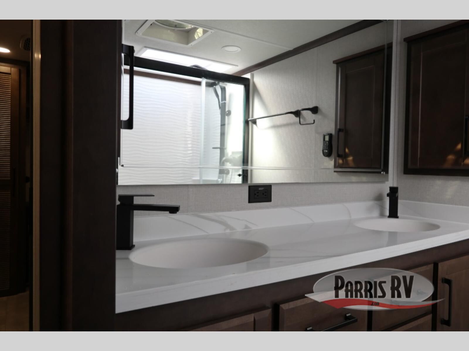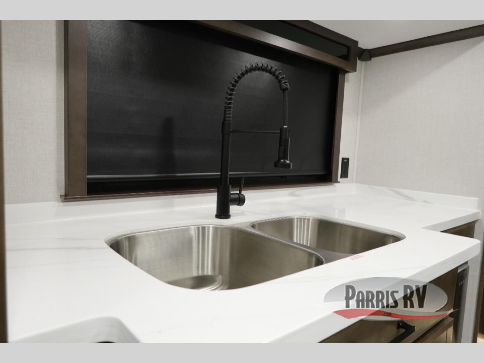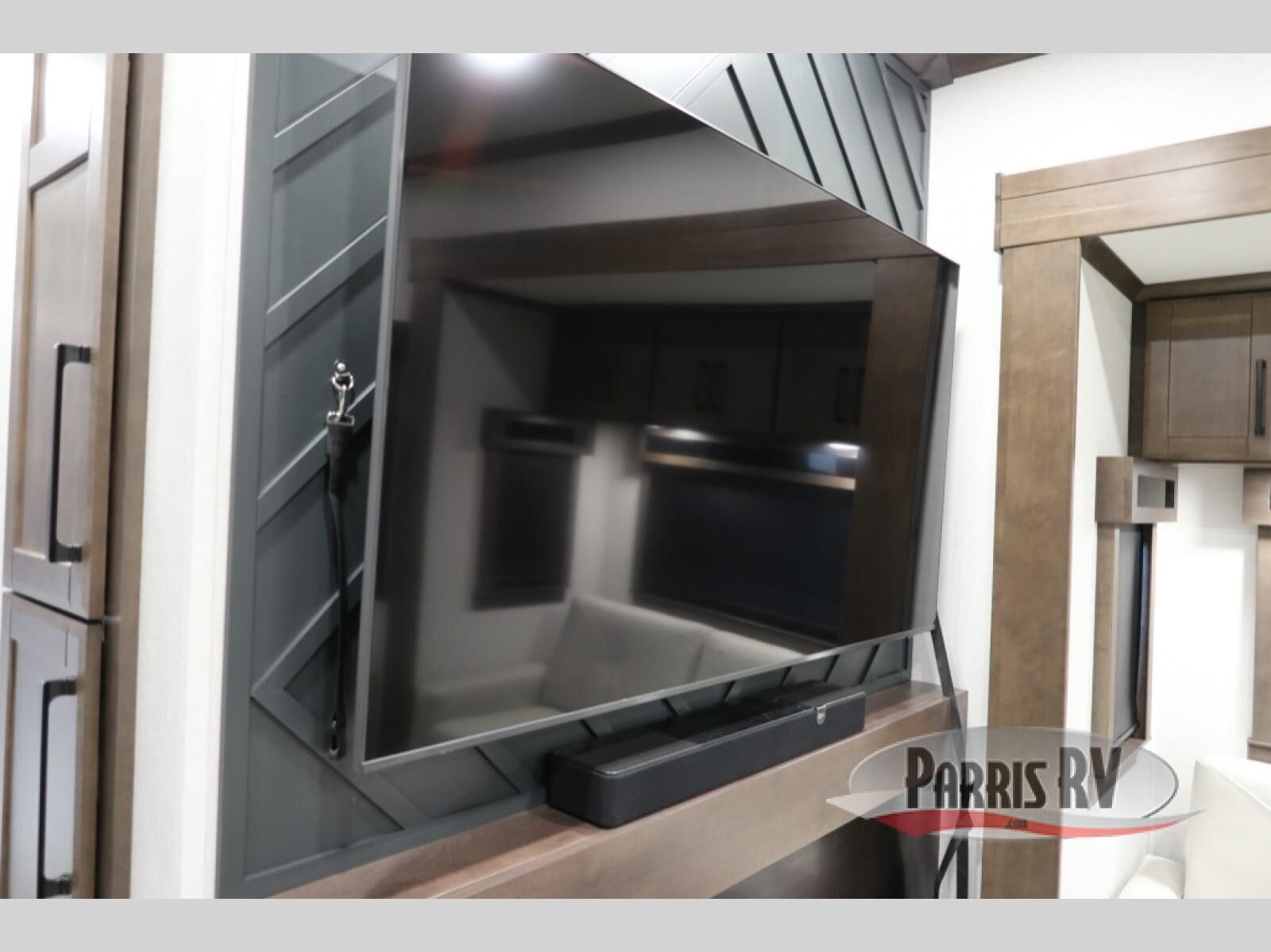 You will feel right at home in this fifth wheel! The rear private bedroom has a 72" x 80" king bed slide for a good night's rest, a rear large wardrobe with the washer and dryer next to it, and even a dresser with a 40" LED TV. And two can get ready at once in the full bathroom with the dual sink vanity. You can then head to either the desk slide to get some work done or whip up some scrambled eggs on the three burner cooktop at the island in the front kitchen. The kitchen even has a dishwasher for easy clean up and two bar stools at the high top dinette that overlooks the middle living area. Relax each night in true comfort on either the E-Z Glide sofa bed slide or the theater seating across from the entertainment center which has a fireplace and 65" Samsung LED Smart TV to watch your favorite movies!