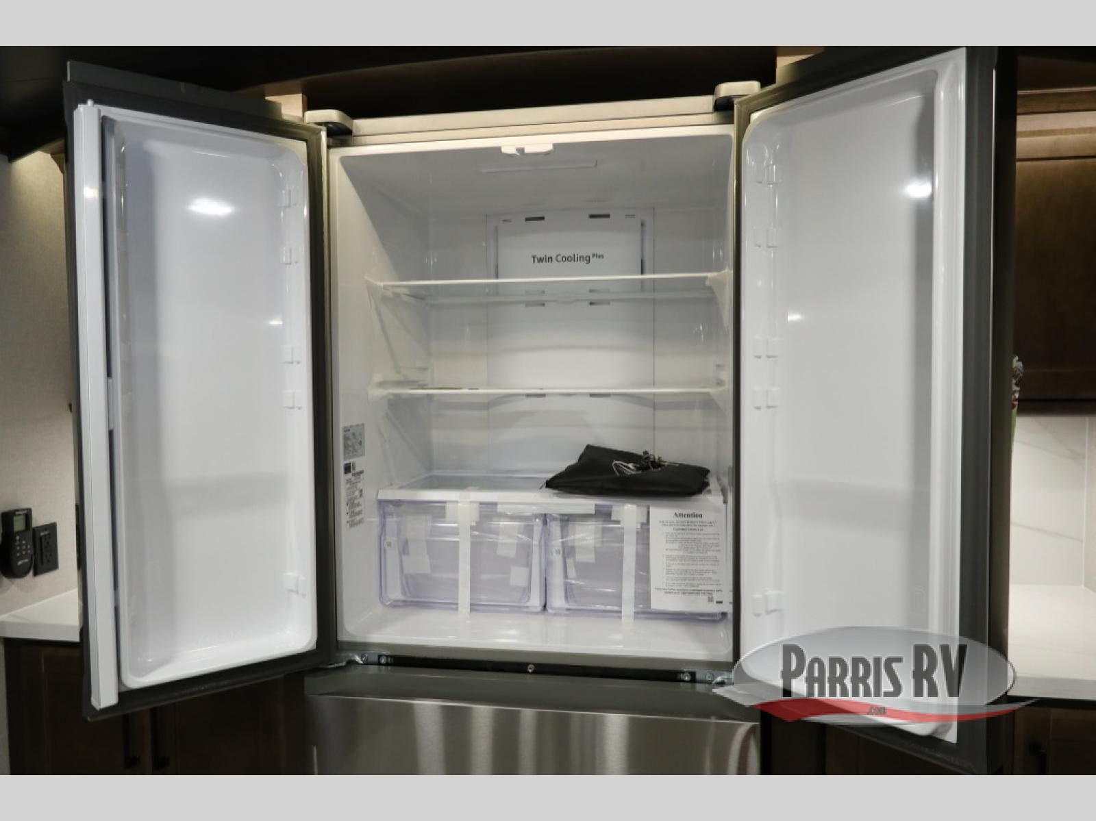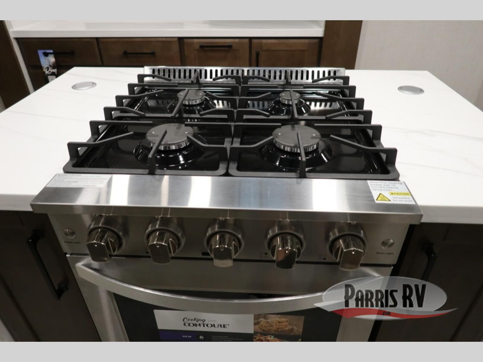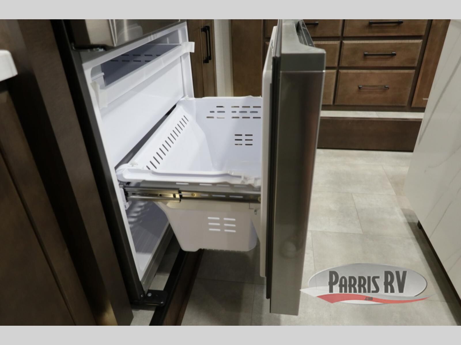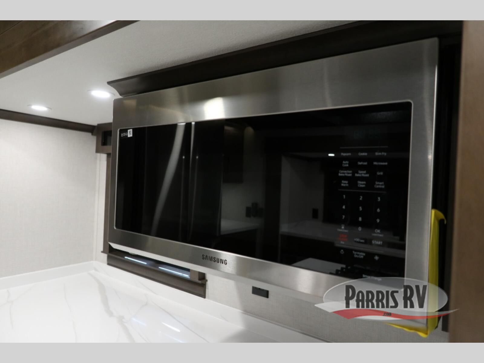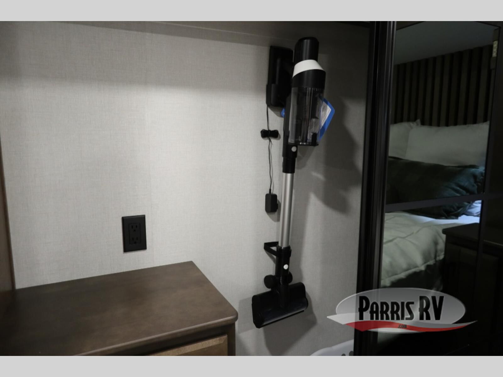 You will feel right at home in this fifth wheel! The rear private bedroom has a 72" x 80" king bed slide for a good night's rest, a rear large wardrobe with the washer and dryer next to it, and even a dresser with a 40" LED TV. And two can get ready at once in the full bathroom with the dual sink vanity. You can then head to either the desk slide to get some work done or whip up some scrambled eggs on the three burner cooktop at the island in the front kitchen. The kitchen even has a dishwasher for easy clean up and two bar stools at the high top dinette that overlooks the middle living area. Relax each night in true comfort on either the E-Z Glide sofa bed slide or the theater seating across from the entertainment center which has a fireplace and 65" Samsung LED Smart TV to watch your favorite movies!