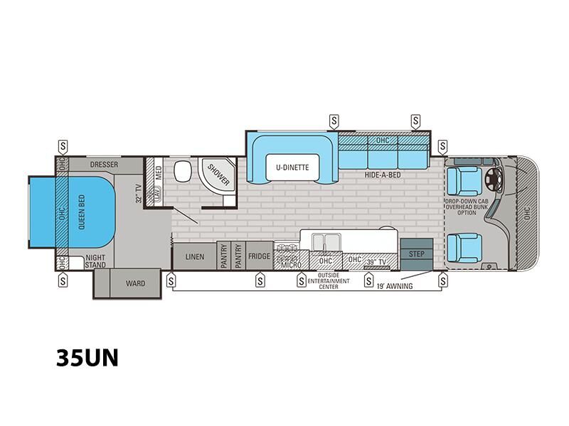 The 35UN floorplan creates an open living space with slide-out expansion and a private rear bedroom. The living area includes a jackknife sofa and booth dinette for flexible seating and sleeping. The galley offers solid-surface countertops, 3-burner cooktop, convection microwave, double sink, and a gas/electric refrigerator. The bedroom features a queen bed with dual wardrobes and storage. The full bath provides a shower, toilet, and vanity. Exterior entertainment and a power patio awning round out this well-equipped coach.