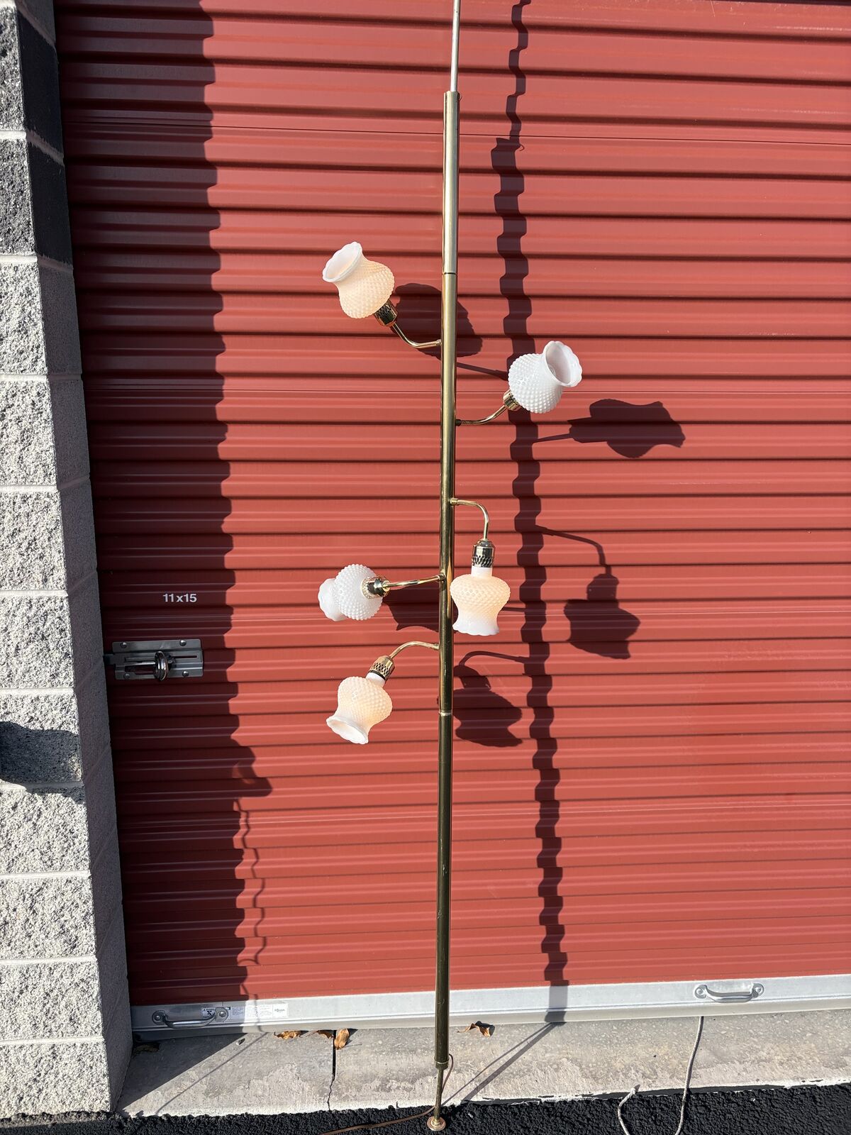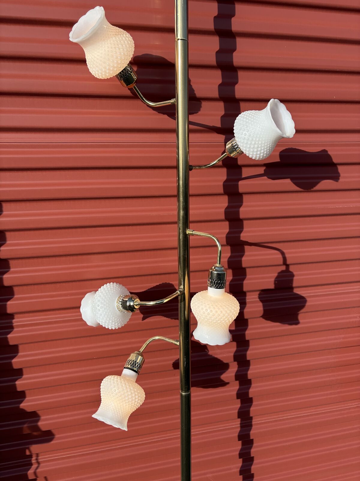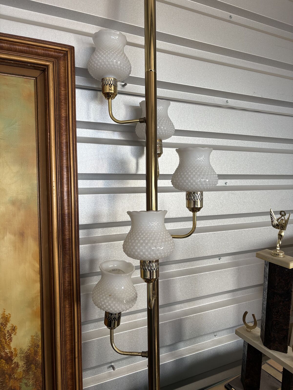 VenmoVintage Mid Century Tension Pole Lamp, floor to ceiling, milk glass. All of the glasses sconces are still in tact!