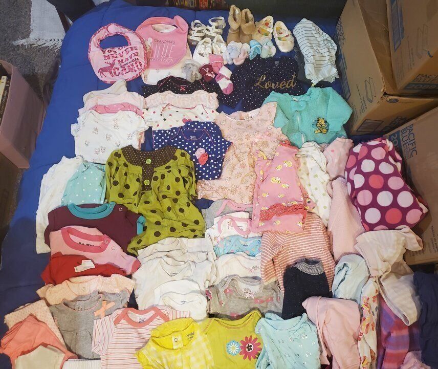 baby girl clothes 3 months up to 1 year. good condition a few may have stains Socks shoes Bibs onesie dresses jackets pants tights shirts there are 85 items $80 for all of it cash only
