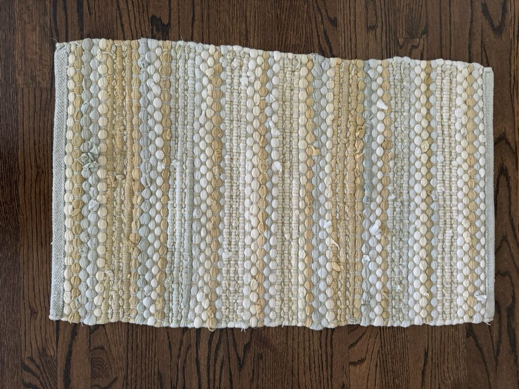 Venmo31 1/2” x 19 1/2 hand woven rag run in striped pattern in yellow, beige, and light blue. Made from recycled cotton and suitable for high-traffic areas.