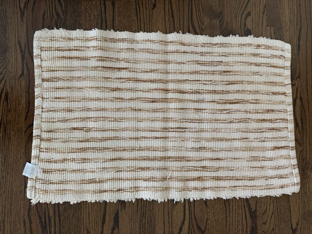 21” x 34” striped white, tan, and brown throw rug. 100% cotton. Machine wash cold. Soft feel.