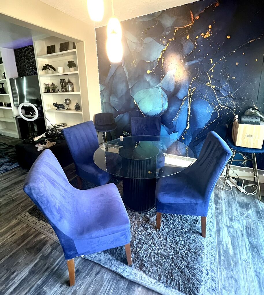ZelleDining Glass Round Table with 4 cushioned Chairs. In great condition. No damage, pet free, smoke free. Asking $200 OBO cash