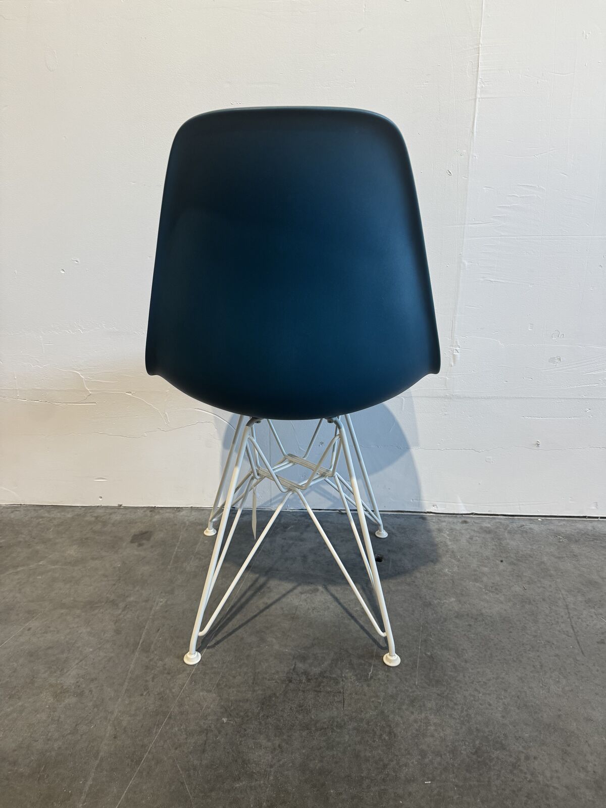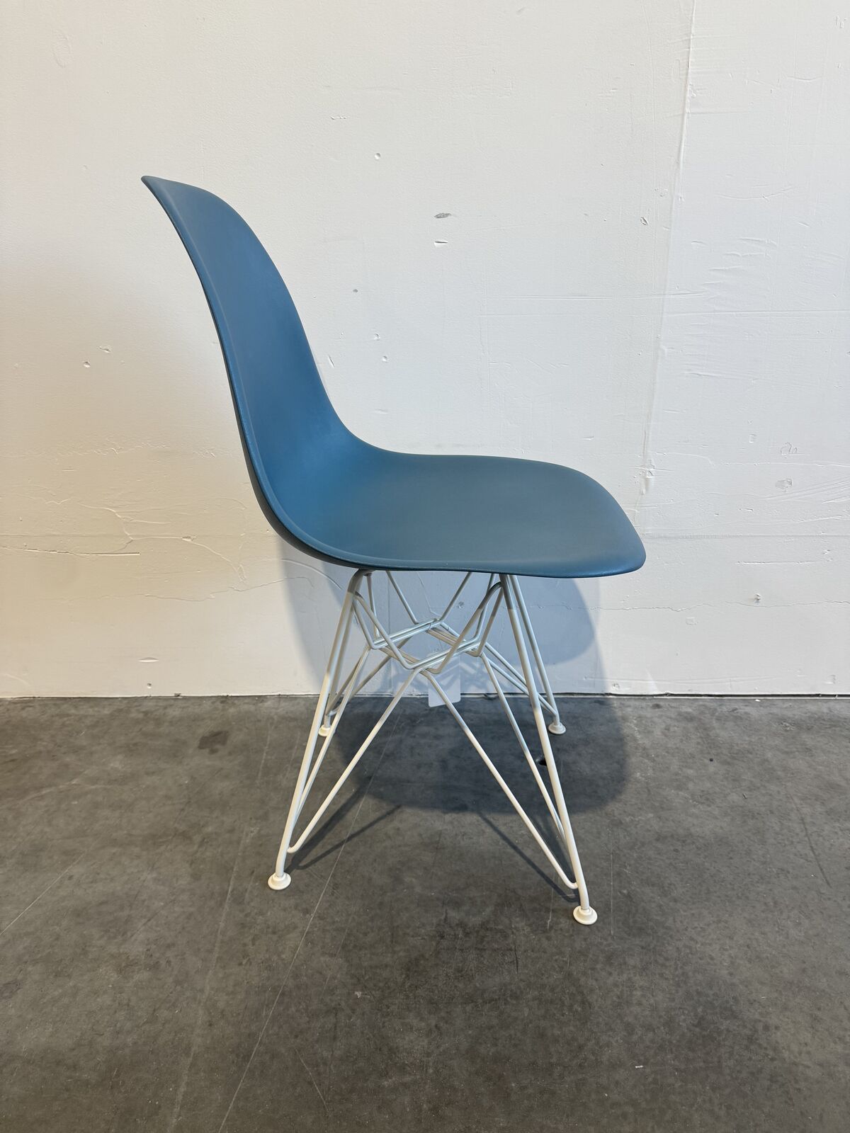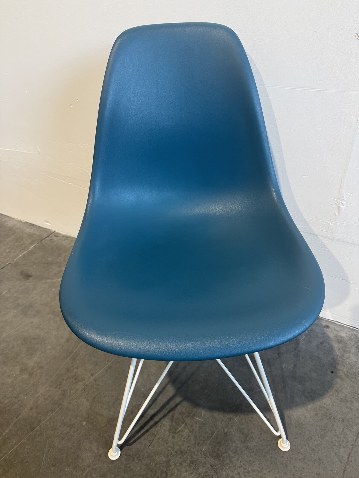 Office cafe side chair with plastic seat and white metal legs by Eames. 5 chairs available.