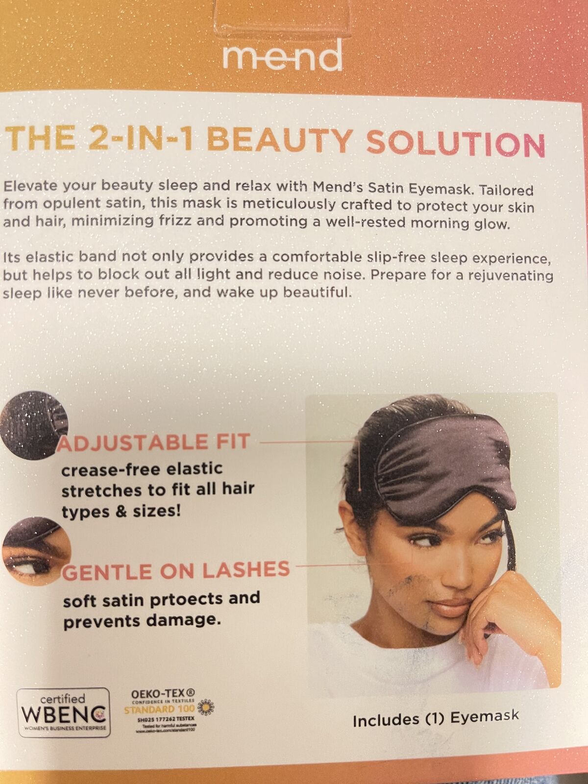 MEND 100% black satin eye mask, minimizes frizz, made by women, gentle on eyelashes, blocks light, adjustable