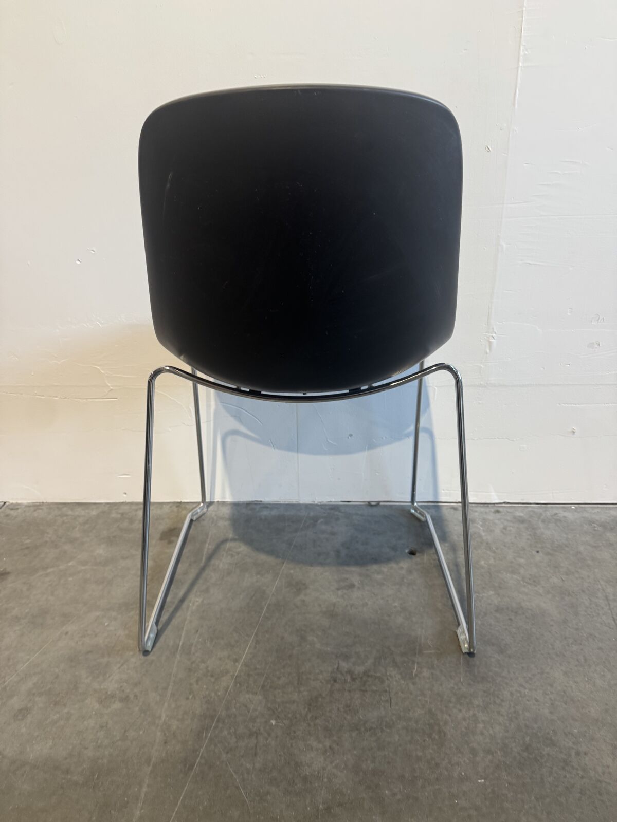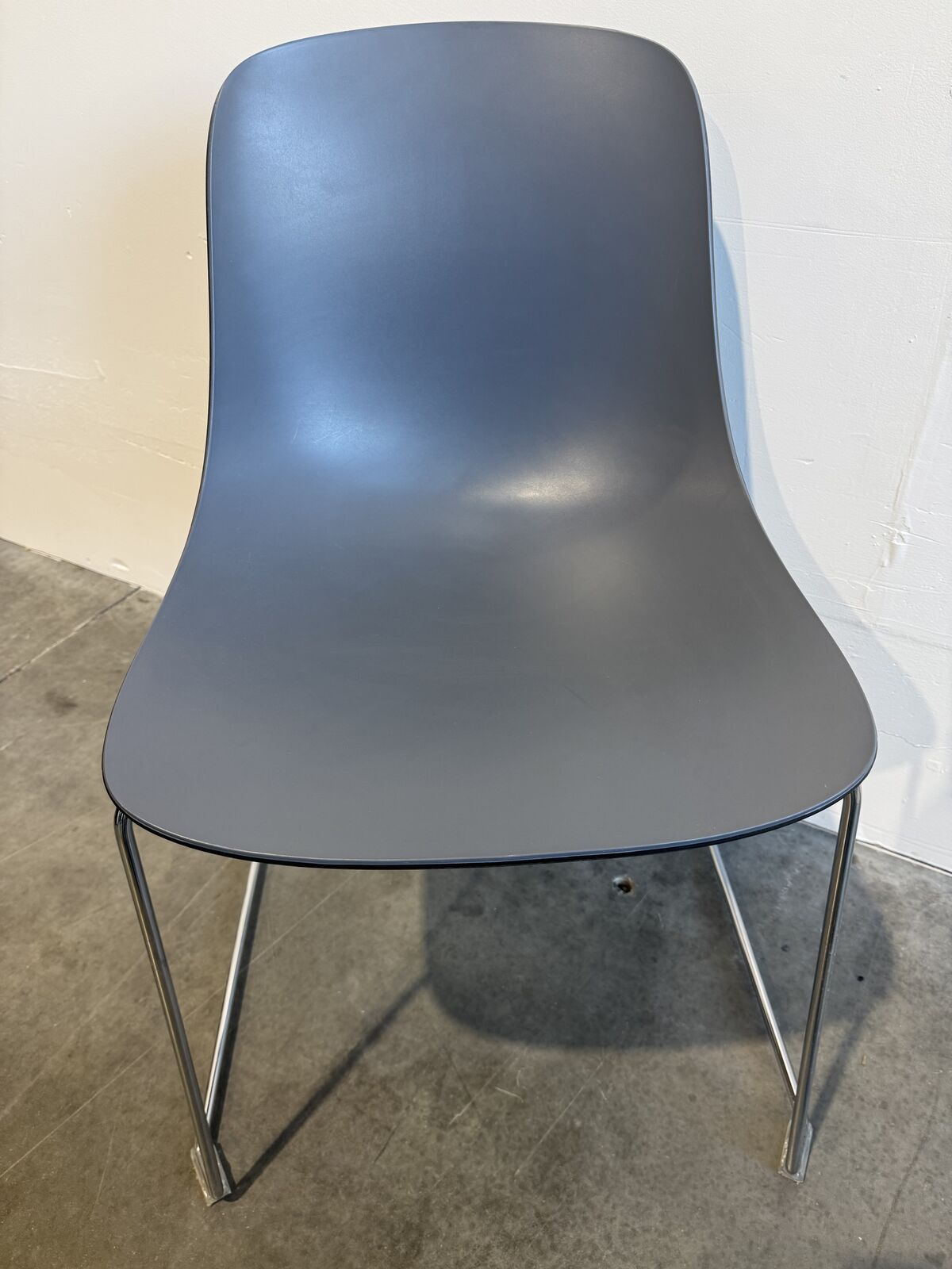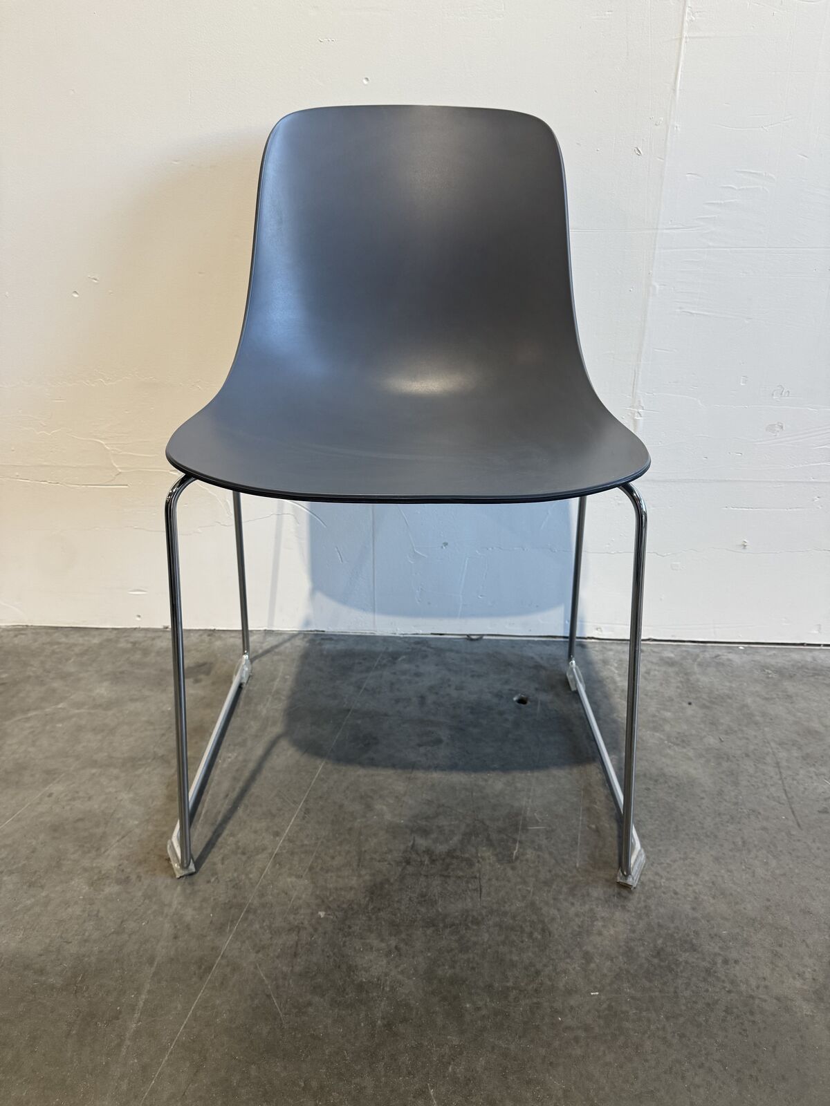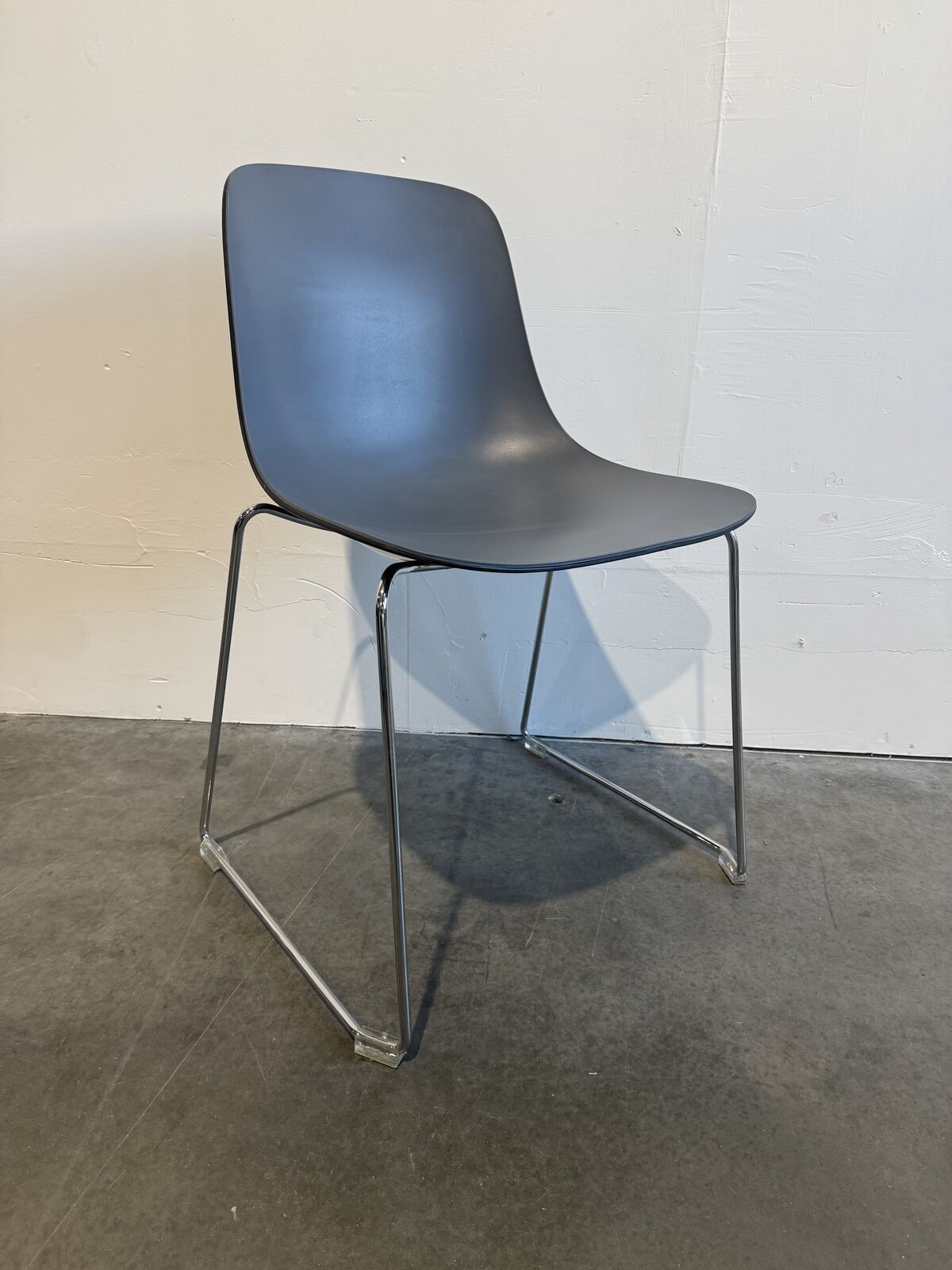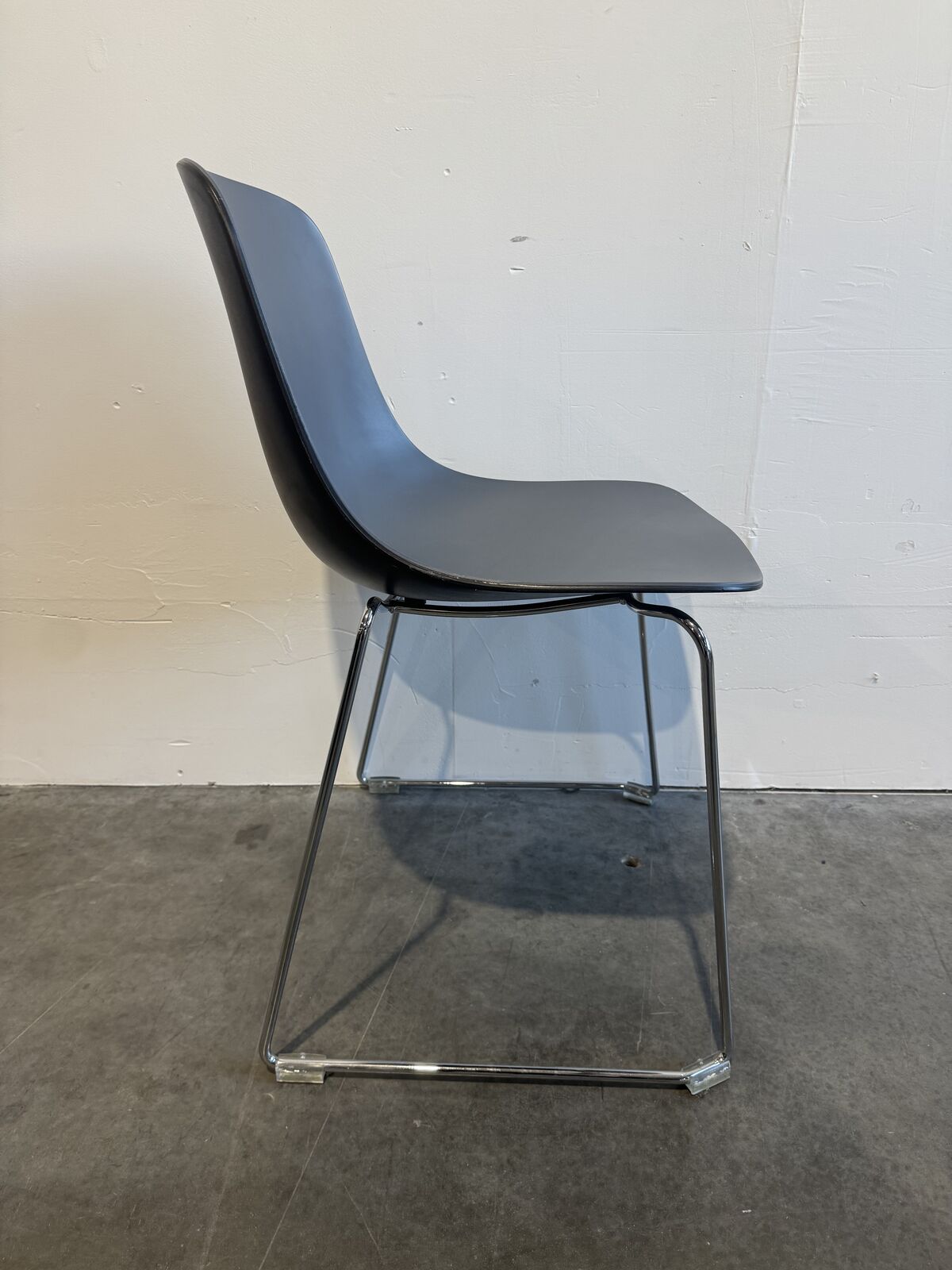 Office cafe side chair with plastic seat and chrome legs by SOURCE. 7 chairs available.