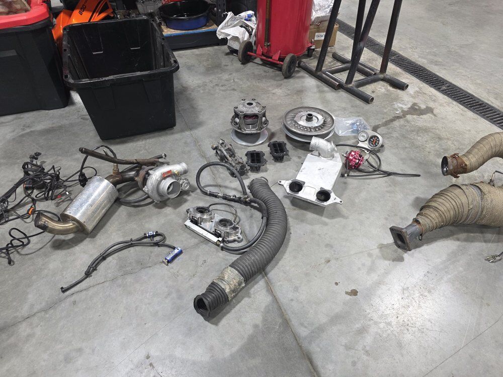 Comes with both clutches and turbo clutching (no weights), a stock pipe with a turbo flange welded on, all wiring needed, a boost controller (manual adjustment), upgraded reeds (Axys style, drop in upgrade for the Pros) and boost/AFR gauge setup