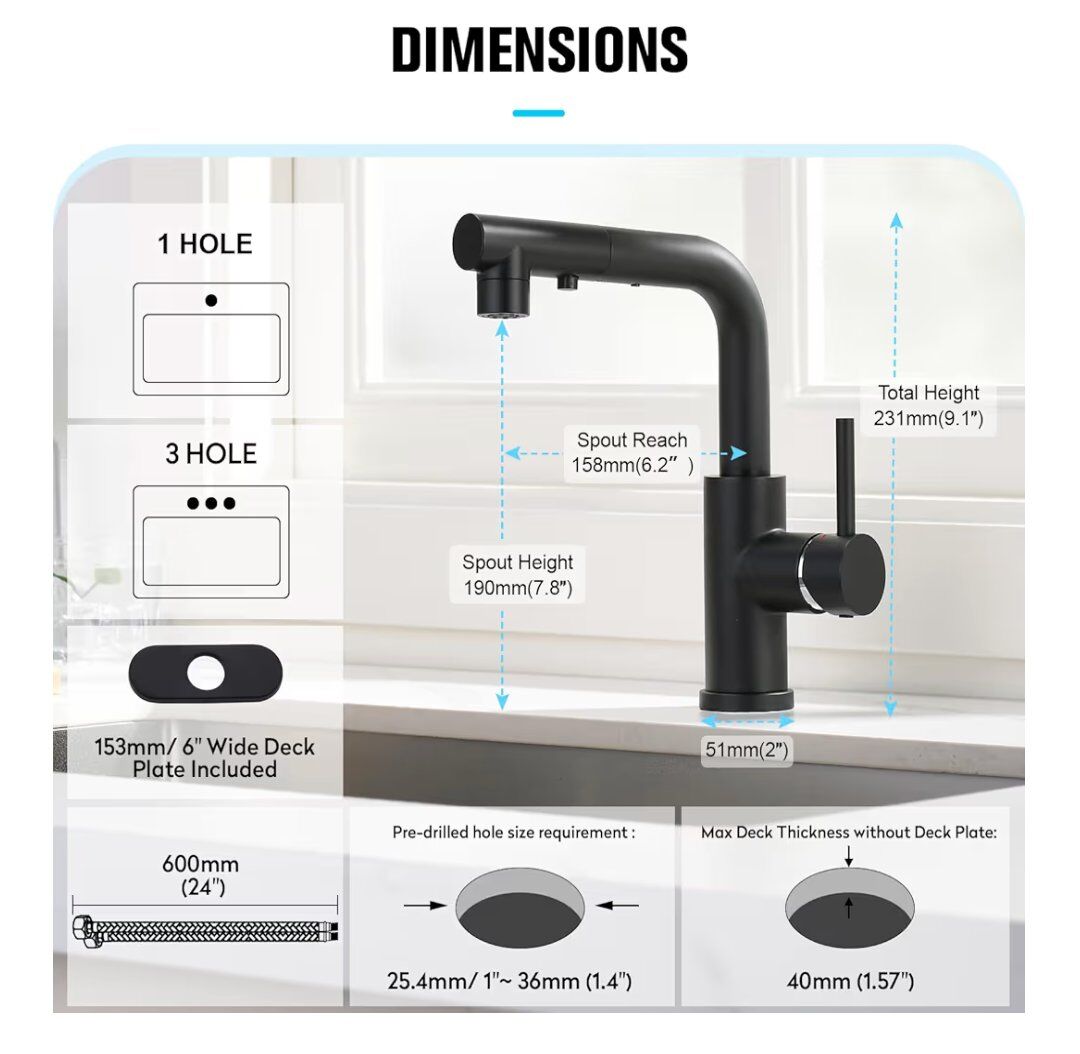 website description: Design & Operation: Single handle pull-down faucet with three spray modes - stream, spray and pause. 360-degree swivel spout provides full sink coverage. Made of premium grade lead-free BRASS material Construction: Ceramic disc valve cartridge for smooth operation. Surface-mounted installation requiring one 1.4-inch hole Included Components: 19.7-inch hot and cold water supply lines with 3/8-inch female compression threads. Pull-out sprayer with automatic retraction and counterweight