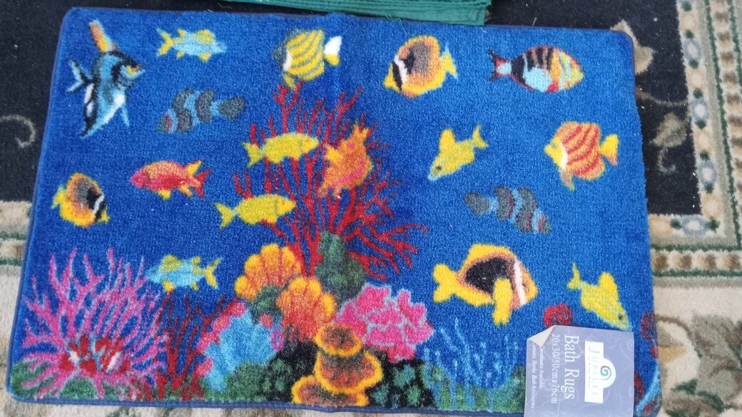 Venmo(Price reduced on 12/8) Up for sale is one Jubilee Ocean Fish Bath Rug & Plain Green Shower Curtain. The rug is in good condition with cracking and disintegrating on the creese of the rubber backing. The shower curtain is in great condition with minor stains.