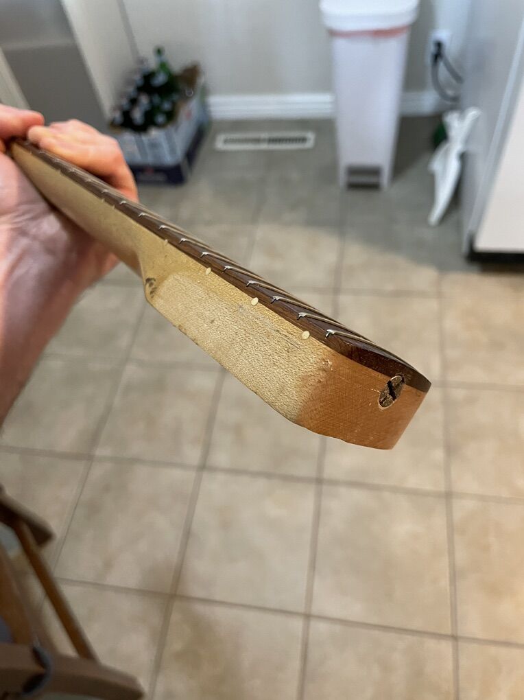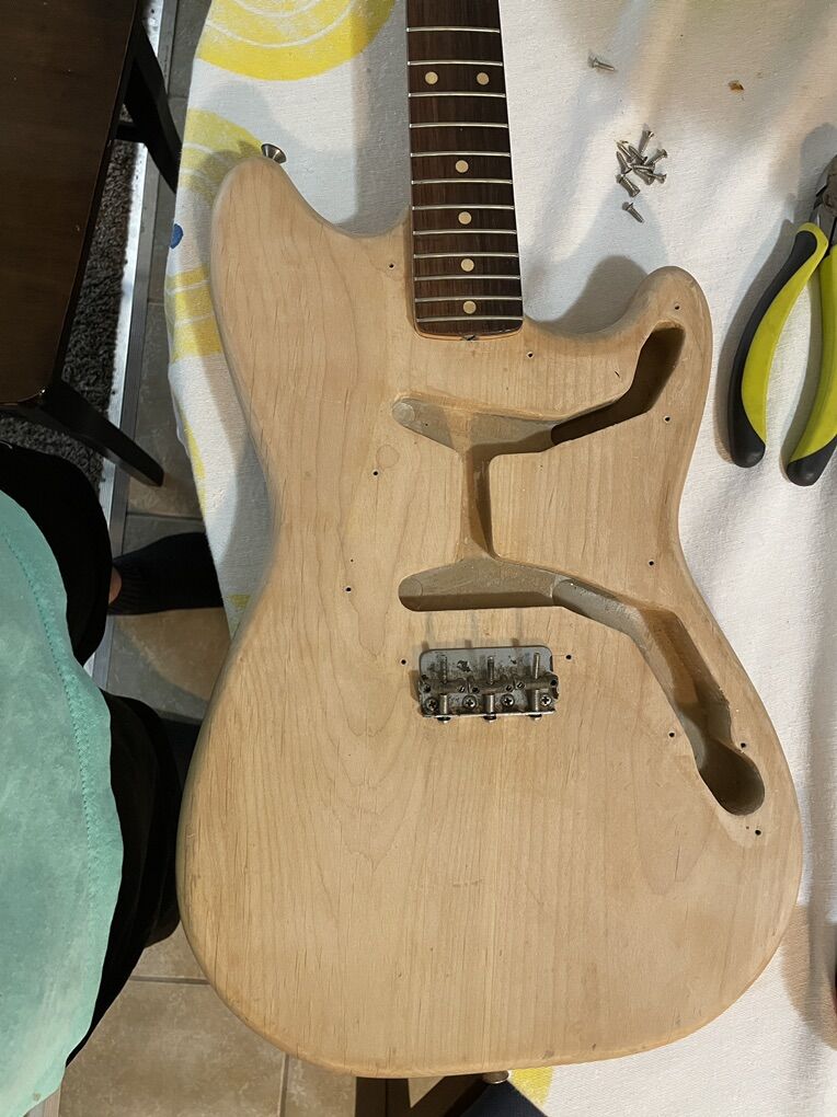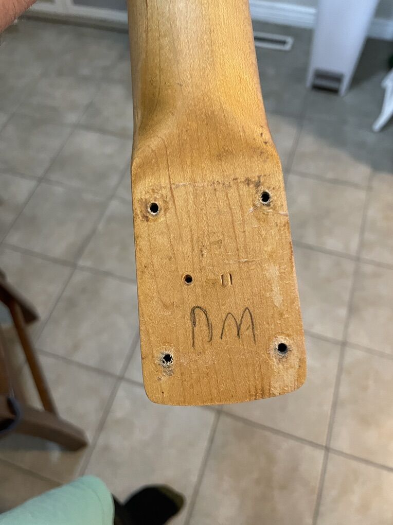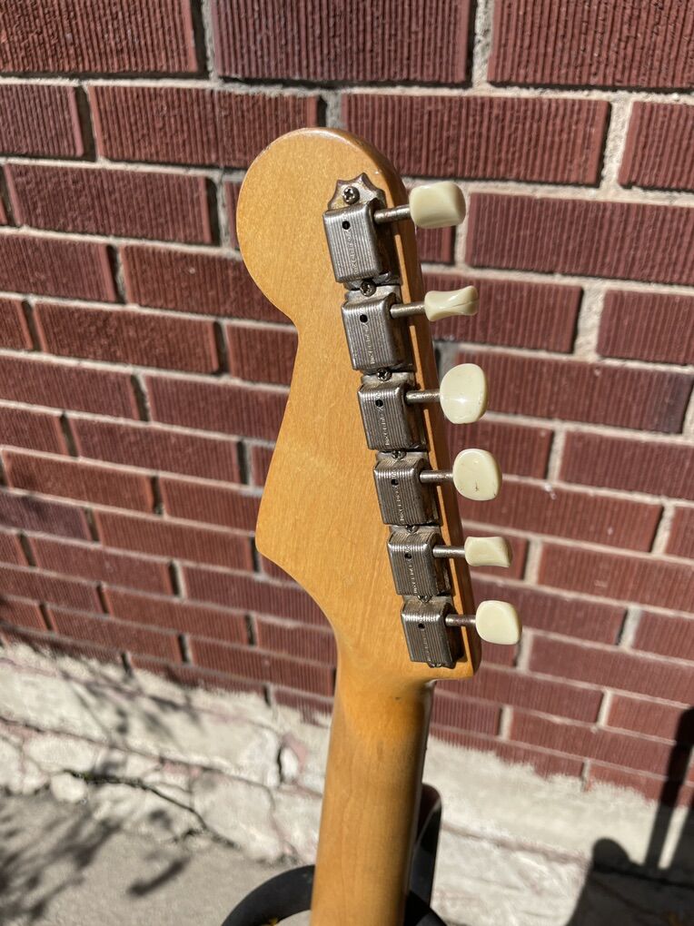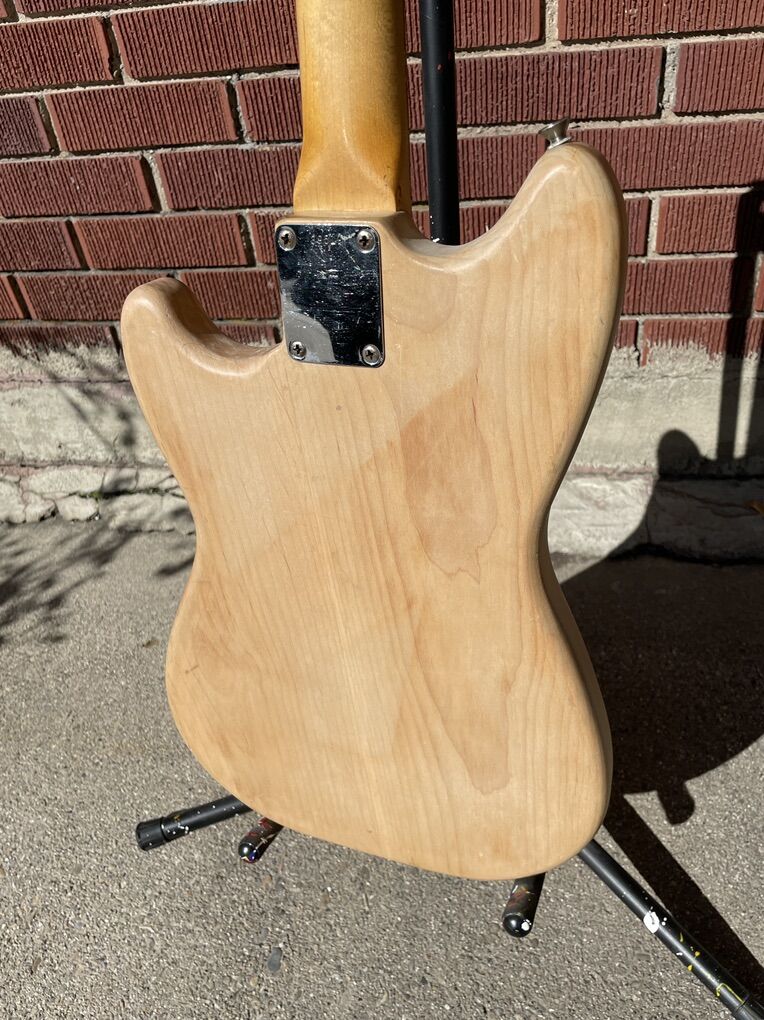 Up for sale is an original 1959 Fender Musicmaster. Everything on it is original except for the pickups and the 3-way switch. The original Desert Sand finish was sanded off many years ago, but the pickguard, hardware, and wood is all original and in good shape. The guitar was recently set up and plays great. The neck is very comfortably worn, but the original frets are still in great condition.