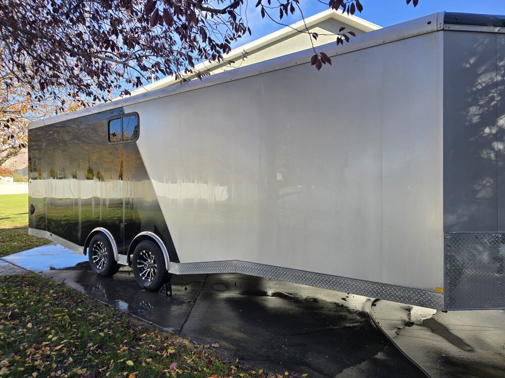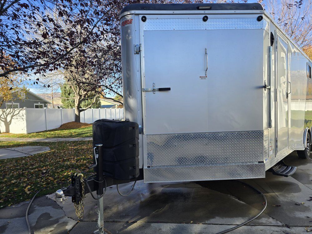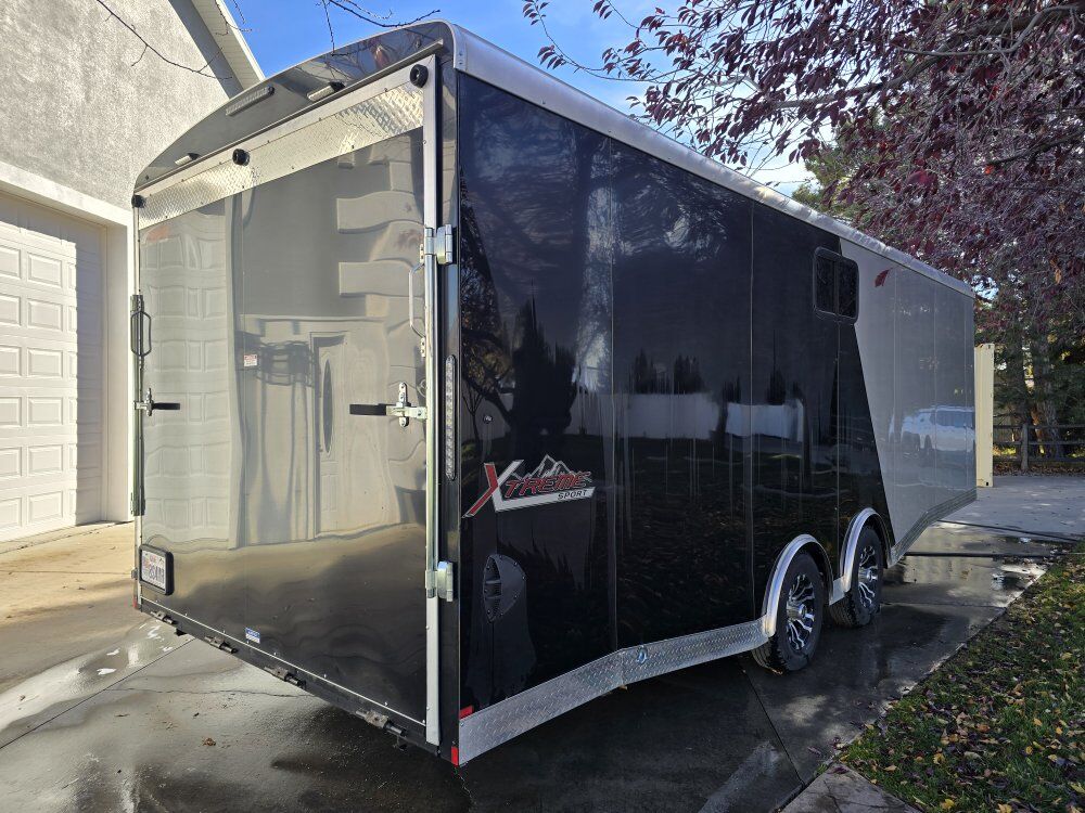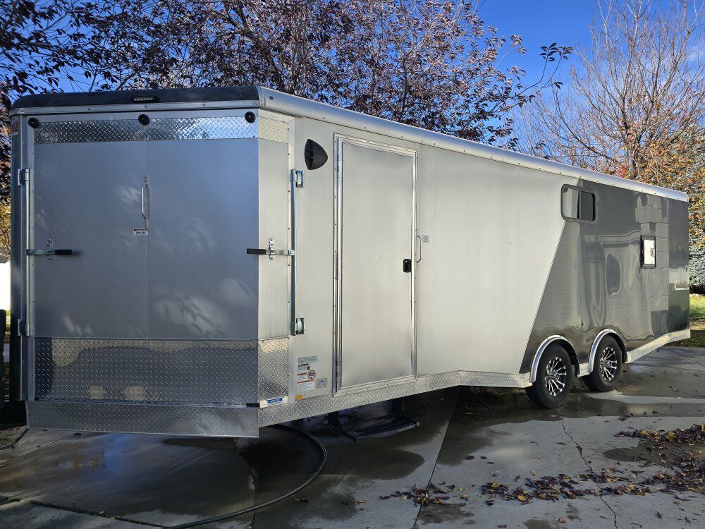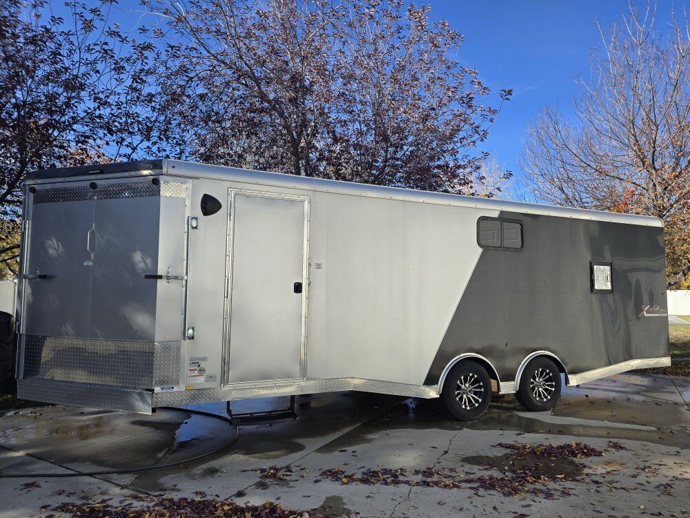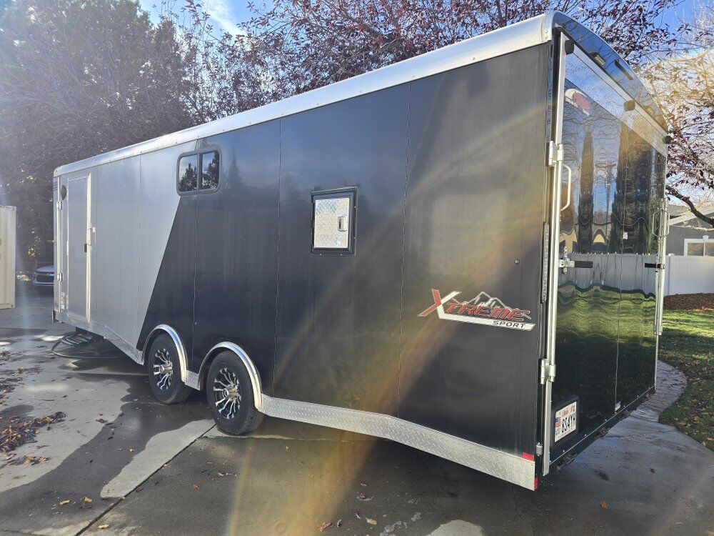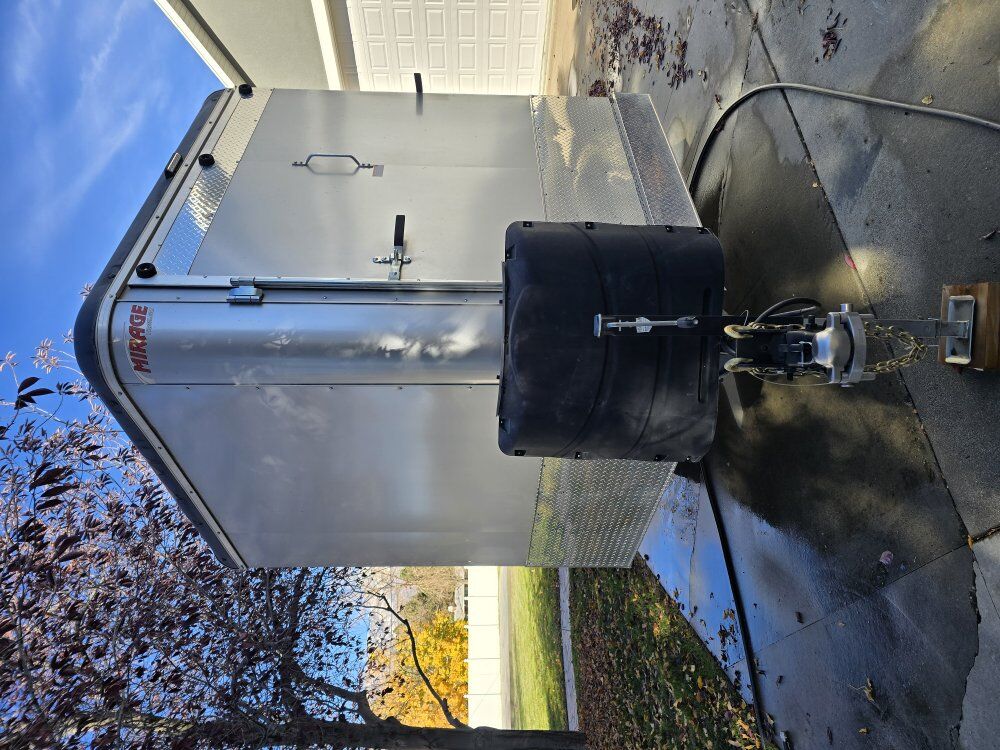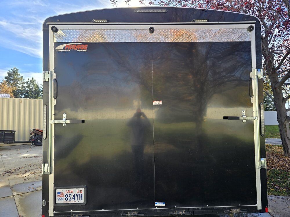 VenmoLIKE NEW 2022 Mirage Xtreme Sport Deluxe Package 8.5x28 7'6" Interior 10K Enclosed Snowmobile Trailer... features include Radiant propane heater, 4' front helmet cabinet, tie down track in floor, utility shelf and coat rack, 12 volt USB outlet, insulated walls and ceiling, extra wide 72" wrap around front ramp door built into a 4' long V-nose for the widest ramp exit radius in the industry, fully finished interior (vinyl walls, vinyl ceiling, Nudo Floor and Ramp Door), spare tire and underchassis mount, front and rear loading lights, windows and more!