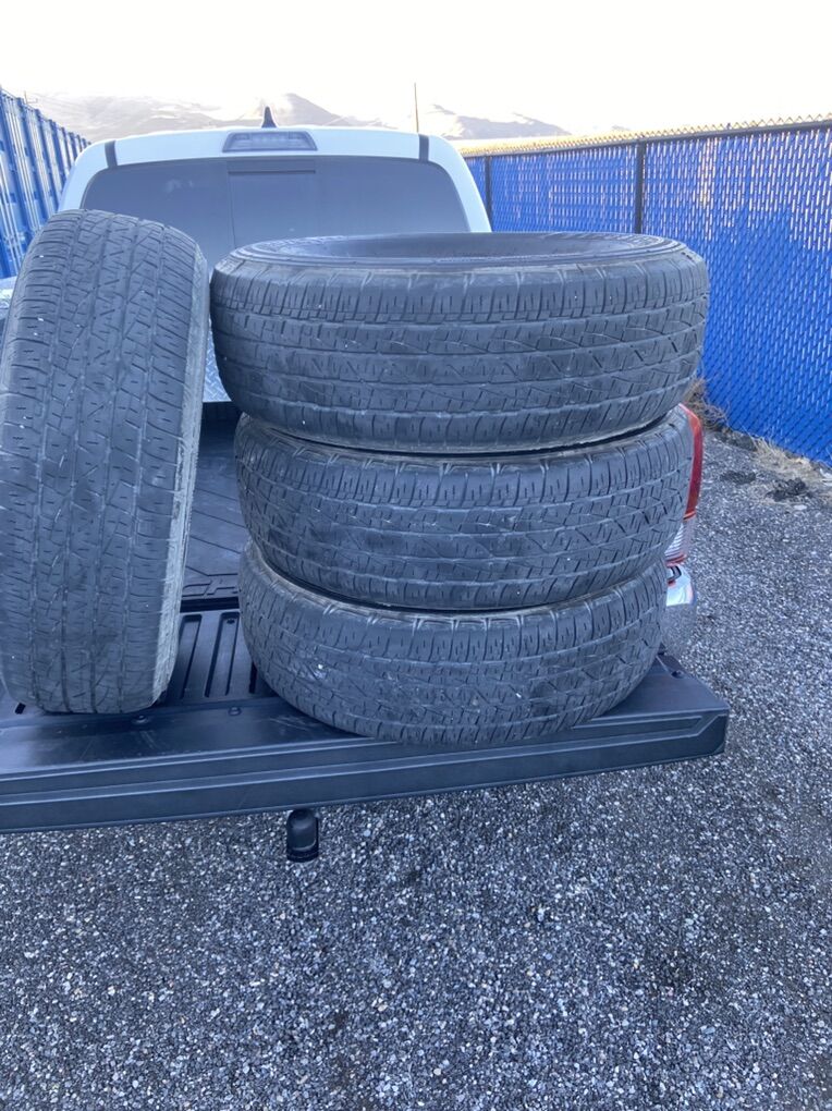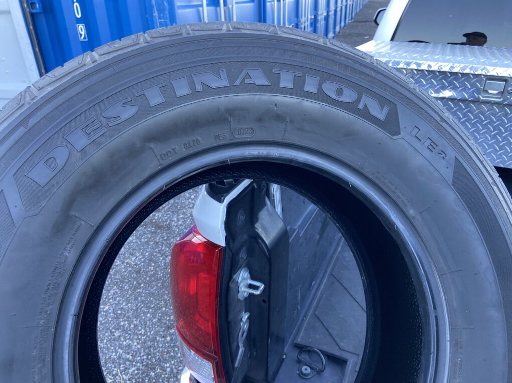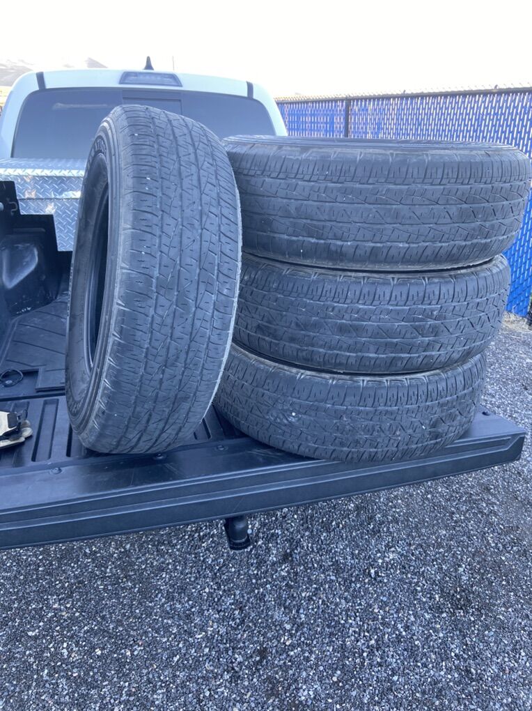 Full Set of 4 tires for $100.00 Firestone Destination LE2 off my 2023 Toyota Tacoma. Manufacture warranty is 60,000 miles. This has 30,000 miles left on the tread. These same tires sell for $175.00 each at Walmart brand new. I’m selling this entire set for $100.00 You won’t find a better deal than these. Tires have worn evenly and have been rotated every 5,000 miles per manufacture recommendation.