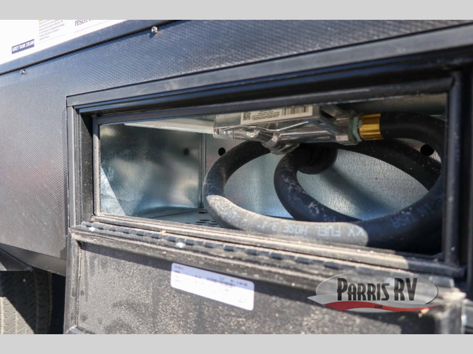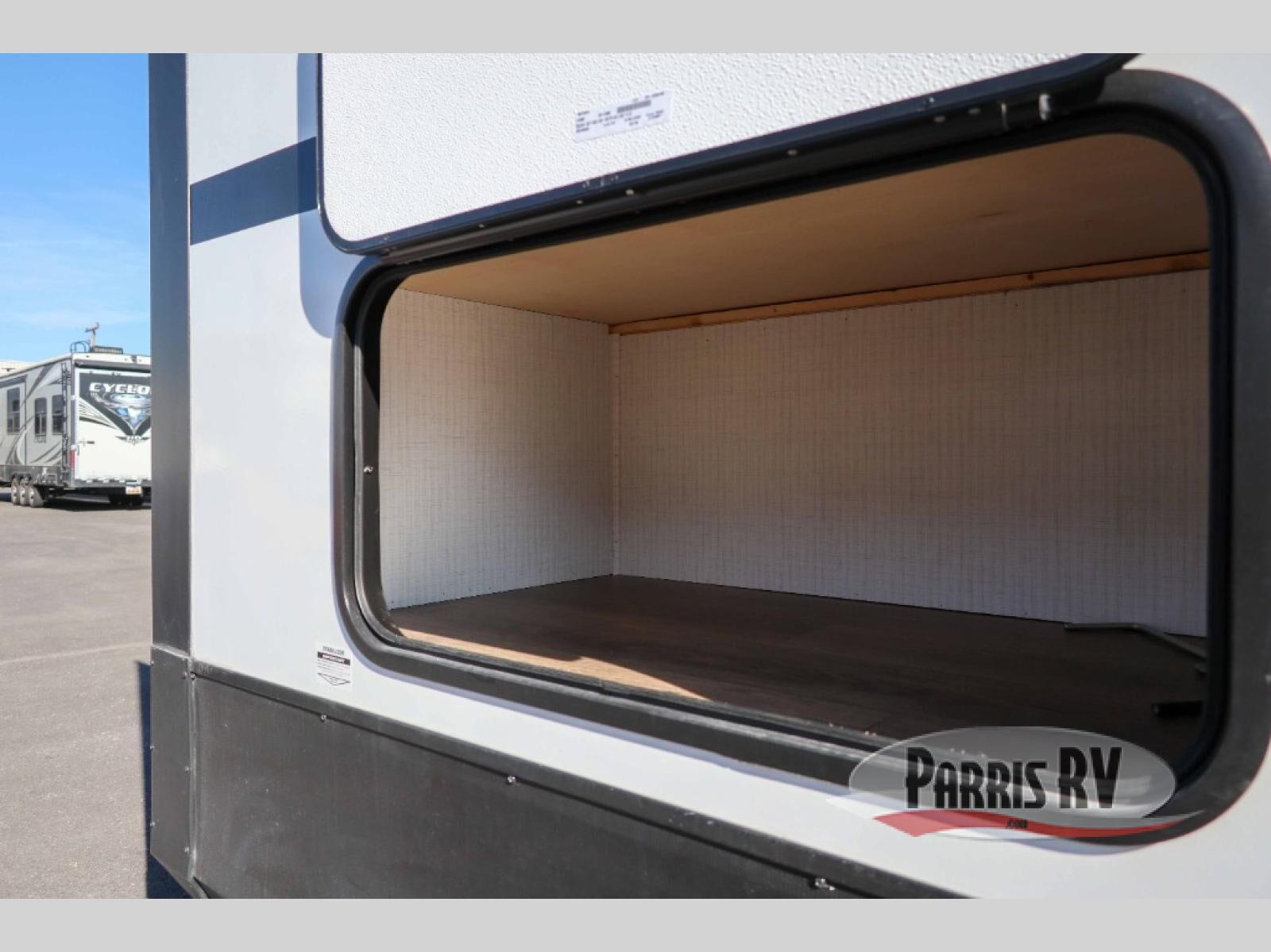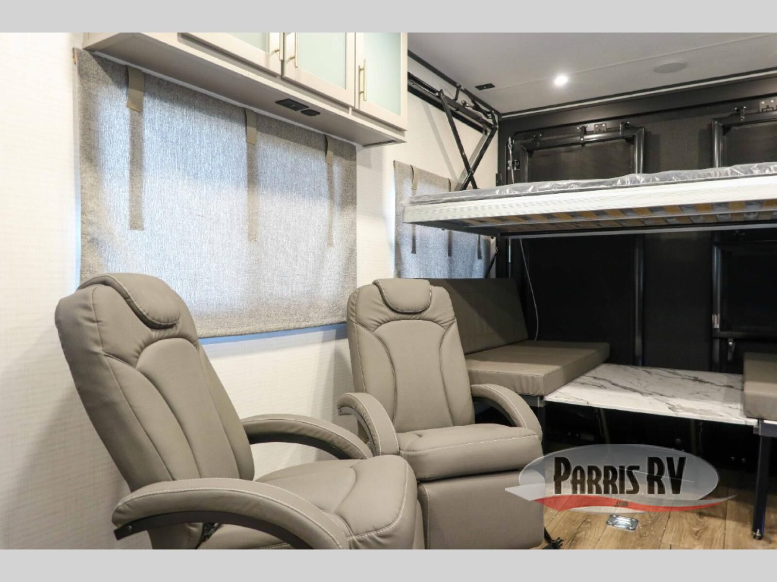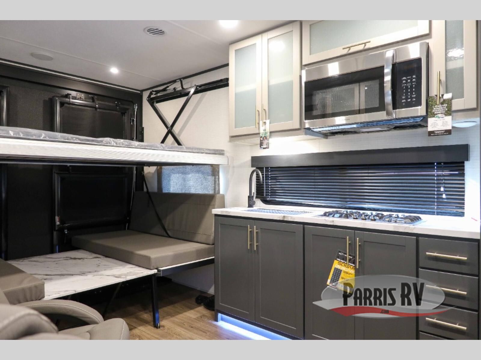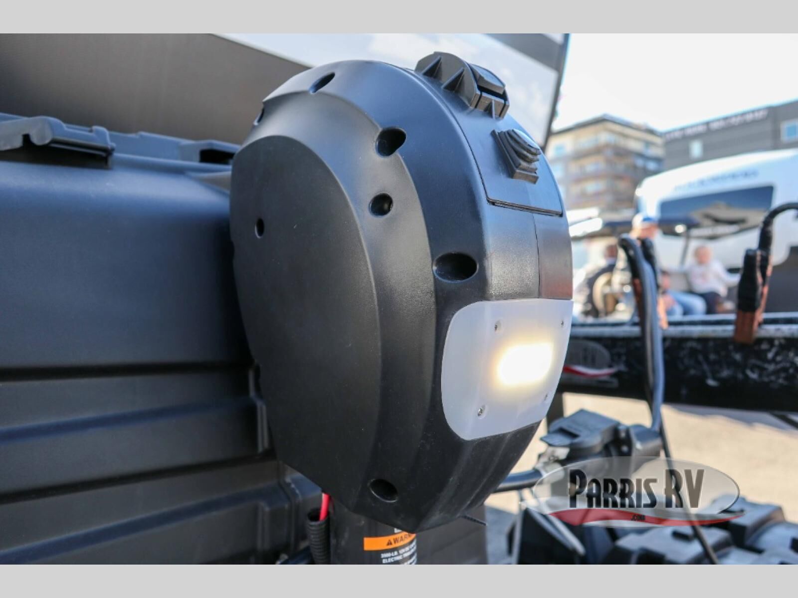 Bring your favorite off-road toys with you in this toy hauler to your favorite camping spots! The 14' garage includes opposing sofa sleepers with a removable dinette table to create a queen bed sleeping area, plus a Euro bed above for your guests to sleep on. The front of this toy hauler is shared with the master bedroom and dual entry bath you are sure to love, plus there is a dresser with a mirror to get ready each day. The exterior has many features you will love like the docking station, 15' power awning, and the outside storage areas!