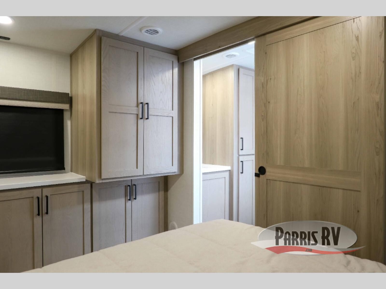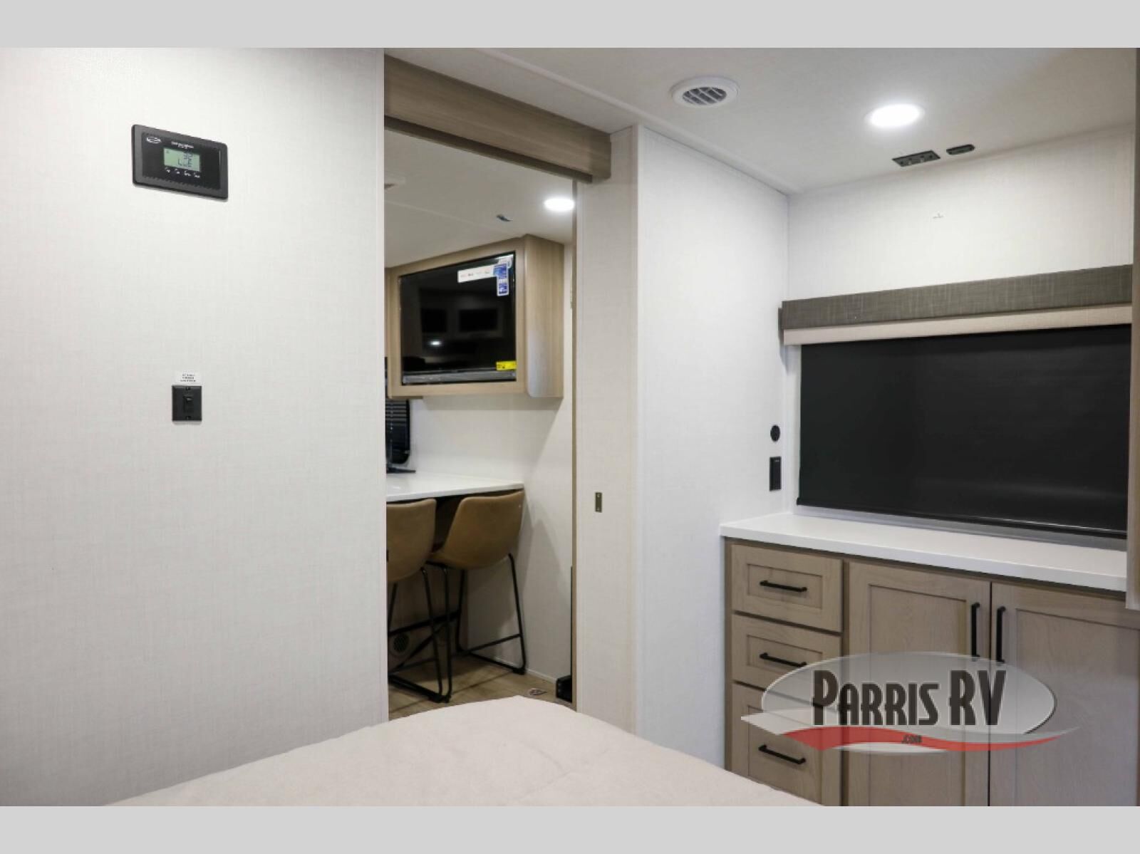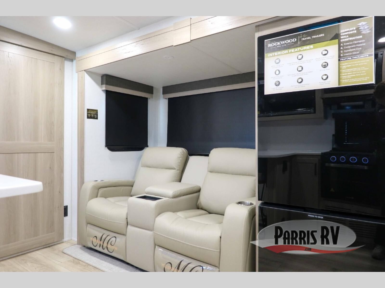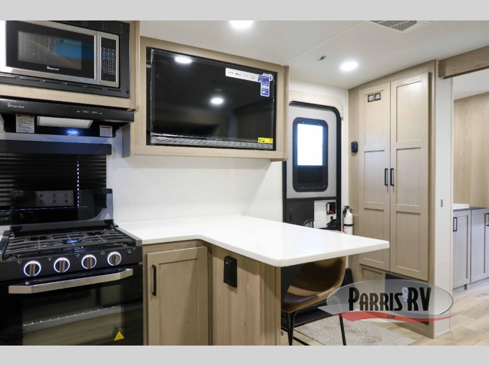 This travel trailer is the best option for you and your partner! The lavish full rear bathroom features a spacious layout and a convenient linen closet, perfect for relaxation and refreshment. The elegant bedroom boasts a plush queen bed, ample wardrobe space, and stylish dresser, creating a serene retreat. The spacious living room and kitchen combined area is the heart of the trailer, featuring plush theater seating for cozy movie nights, a generous closet for storing essentials, and a 12V Smart TV for entertainment on the go. Plus, the expansive countertop with chairs provides a perfect spot for gourmet meals or socializing, while the premium three-burner cooktop, well-stocked kitchen pantry, and high-performance microwave make meal prep and cooking a true delight.