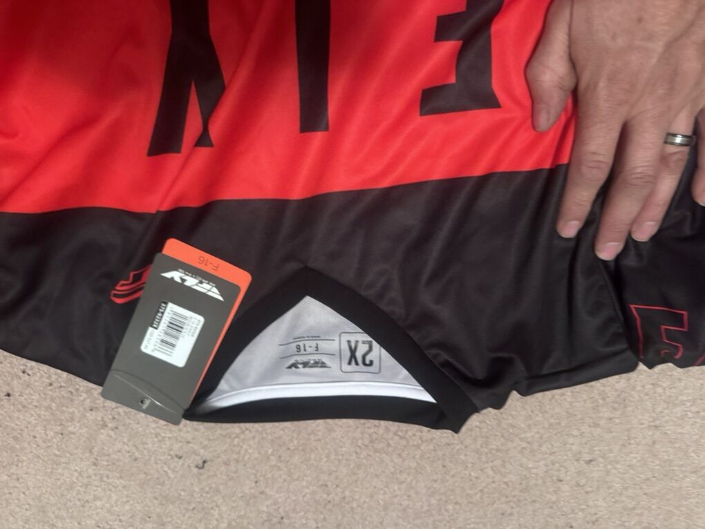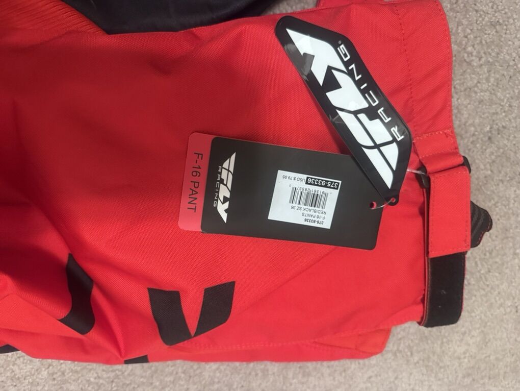 Fox Fly F16 pants sz 36 $100 Fox Fly F16 jersey 2x $33 Rocky Mountain MX socks size 10-13 $10 Fox Titan sport jacket chest protector XL $200 LEATT knee and shin guards L/XL $175 EVS R3 race collar adult $65