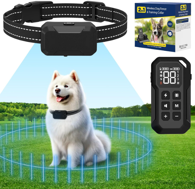 Zelle2 in 1 Wireless dog fence system:The wireless dog fence combines two functions:Wireless dog fence and remote training Collar into one. Our Multional function wireless dog fence system allows you to train your dog to stay in the yard and also train your pet when you are out for outdoor.