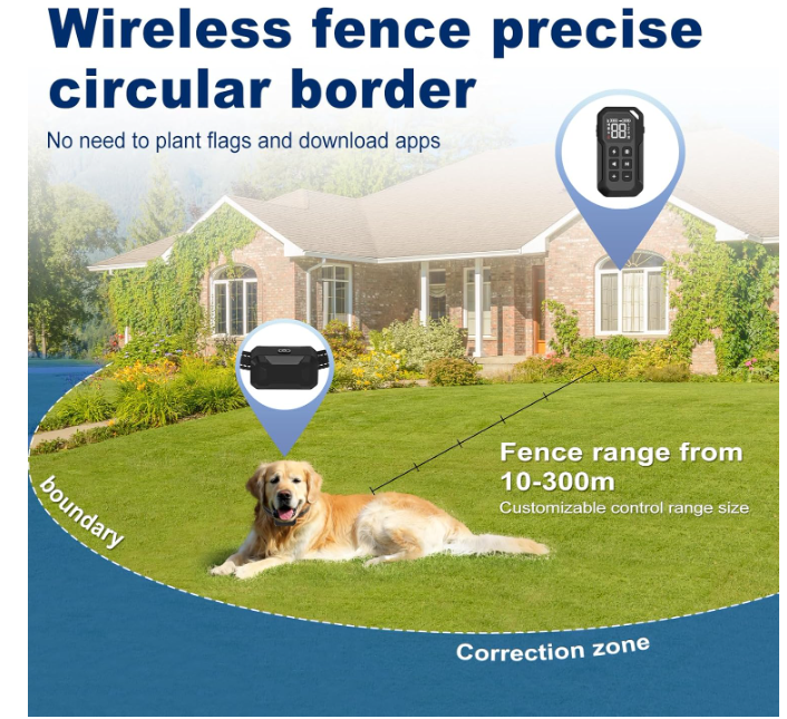 Wireless Dog Fence System Wide Range of Use:The compact design of this wireless dog fence makes it create the boundary for your pet.The wireless dog fence system has 42 levels of range adjustable distance from 10 to 300m.When the dog crosses the set boundary line,the receiver collar automatically emit warning beep,alerting the dog to back away.