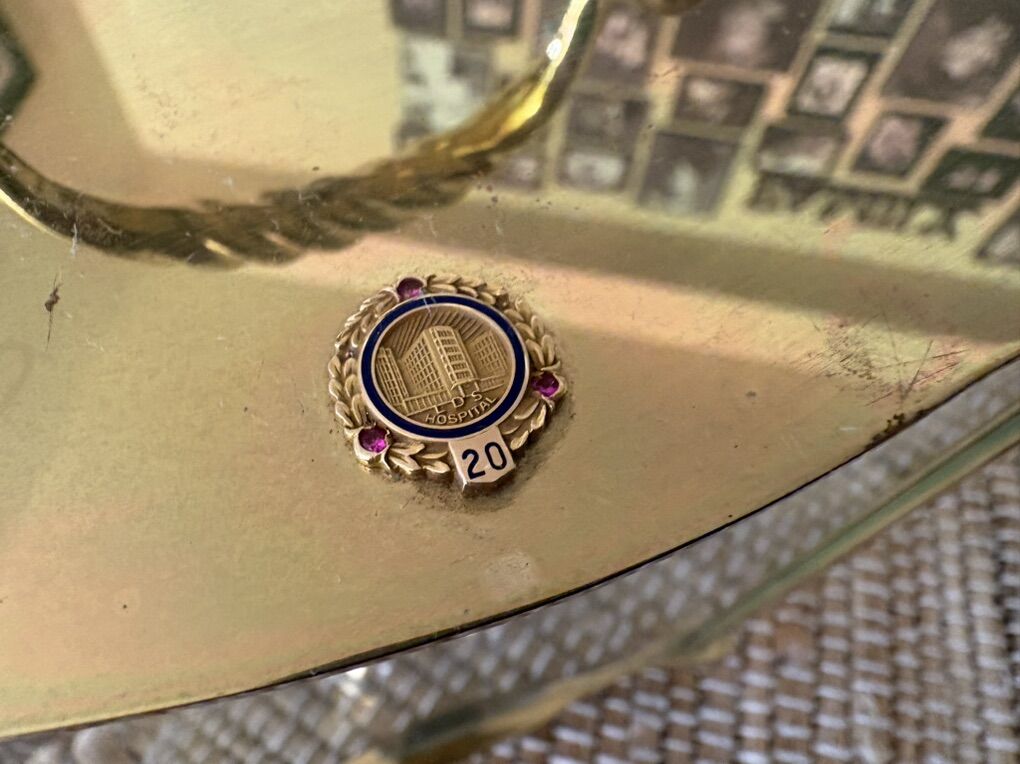 I have a vintage gold or brass Hamilton Anniversary carriage clock. The front glass has small etched designs on the top corners and the sides have larger flower etchings. The face has Roman numerals and says Hamilton and Quartz. It is 7 inches tall not counting the handle, 5 1/2 inches tall and 4 1/2 inches deep. It is in good condition with just a couple of tiny tarnish spots on the top. It has a small circle on the top that says LDS Hospital 20 Years. It’s only noticeable if you get close. I had to zoom in on my phone to see the words. It has a AA battery. It keeps time and still has working spinning pendulums (see the video). See my other ads for jewelry, artwork, home decor and more.